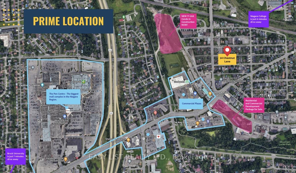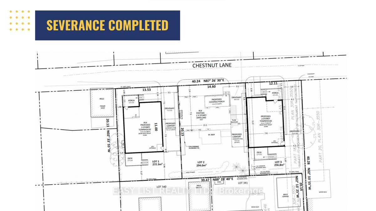 For more info on this property, please click the Brochure button. Exciting development opportunity in the heart of St. Catharines! 14 Chestnut Lane has already been severed into 3 lots - with the existing home on the middle lot - making this an ideal project for builders, investors, or developers. This property presents a unique chance to maximize density and potential long-term returns. Whether you plan to renovate the current home, build new on the side lots, or reimagine the entire site, the groundwork is ready for your vision. Located in a desirable, family-friendly neighborhood close to schools, shopping, and transit, this is a rare find with huge potential. Renderings are pre-construction for example only and not of the actual unit/dwelling