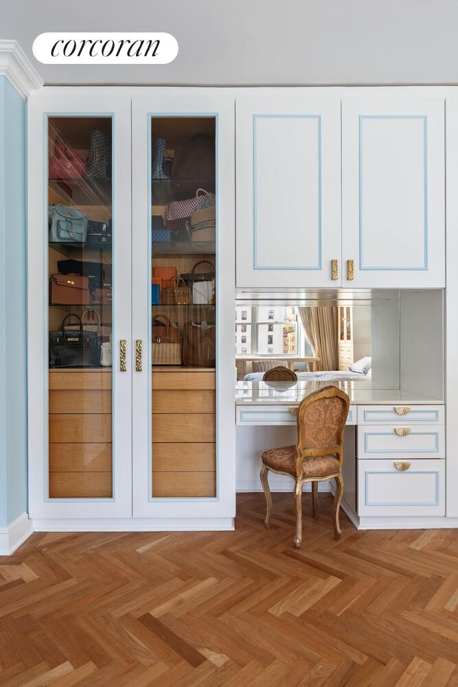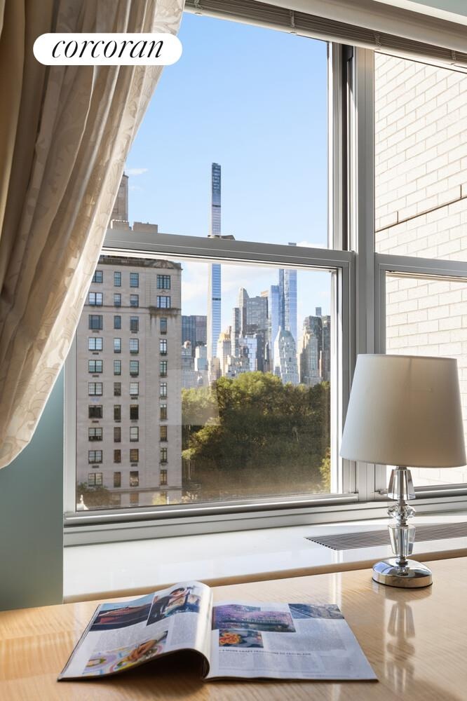 The living room and primary bedroom face southwest and overlook the Frick gardens and Central Park, capturing an ever-changing panorama of the city-from golden sunsets over the trees to the twinkling lights of Midtown.
