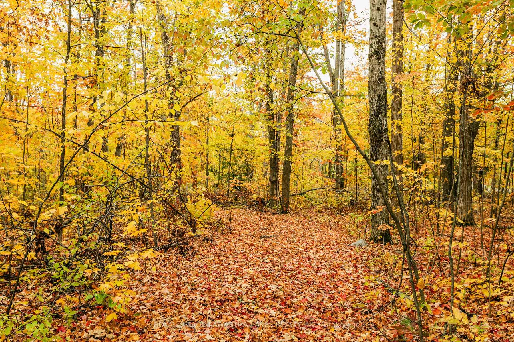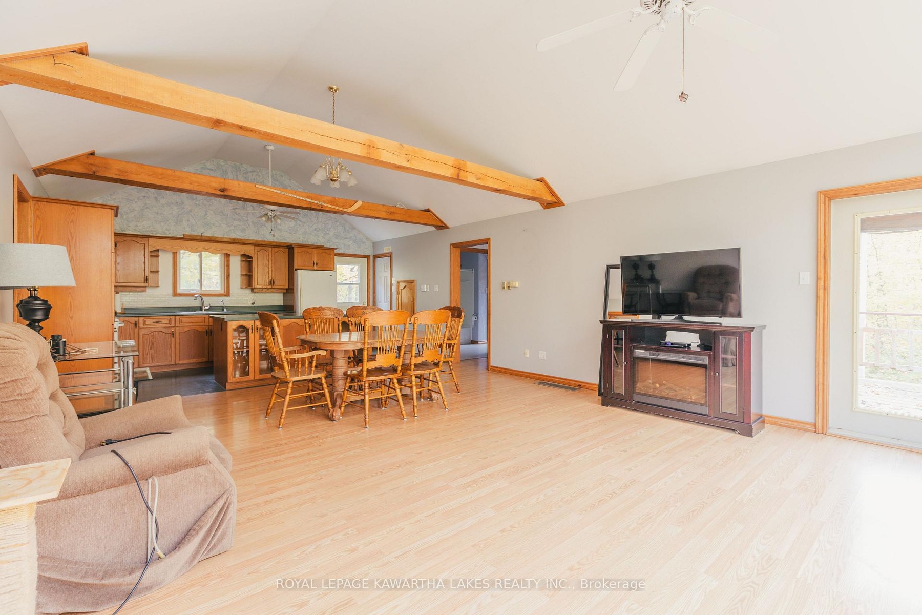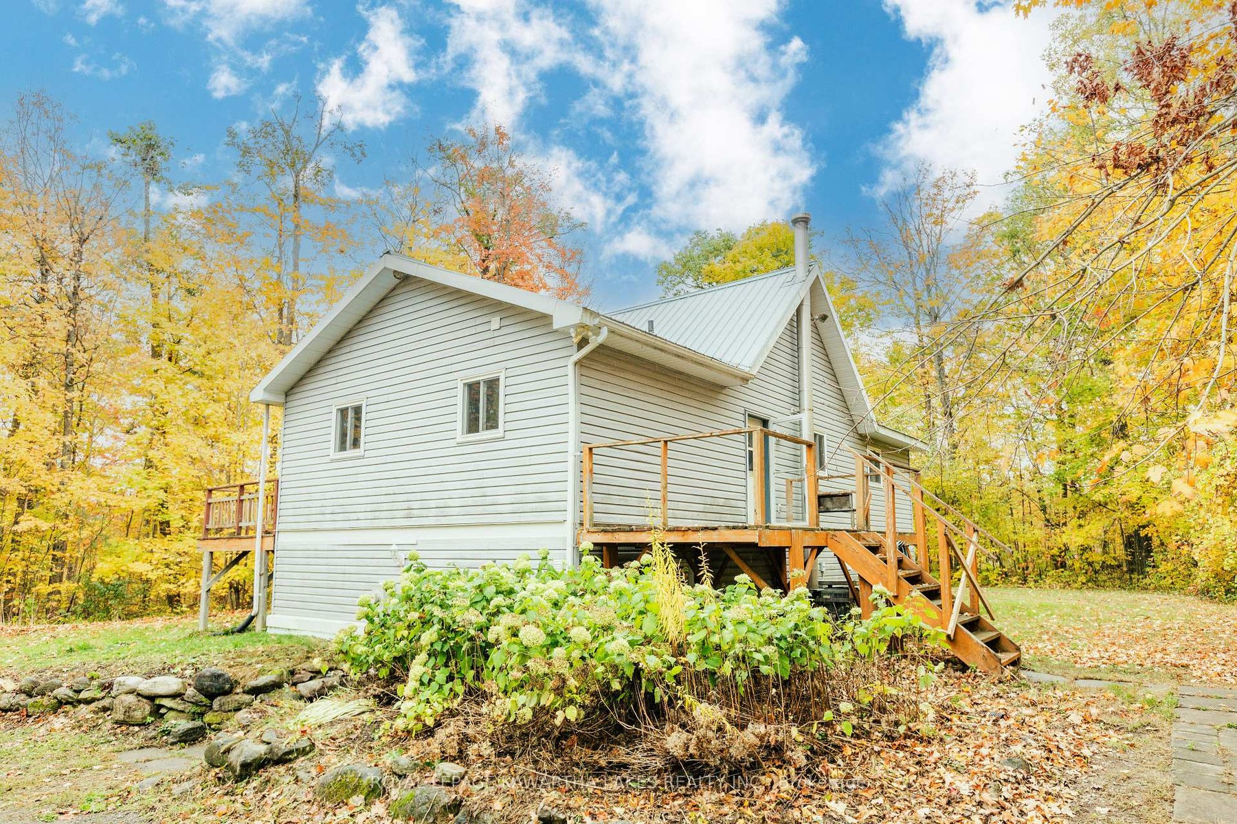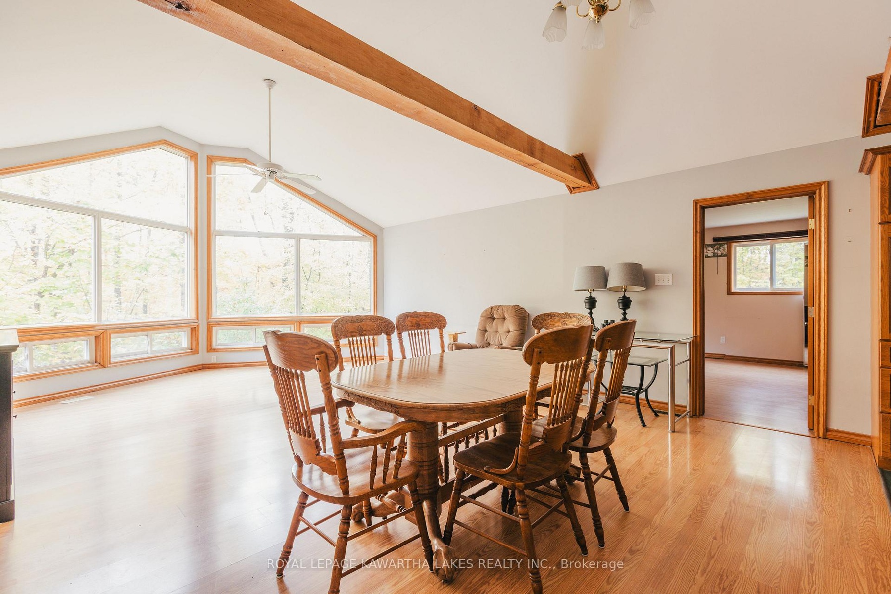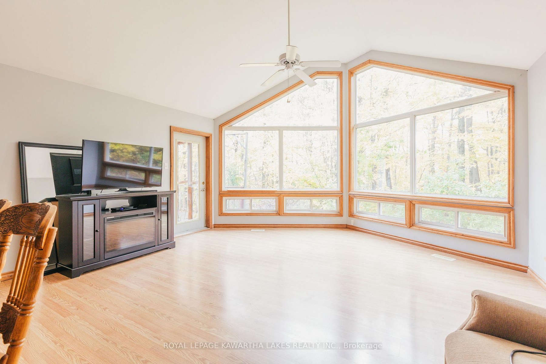 Nestled in a lush, private 2 acre forest, this 1200 sqft raised bungalow offers tranquility and natural beauty, often with deer grazing right on the front lawn. The open concept main living space features vaulted ceilings and a stunning wall of windows that frame the surrounding trees. The master bedroom includes a walk in closet and ensuite, while the second bedroom is located on the opposite end of the home, next to a second full bath with laundry. The partially finished walkout basement has a spacious rec room (or potential third bedroom), a 2pc bath, and generous storage rooms. An electric dumbwaiter transports groceries from the foyer up to the kitchen. Outside there is a 25' x 35' workshop, tool shed, and firewood shed. Drilled well, steel roof, fibre optic internet available, and just down the road a boat launch to beautiful Balsam Lake. Built in aprx 1998.
