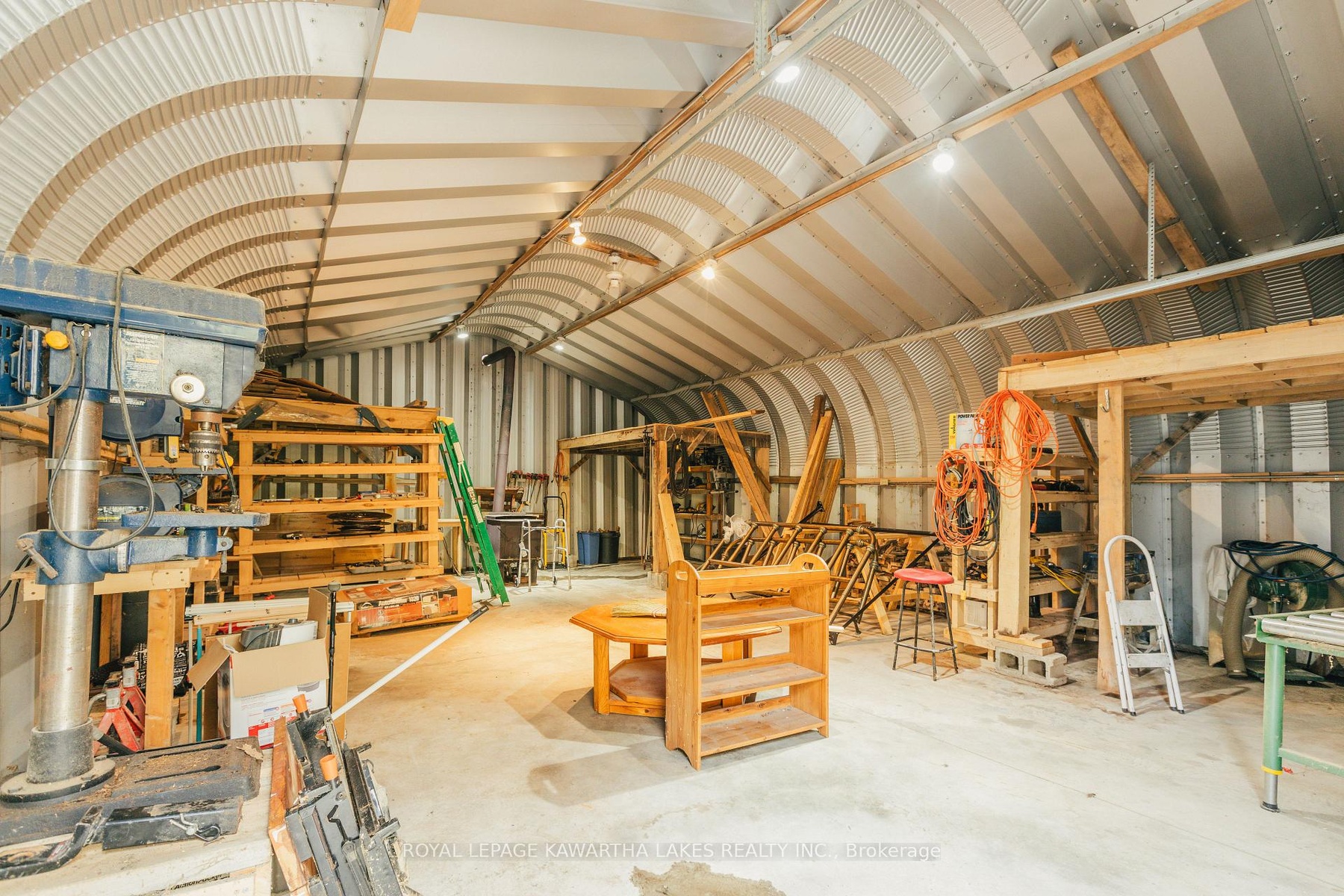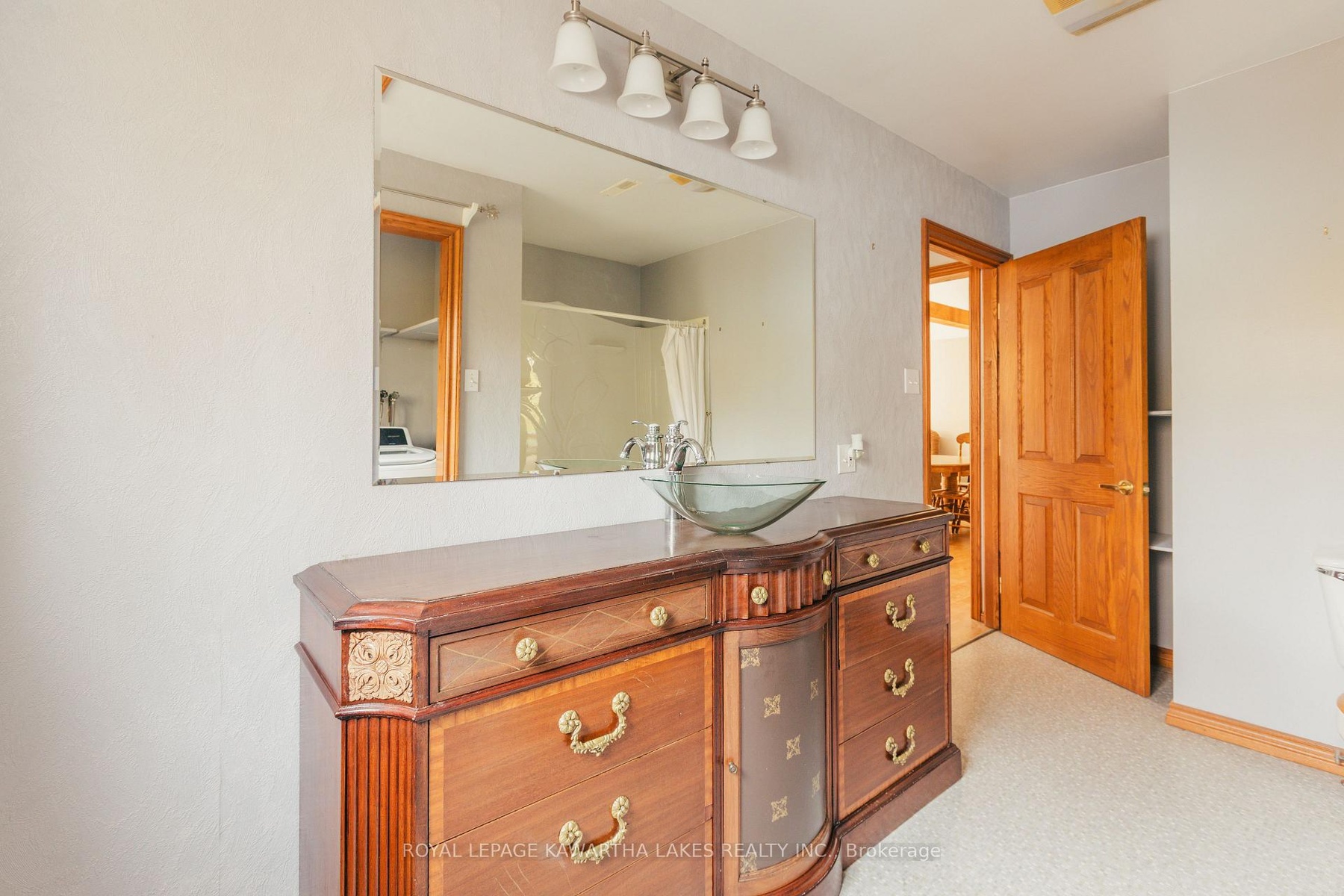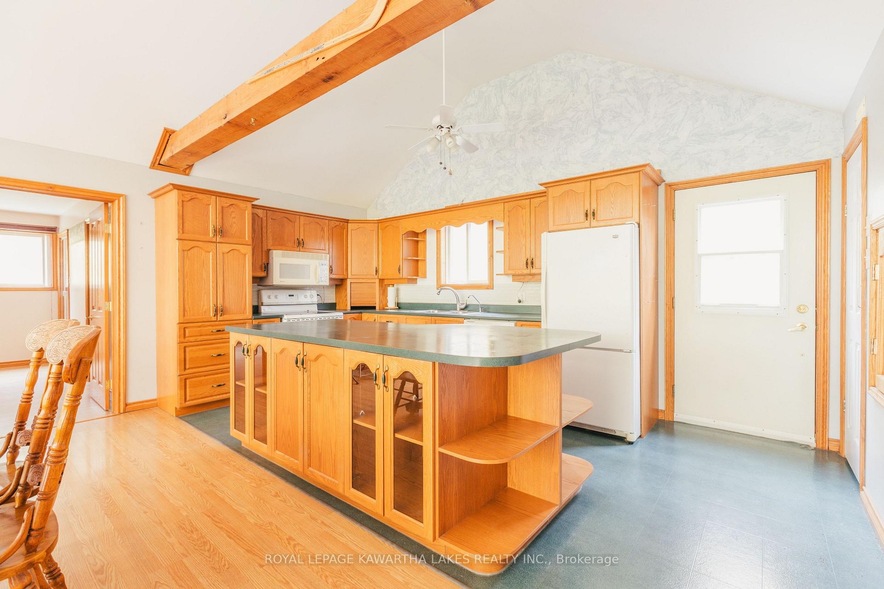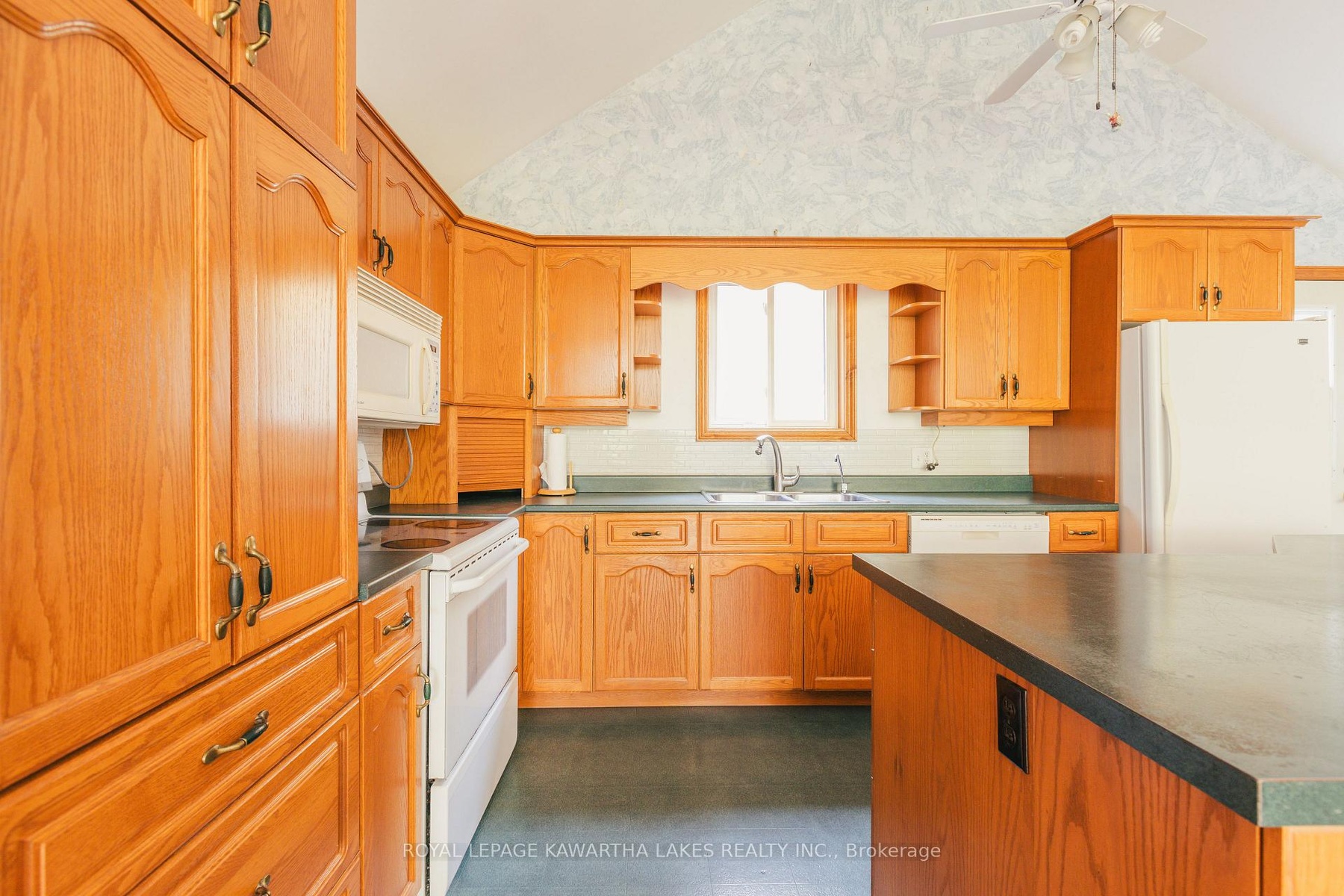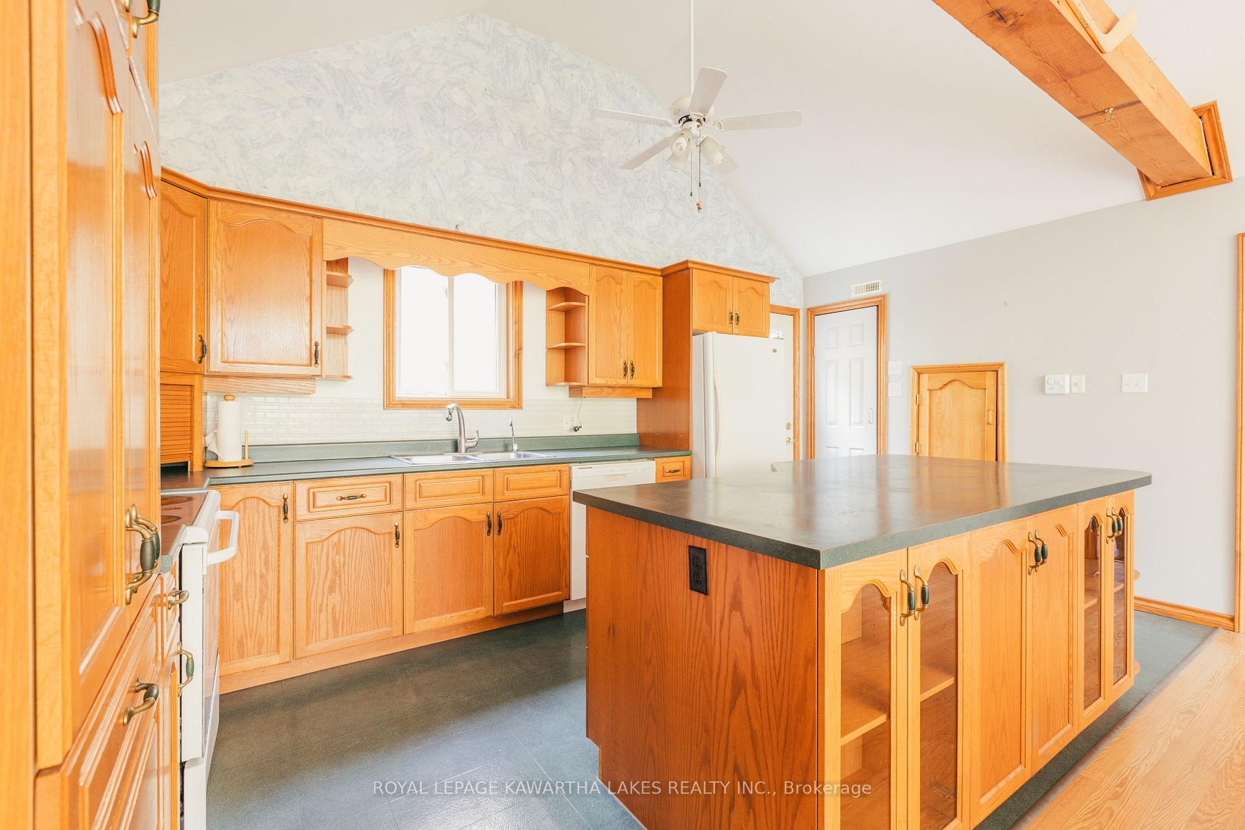 Nestled in a lush, private 2 acre forest, this 1200 sqft raised bungalow offers tranquility and natural beauty, often with deer grazing right on the front lawn. The open concept main living space features vaulted ceilings and a stunning wall of windows that frame the surrounding trees. The master bedroom includes a walk in closet and ensuite, while the second bedroom is located on the opposite end of the home, next to a second full bath with laundry. The partially finished walkout basement has a spacious rec room (or potential third bedroom), a 2pc bath, and generous storage rooms. An electric dumbwaiter transports groceries from the foyer up to the kitchen. Outside there is a 25' x 35' workshop, tool shed, and firewood shed. Drilled well, steel roof, fibre optic internet available, and just down the road a boat launch to beautiful Balsam Lake. Built in aprx 1998.