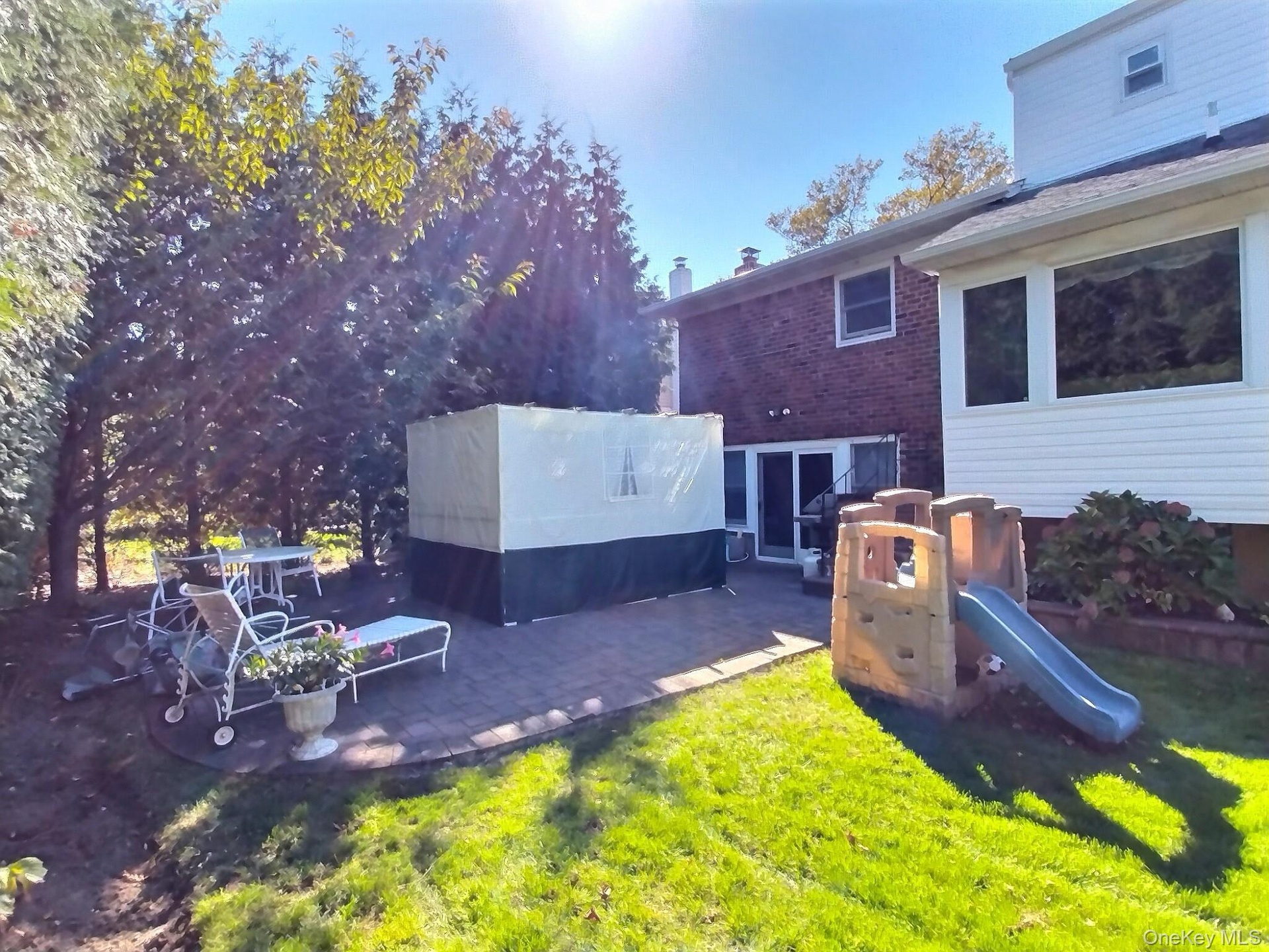 Additional highlights include Andersen windows, central AC, gas water heater, in-ground sprinklers, a central alarm system, and a beautiful backyard featuring both a large patio and lush grassy area.