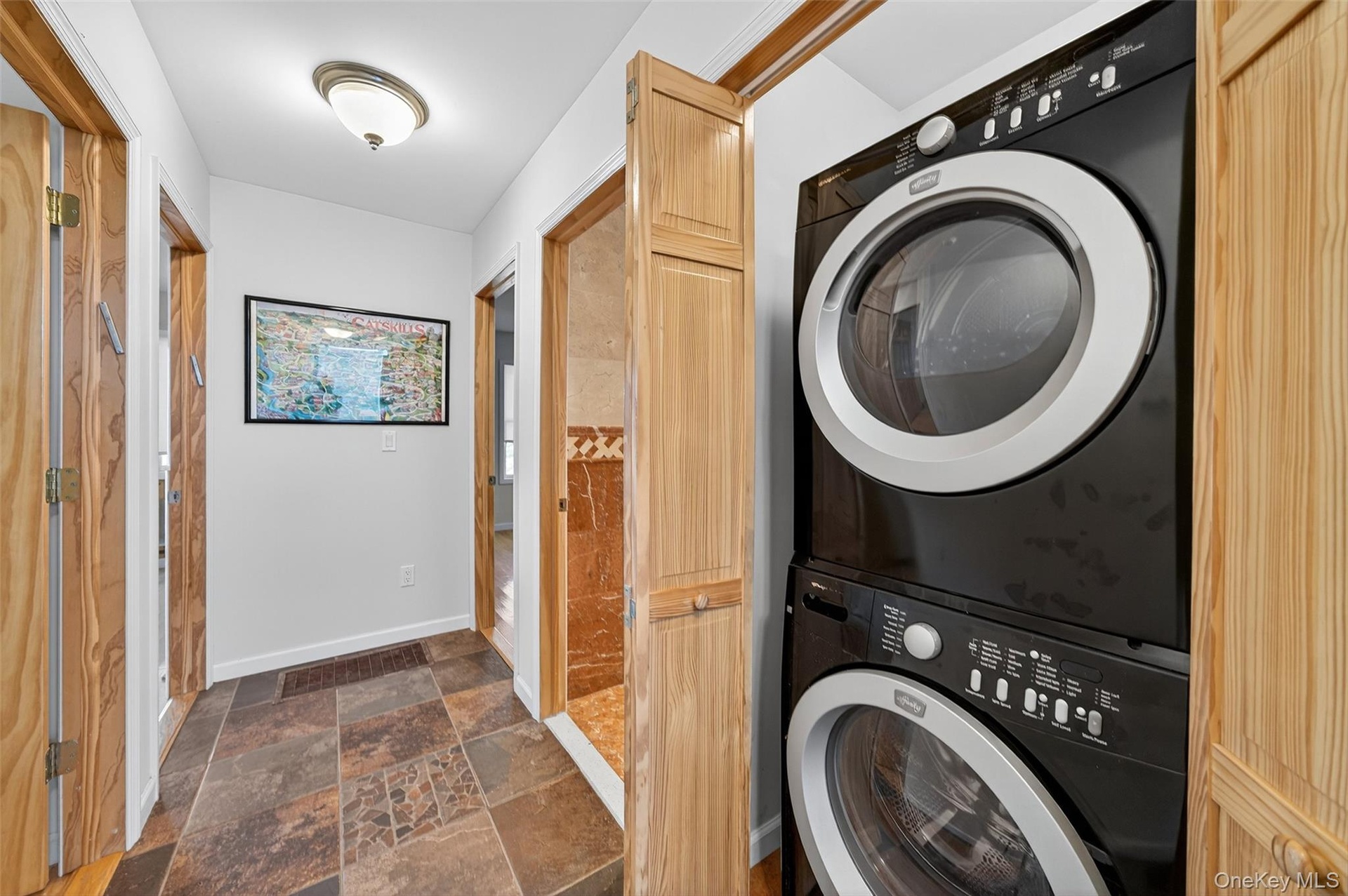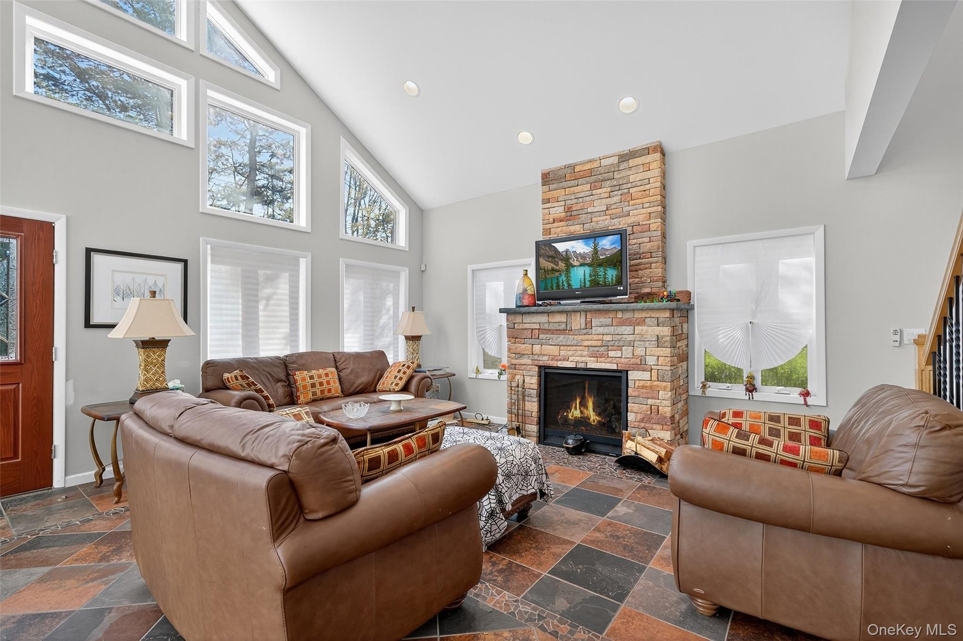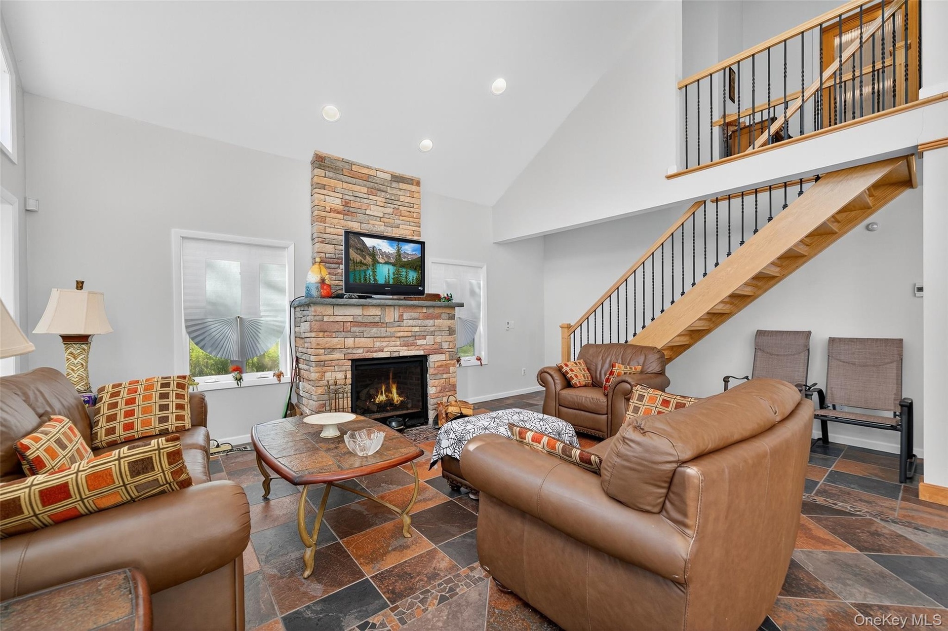 The main level features soaring ceilings above the great room, with tons of windows flooding the space with natural light. The kitchen has stainless-steel appliances, granite countertops, a breakfast bar with seating, and a pantry closet. The dining area can accommodate a large table, and the living room offers a stone fireplace. There are two bedrooms on this level, as well as a guest room with access out to the back deck. The full bathroom has a walk-in shower and there is a laundry closet in the hallway.