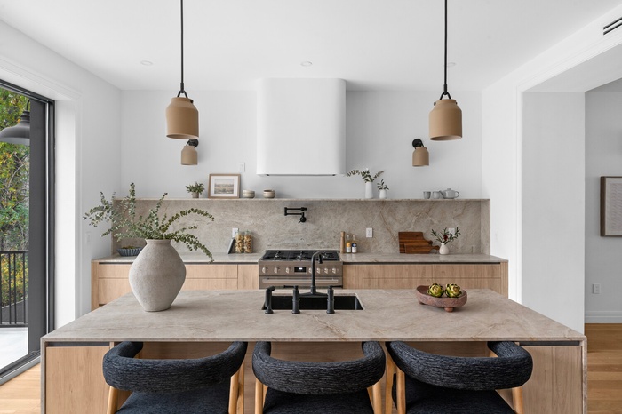 At the heart of the home, a chef-caliber kitchen invites elevated culinary experiences. Anchored by a dramatic Taj Mahal quartzite island and illuminated by sculptural pendant lighting, the space is equipped with a premium Bosch appliance suite, including a 6-burner range, dishwasher, wine refrigerator, and a sleek pot filler. Custom cabinetry and bespoke finishes elevate both functionality and form. Full-height glass doors along the rear facade open onto a 135-square-foot bluestone terrace, offering effortless flow for indoor-outdoor dining and sun-drenched relaxation.