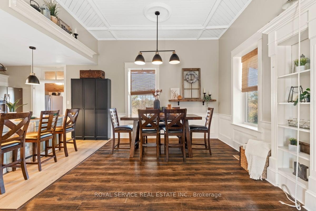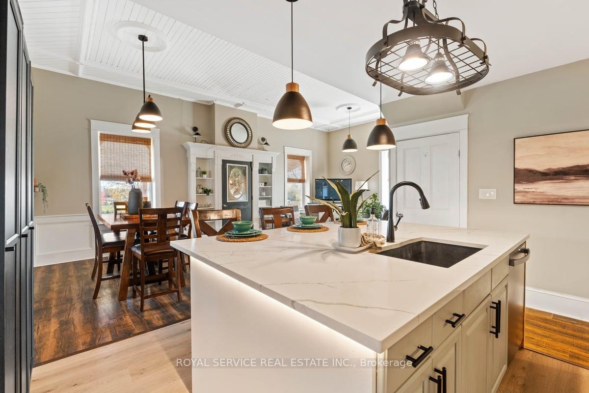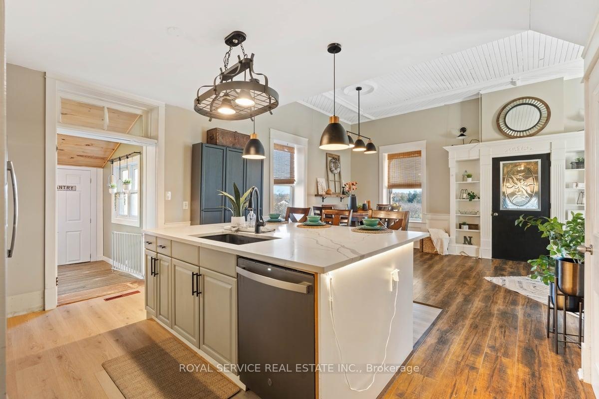 Historic Schoolhouse Turned Dream Home! Built in 1904, Harold School S.S. No. 14 has been beautifully transformed into a truly unique residence. From the original school bell still resting in the belfry to the character-filled hardwood floors, history is alive here - yet perfectly balanced with thoughtful modern updates. A recently built gorgeous covered front porch enhances the exterior and offers the ideal spot for morning coffee or evening drinks in a peaceful country setting where you can often watch the neighbours pass by in their horse-drawn buggies. Step inside to soaring 11' ceilings and oversized windows that flood the open living and dining areas with natural light. The updated kitchen boasts a massive quartz island designed for entertaining, leading seamlessly to a large bright pantry with a walkout to a 12' x 12' deck. The main floor also features a 4-piece bath with soaker tub, two spacious bedrooms, and convenient laundry. Upstairs, in the loft, a private suite awaits with skylights, stunning inlay hardwood floors, a 2-piece ensuite, and walk-in closet. The lower level expands your living space with a freshly painted rec room, office, and plenty of storage. Outside, a 24' x 30' insulated garage (built in 2020) with hydro, 10' ceilings, woodstove, and lean-to delivers incredible versatility for hobbies, storage, or workshop use. With modern upgrades, efficient utilities, and high-speed internet, this rare offering blends historic charm with everyday comfort in a welcoming country setting.