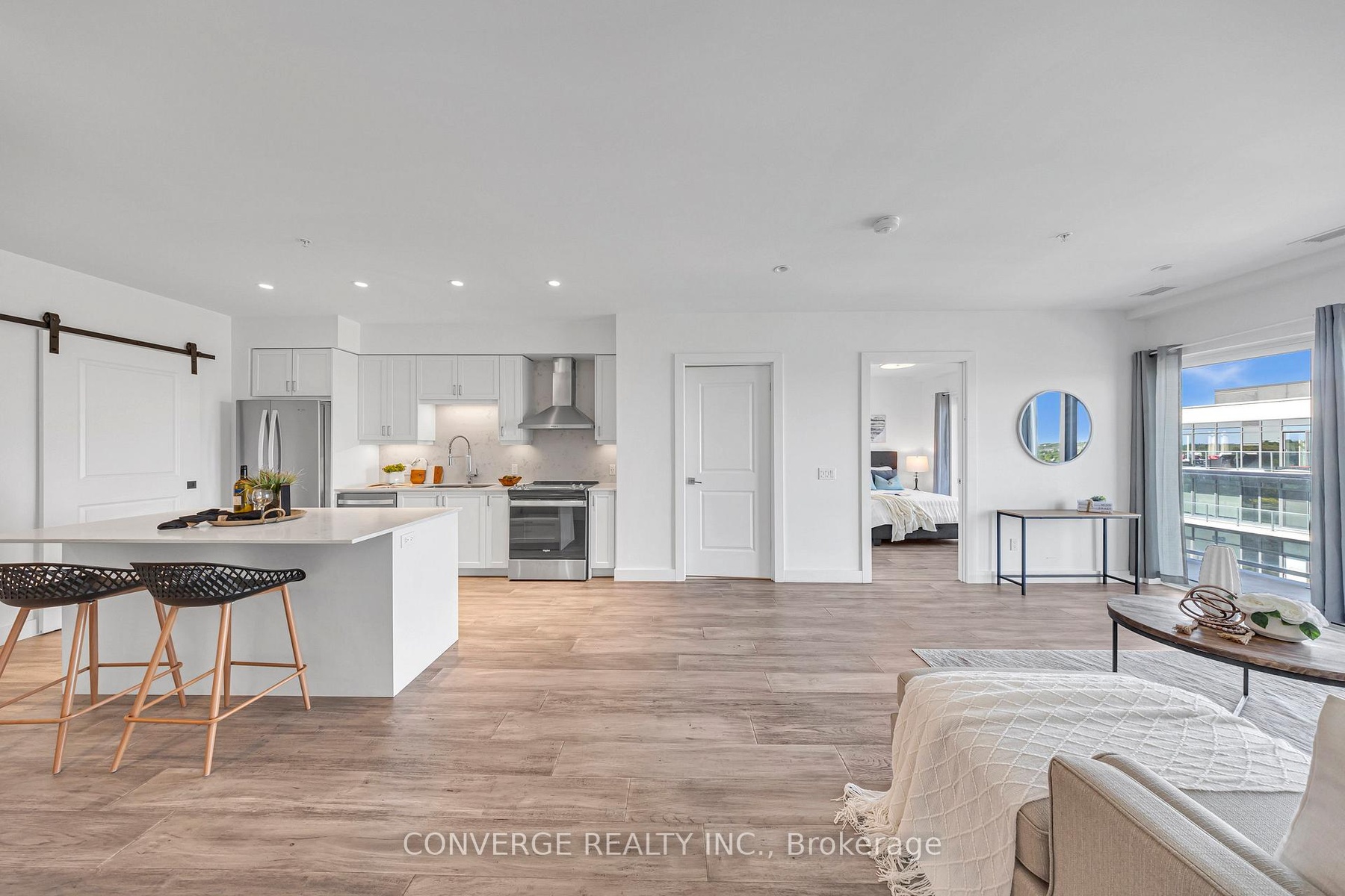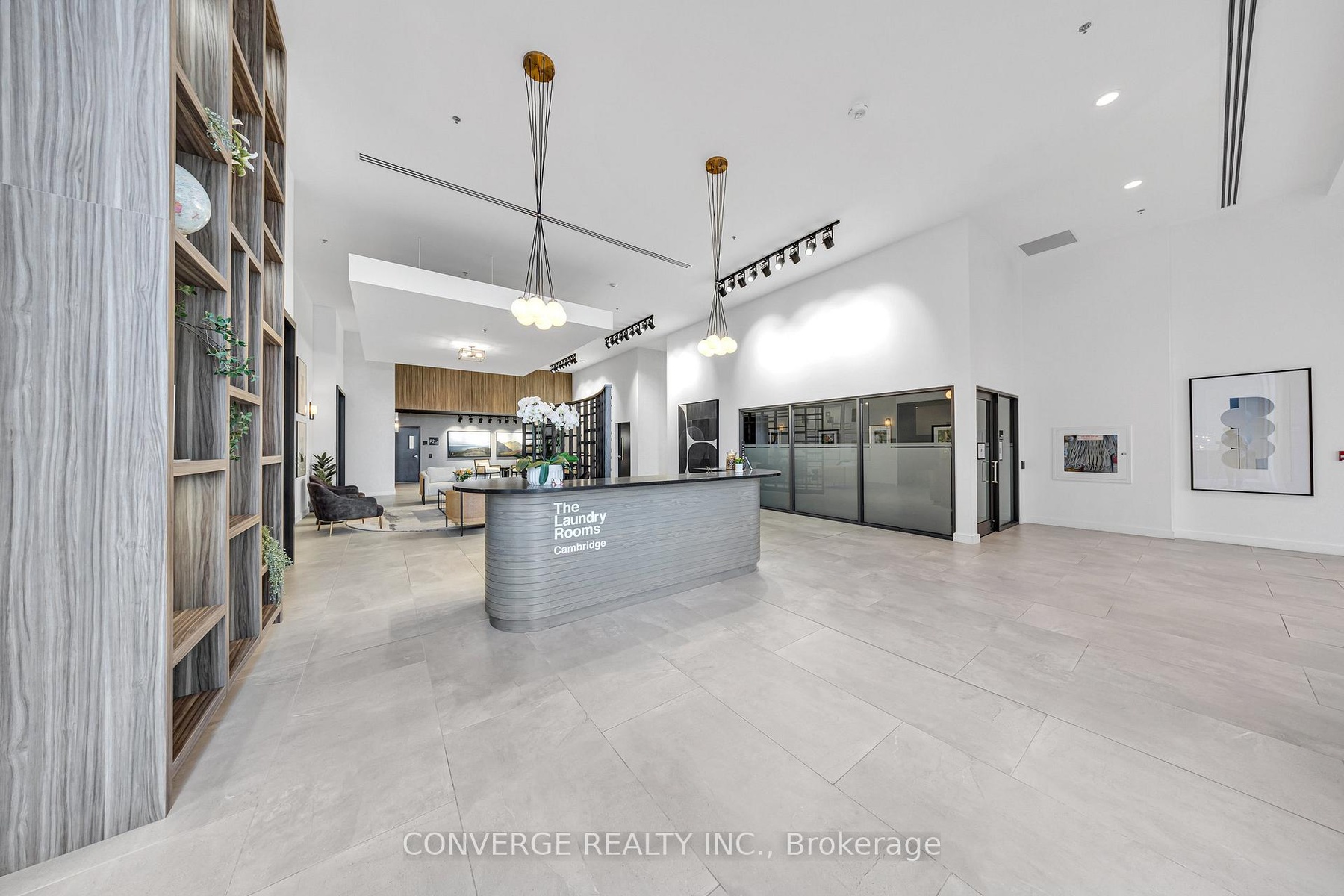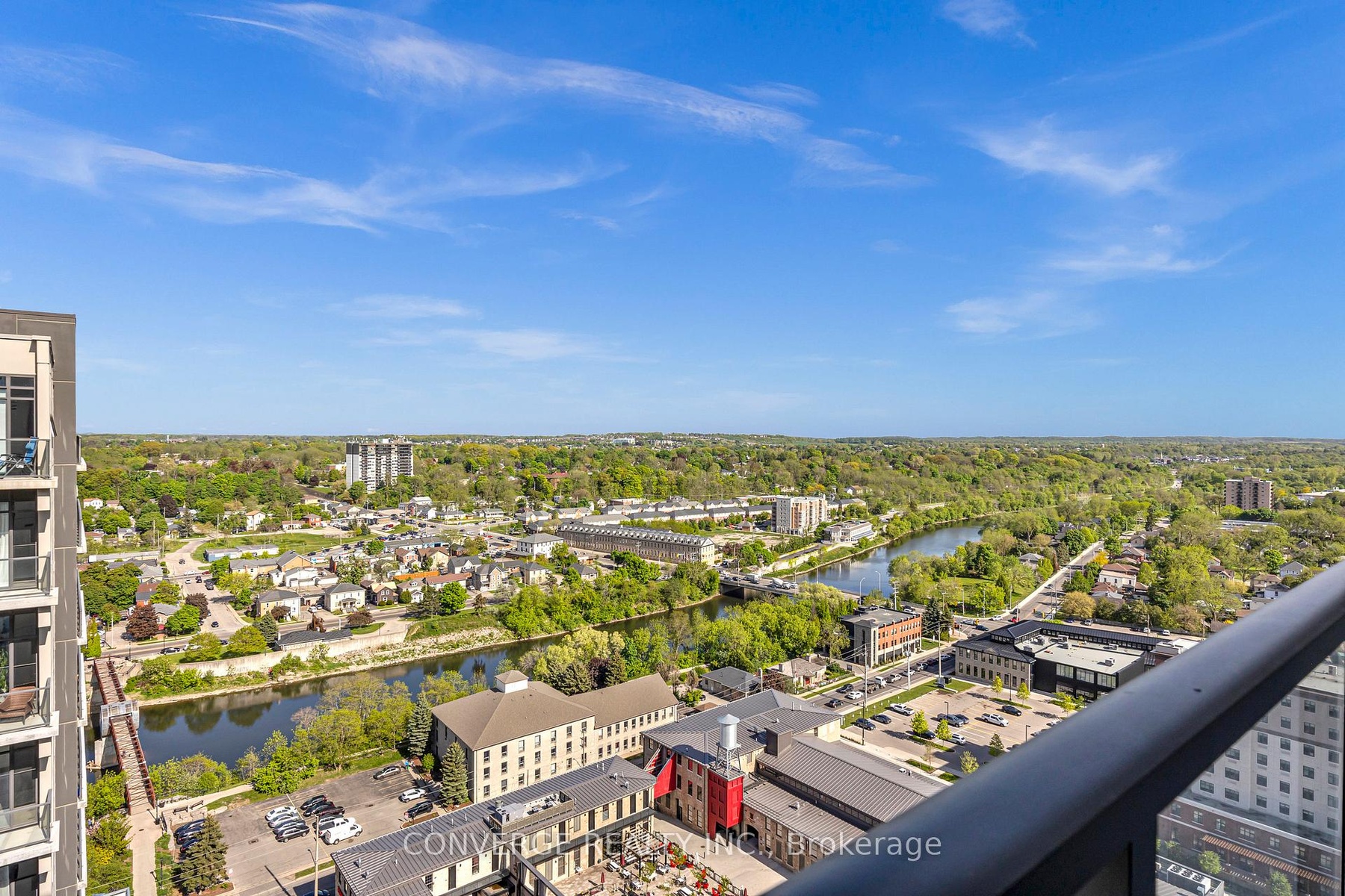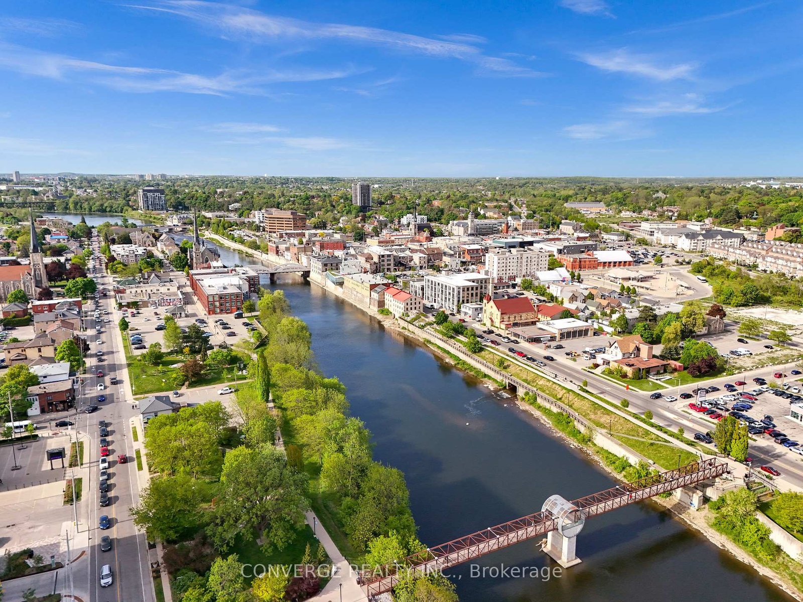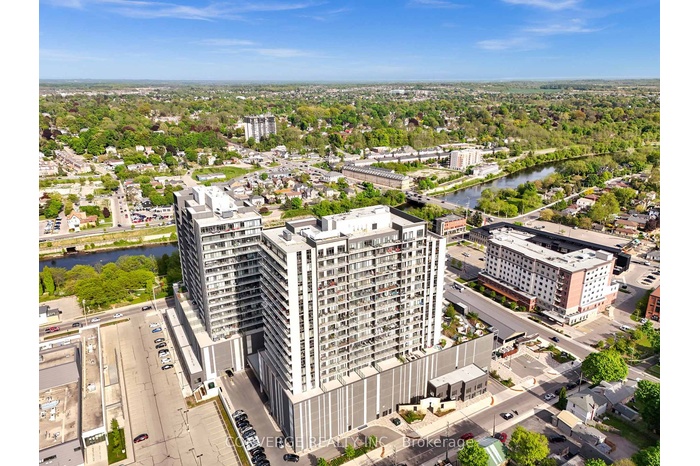 LOWER PENTHOUSE UNIT located in the vibrant Gaslight District of downtown Galt. This dynamic community blends residential living with commercial, retail, culinary, and artistic experiences. The 2-bedroom, 2-bathroom unit lies just beneath the penthouse and boasts 9-foot ceilings, wide plank flooring, and upscale finishes with views of the Grand River. The modern kitchen features sleek cabinetry, quartz counters, a tile backsplash, stainless steel appliances, and an oversized island. The primary suite offers a walk-in closet, balcony access, and a luxurious ensuite with a walk-in shower. A second bedroom, complete with floor-to-ceiling windows, its own balcony access, and a full bathroom, rounds out the space. Residents enjoy a wealth of amenities including a welcoming lobby, fitness center, games room, catering kitchen, private dining area, and a library. Outdoors, the expansive terrace includes pergolas, fire pits, and a BBQ area perfect for outdoor relaxation or entertaining guests.