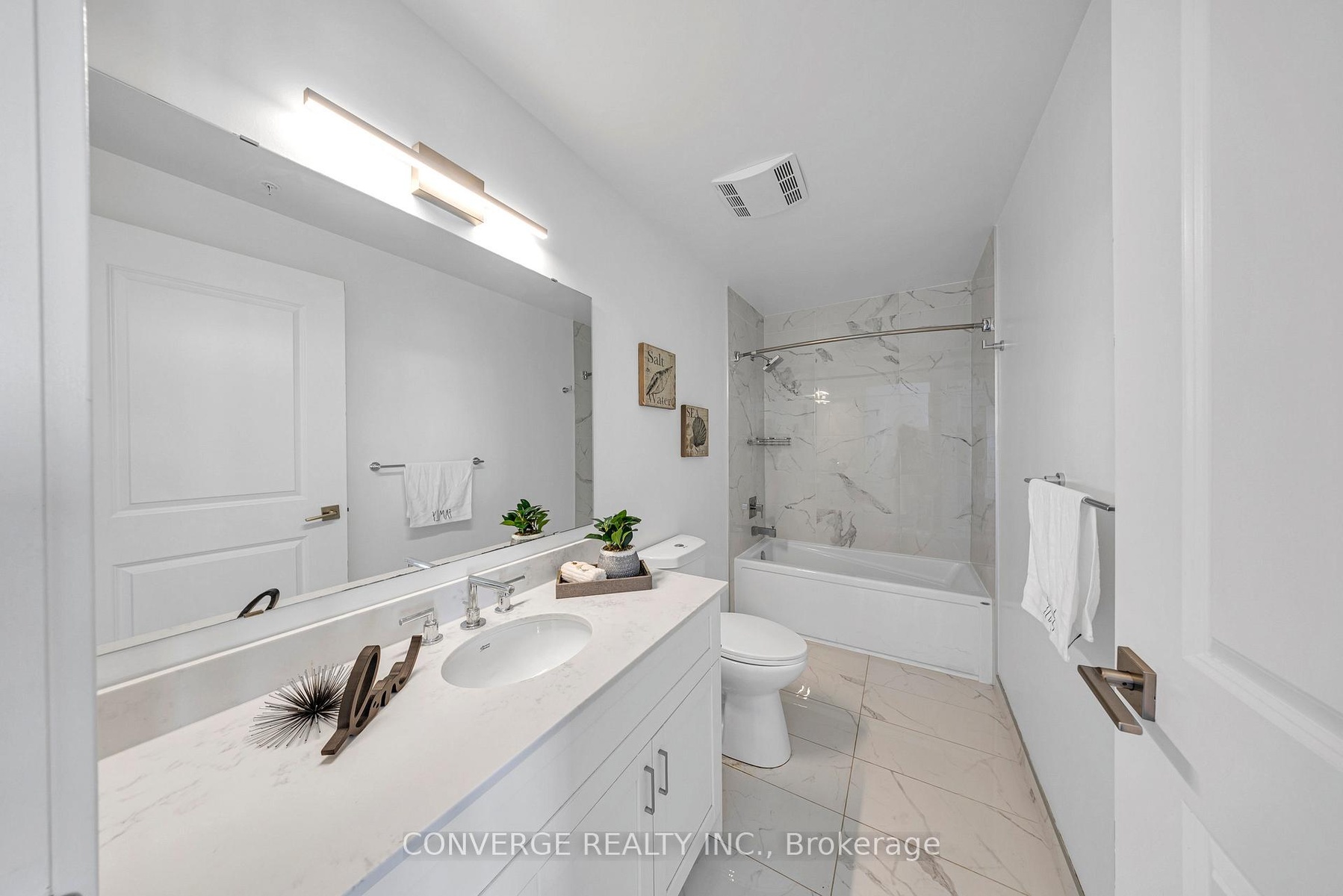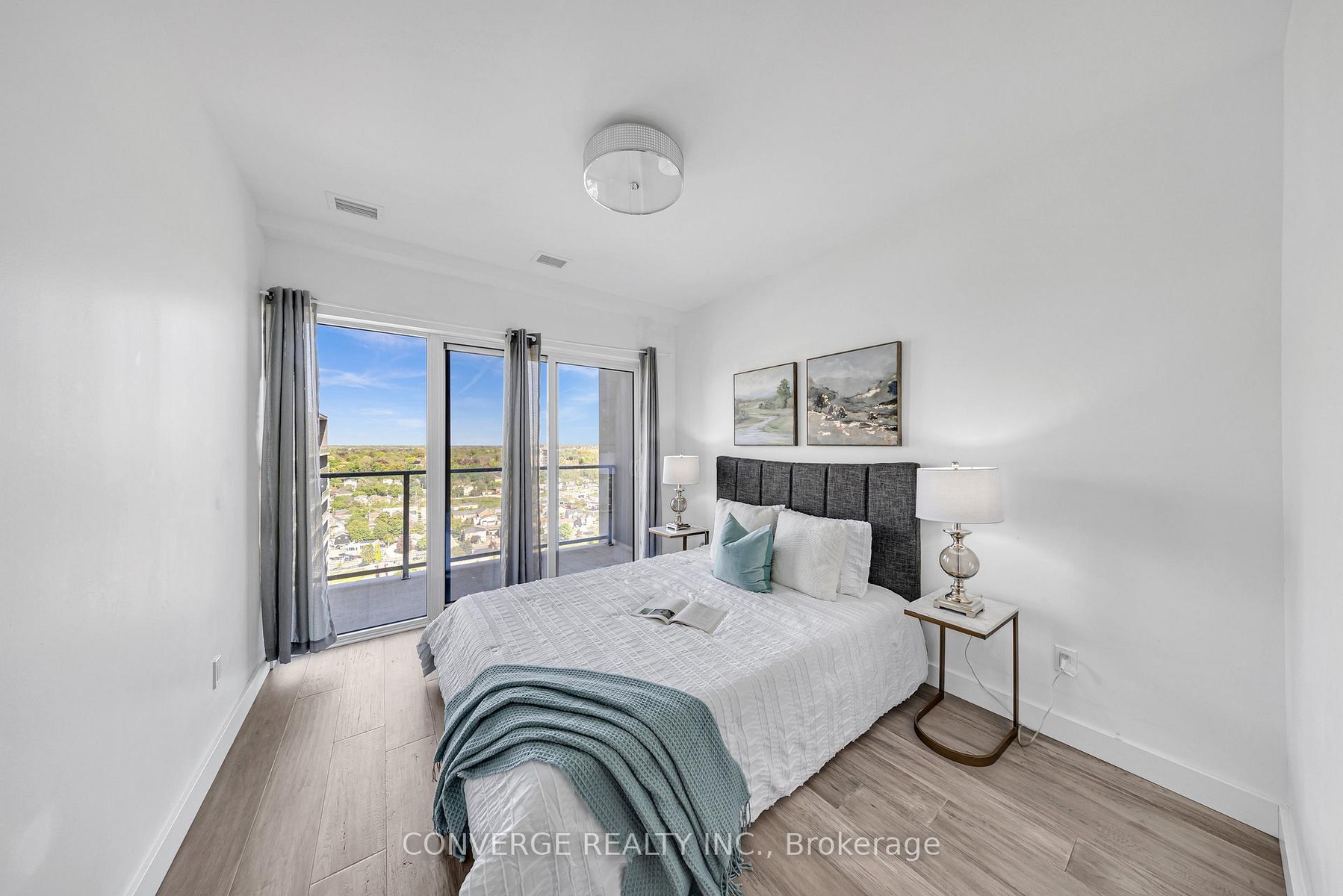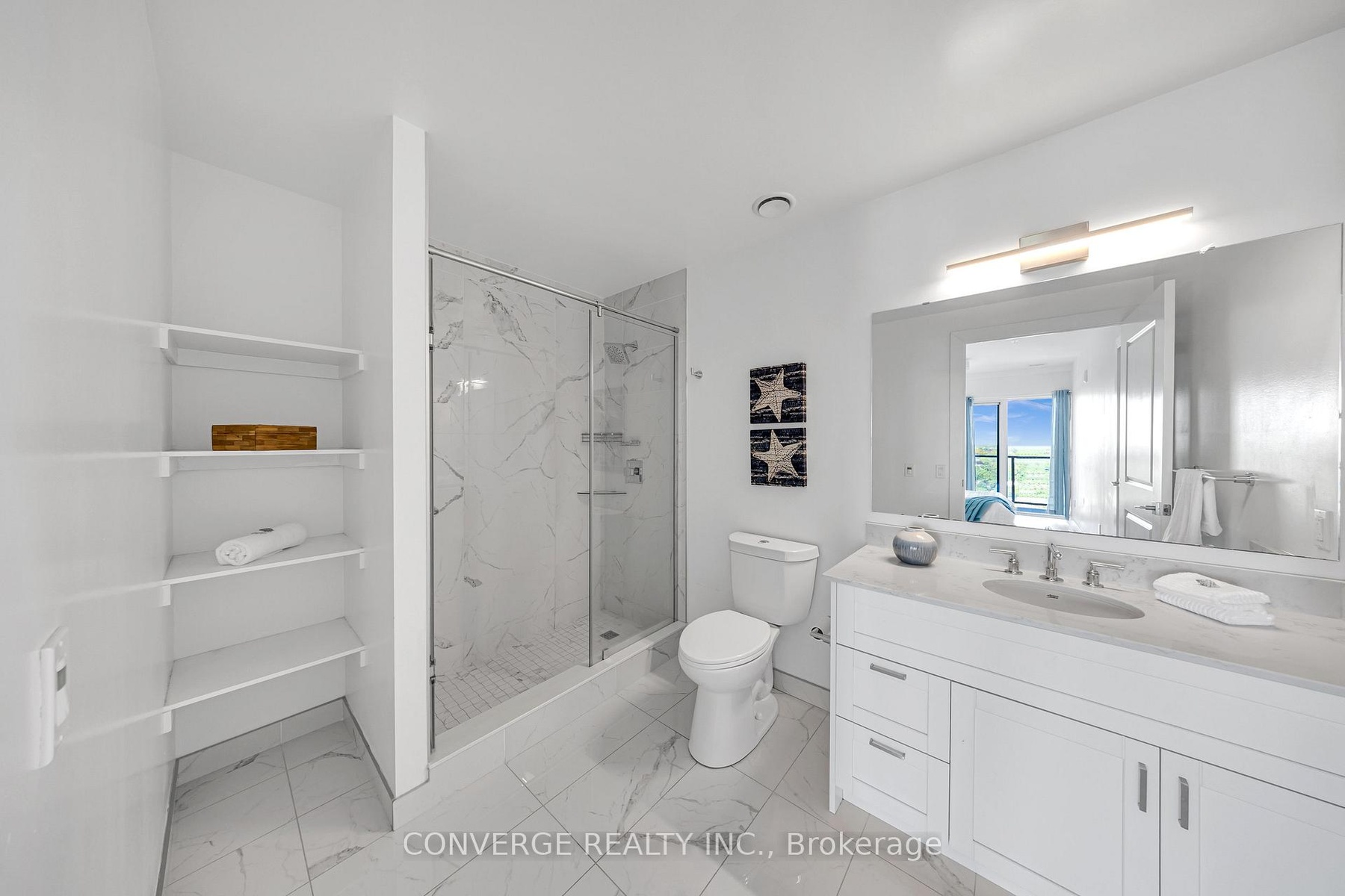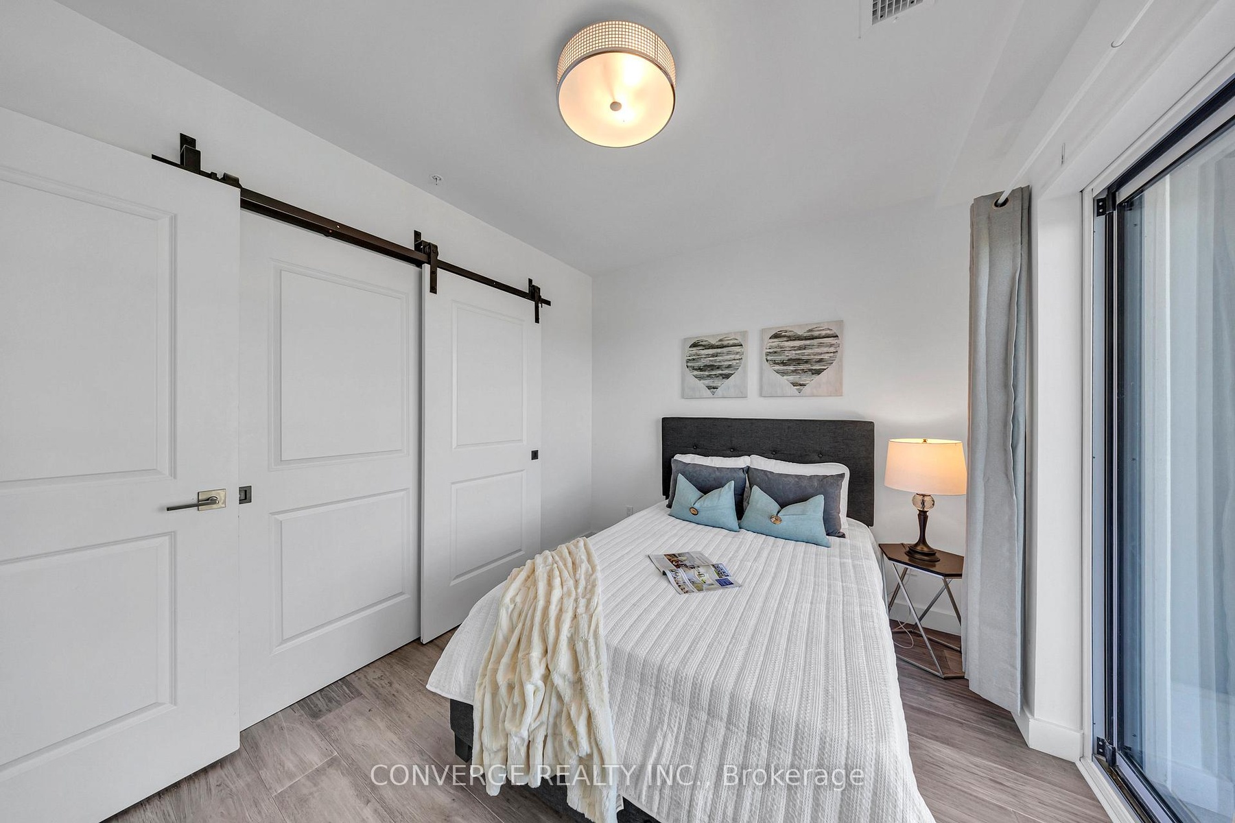 LOWER PENTHOUSE UNIT located in the vibrant Gaslight District of downtown Galt. This dynamic community blends residential living with commercial, retail, culinary, and artistic experiences. The 2-bedroom, 2-bathroom unit lies just beneath the penthouse and boasts 9-foot ceilings, wide plank flooring, and upscale finishes with views of the Grand River. The modern kitchen features sleek cabinetry, quartz counters, a tile backsplash, stainless steel appliances, and an oversized island. The primary suite offers a walk-in closet, balcony access, and a luxurious ensuite with a walk-in shower. A second bedroom, complete with floor-to-ceiling windows, its own balcony access, and a full bathroom, rounds out the space. Residents enjoy a wealth of amenities including a welcoming lobby, fitness center, games room, catering kitchen, private dining area, and a library. Outdoors, the expansive terrace includes pergolas, fire pits, and a BBQ area perfect for outdoor relaxation or entertaining guests.