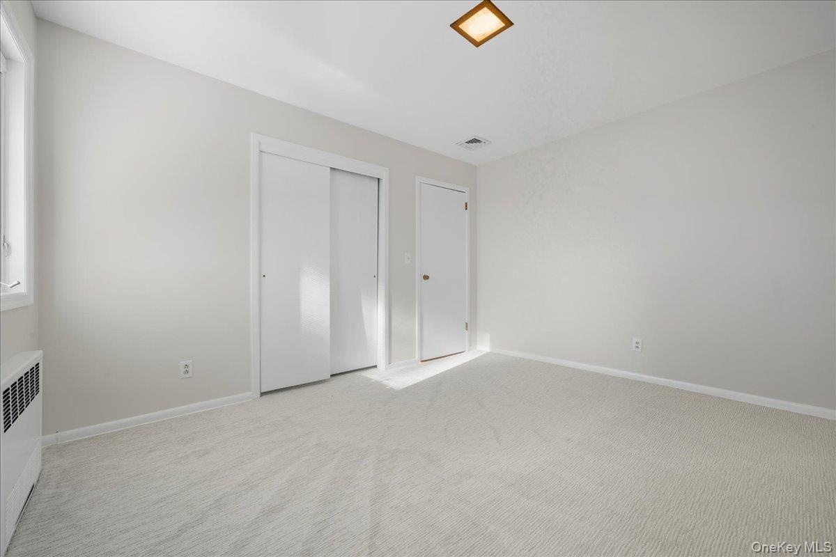 - Unfurnished bedroom with light colored carpet, radiator heating unit, and a closet