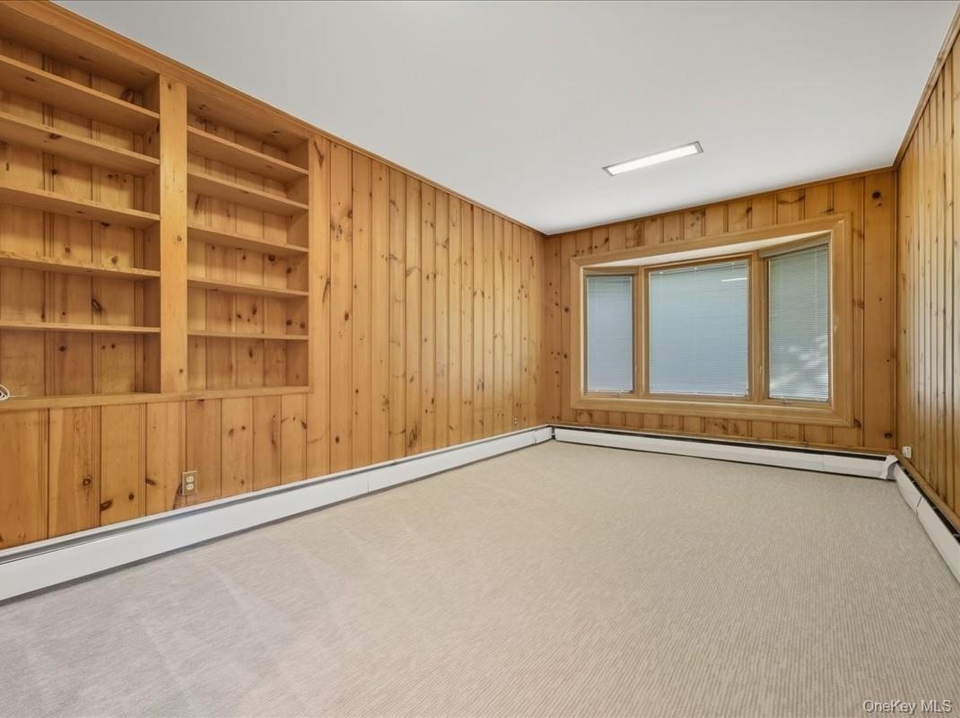 - Spare room with wooden walls, carpet flooring, built in features, and baseboard heating