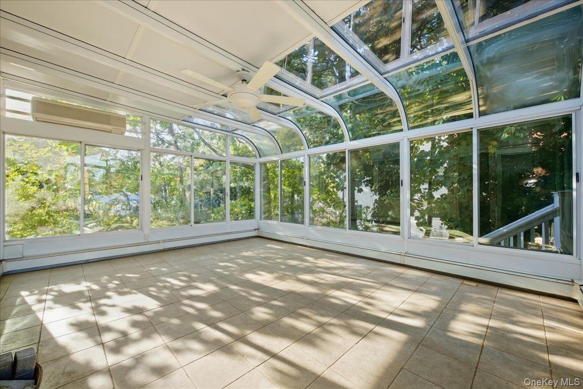 - Unfurnished sunroom with a ceiling fan, a wall unit AC, and baseboard heating