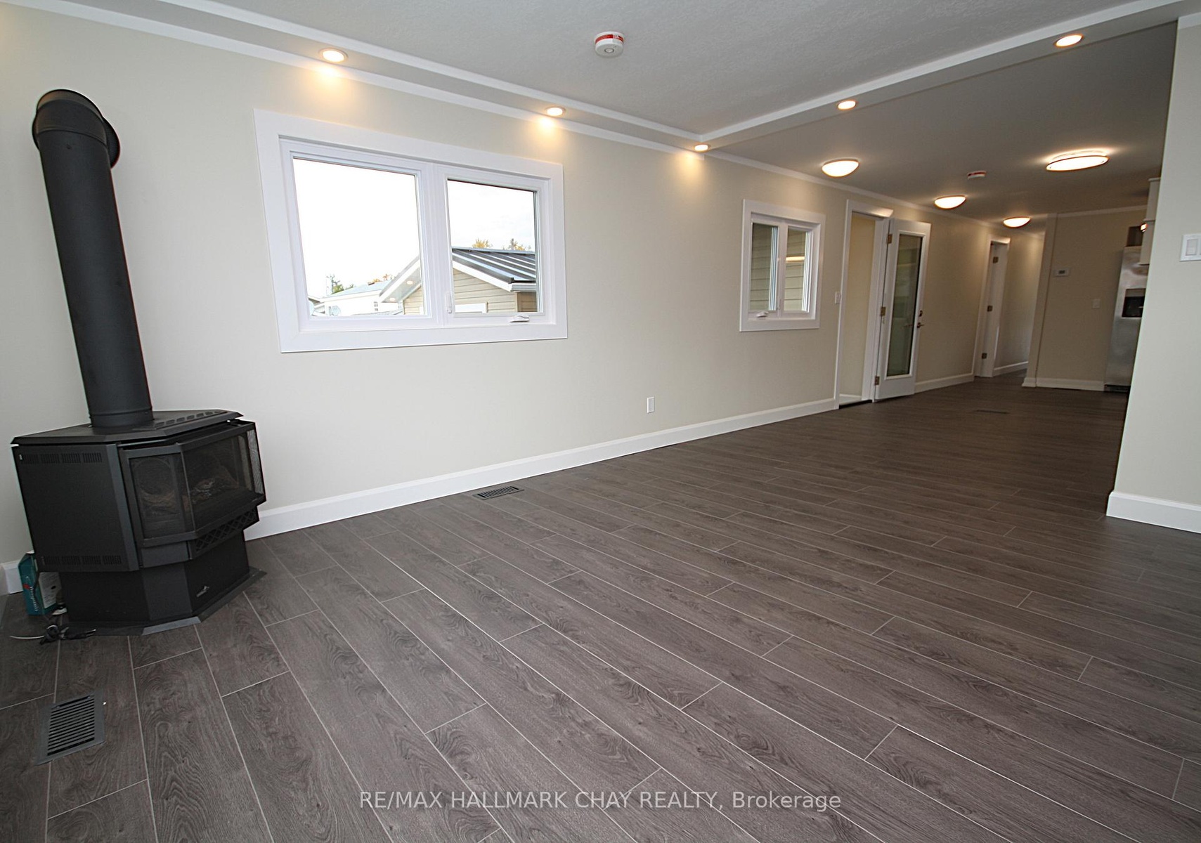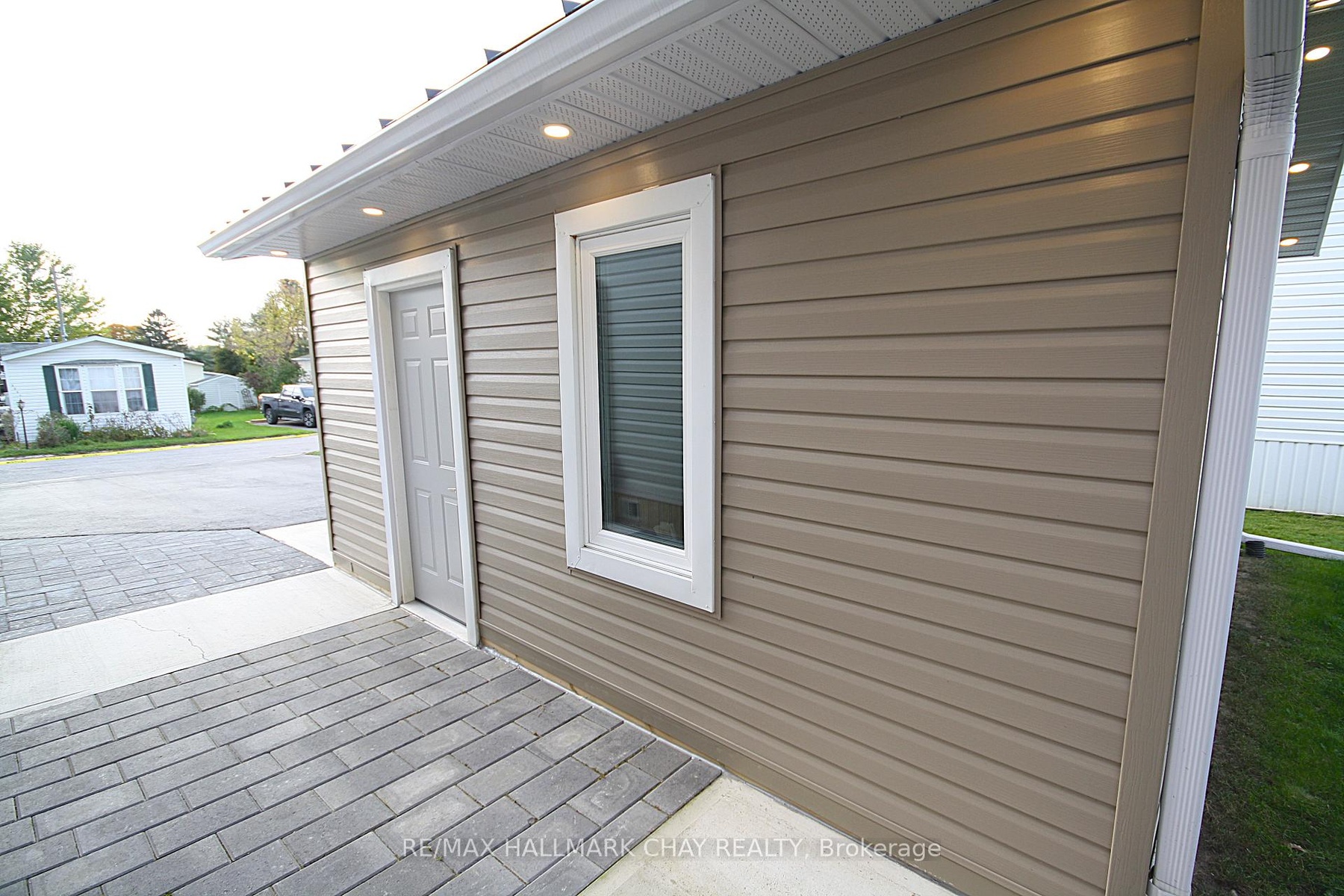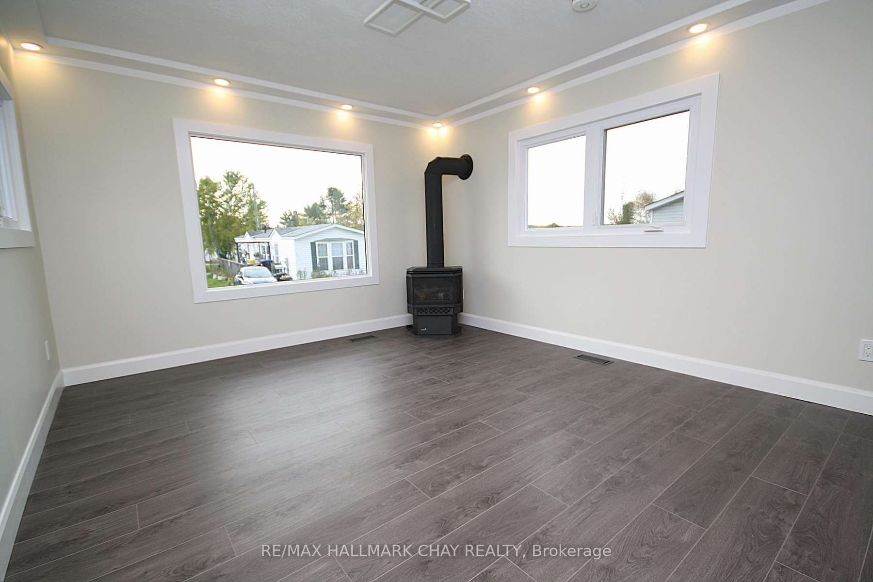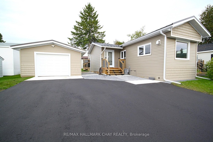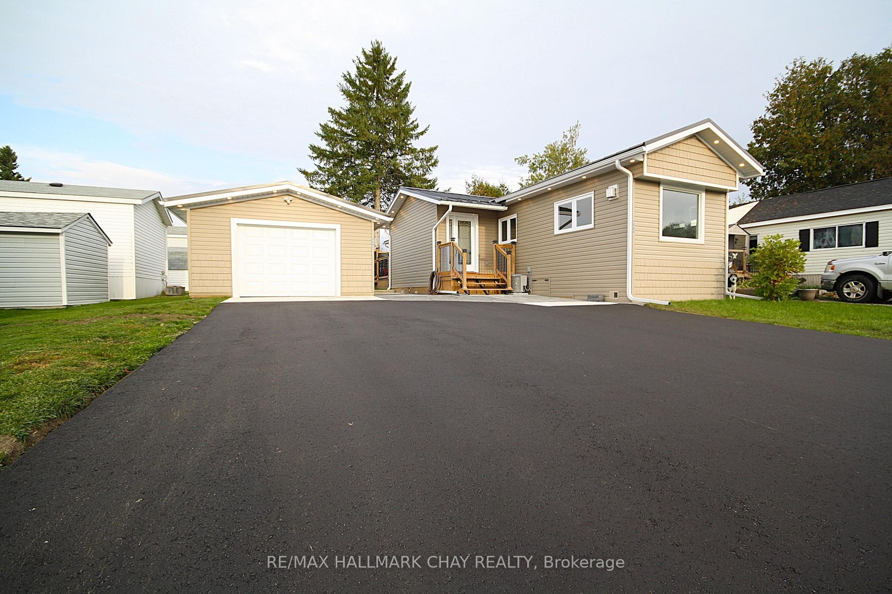 WOW! NEW, NEW, & MORE NEW! Completely renovated or rebuilt inside and out. This move in ready 2 bedroom 2 bathroom home has been recreated just for you to enjoy for many years to come. Excellent layout provides a walkout to large private deck off primary bedroom, bonus office with closet and attached 1/2 bath, large foyer with coat closet, covered porch, open concept kitchen with cozy gas fireplace. Too many upgrades to list...featuring all NEW in 2024/25; steel roofs on all 3 buildings, siding, soffit, fascia, troughs, exterior lighting, huge new asphalt driveway, paver stone, all new windows, and new exterior doors, new decks, upgraded insulation, new drywall, all new flooring, totally new bathroom, 5 brand new appliances, new kitchen, new central air unit, all interior trim & doors, and paint, new pot lighting and light fixtures, and much much more! Walk out to large private deck. Pride of ownership and attention to details abound. Garage was taken down to foundation and rebuilt with new framing, insulated walls and doors, windows, garage door opener, and hydro. Amazing opportunity. Located close to Orillia and major amenities. Land lease fee includes road maintenance, garbage removal.