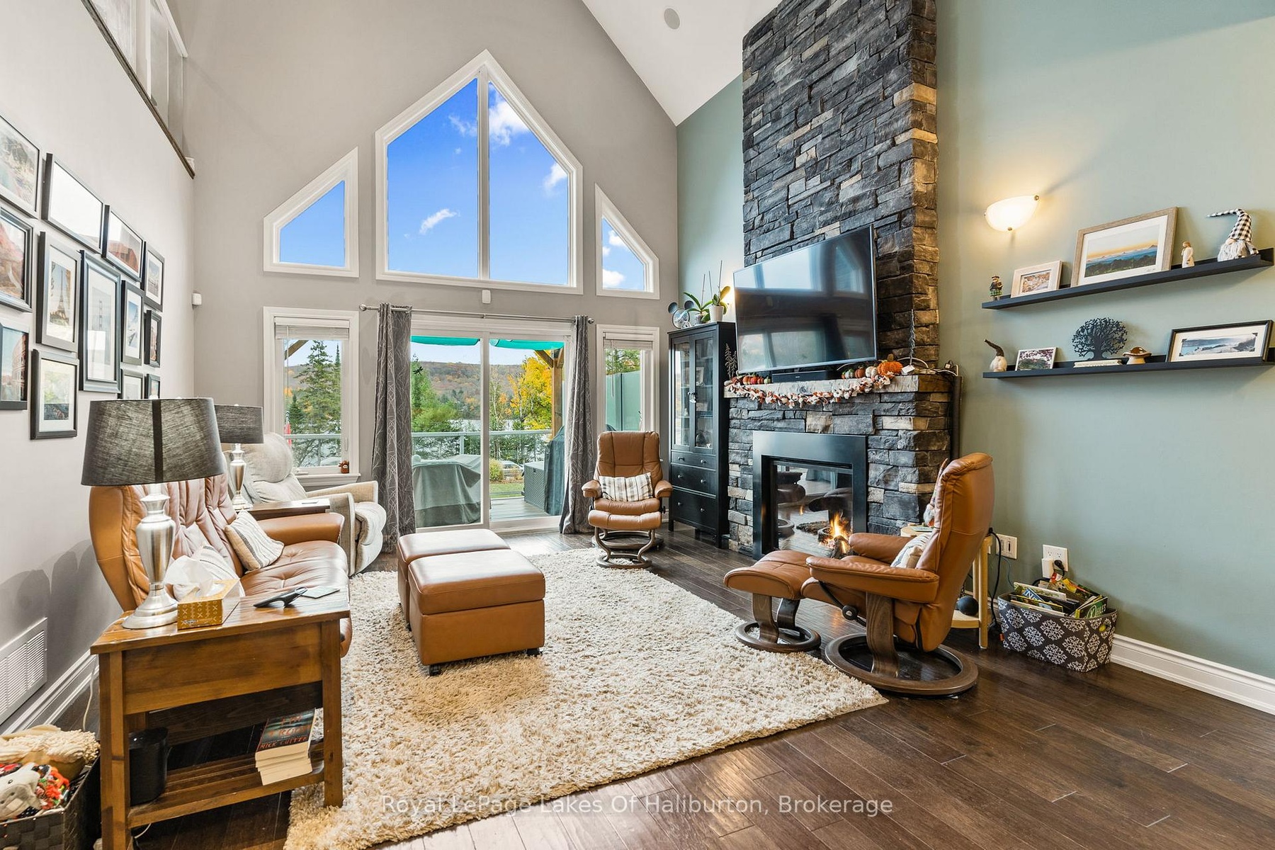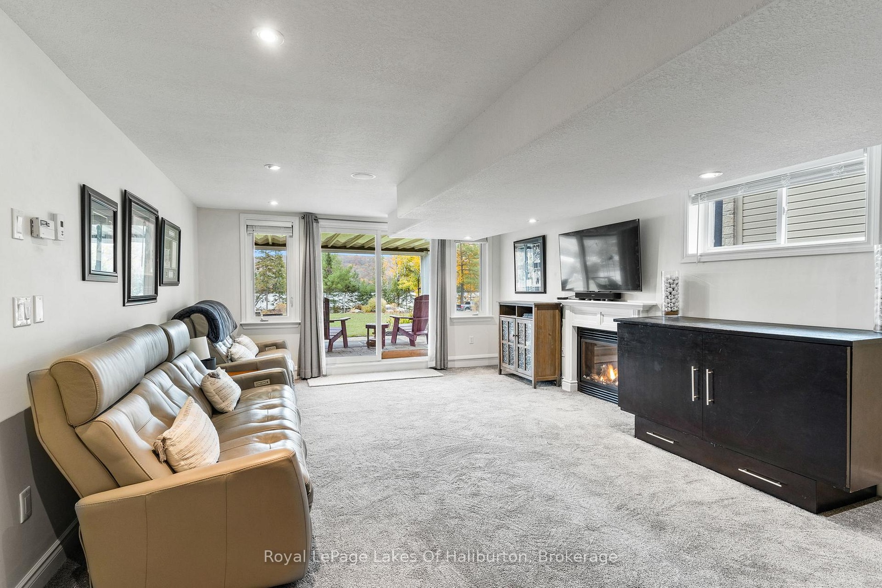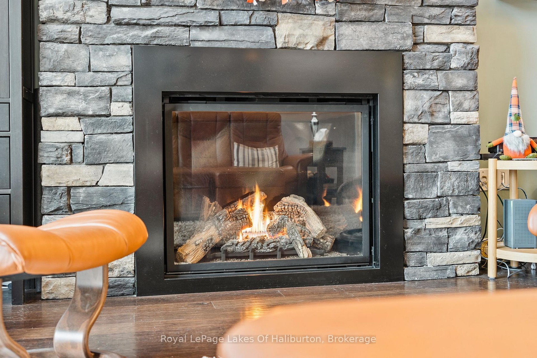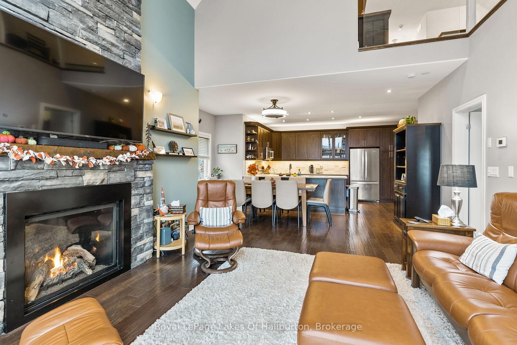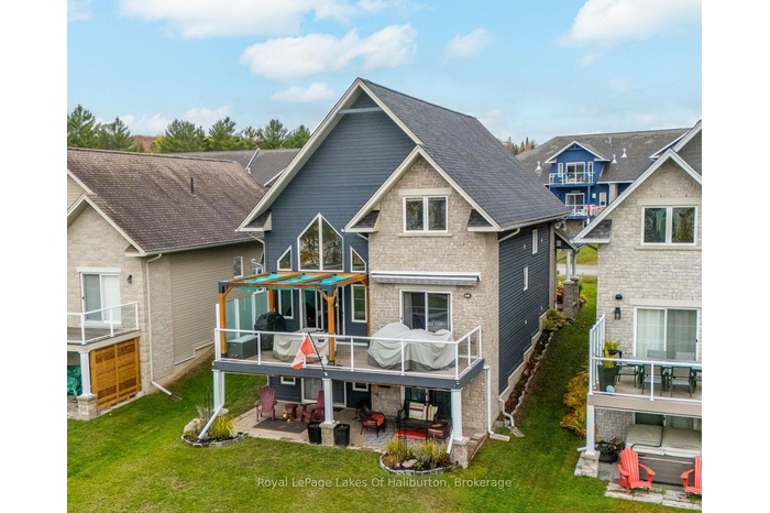 Welcome to this 4-bedroom, 4-bathroom executive home in the prestigious Silver Beach waterfront community on Kashagawigamog Lake, part of the sought-after 5-lake chain. With 2,955 sq. ft. of refined living space, this home combines quality craftsmanship, luxury finishes, and spectacular lake views.The foyer offers keyless entry, retractable screen, and tile floors leading to a gourmet kitchen with upgraded cabinetry, granite counters, under-cabinet lighting, sit-up area, stainless steel appliances, and elegant fixtures. The great room impresses with cathedral ceilings, a stunning floor-to-ceiling stone propane fireplace, hardwood floors, soaring windows, and walkout to a lakeside composite deck featuring a cedar timber-frame pergola and BBQ area and endless lakeviews.The primary suite provides a peaceful retreat with walkout to the deck and awning, ceiling fan, ensuite with heated floors and glass shower. The upper level offers a bright family room with glass panels overlooking the great room, high ceilings, hardwood flooring, 2 bedrooms, carpeted, ceiling fans, and custom blinds, while a walk-in closet area adds generous storage and 4pc bath with soaker tub.The lower level features a spacious rec room with propane fireplace, pot lights, and walkout to an interlocking lakeside patio. A guest suite offers a walkout to waterside patio, walk-in closet, and 4-pc ensuite. Additional highlights include, all bathrooms with heated floors, a multi-zone HVAC system, new hot water on demand (2025), 18W Generac generator, NFTC fibre optics, and a heated, insulated garage with storage and retractable screen. Exterior upgrades include programmable soffit lighting, glass railings, firepit area, and under-deck shielding.Enjoy exclusive access to the Silver Beach Clubhouse featuring a grand hall, kitchen, fitness center, games room, guest suite, two beaches & trails, close to Haliburton for all your amenities. Dock slip available to purchase ($25K). See full list of features.