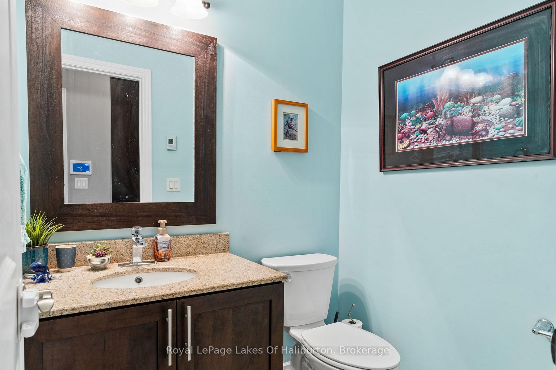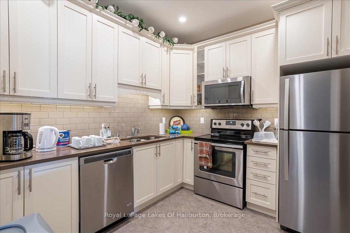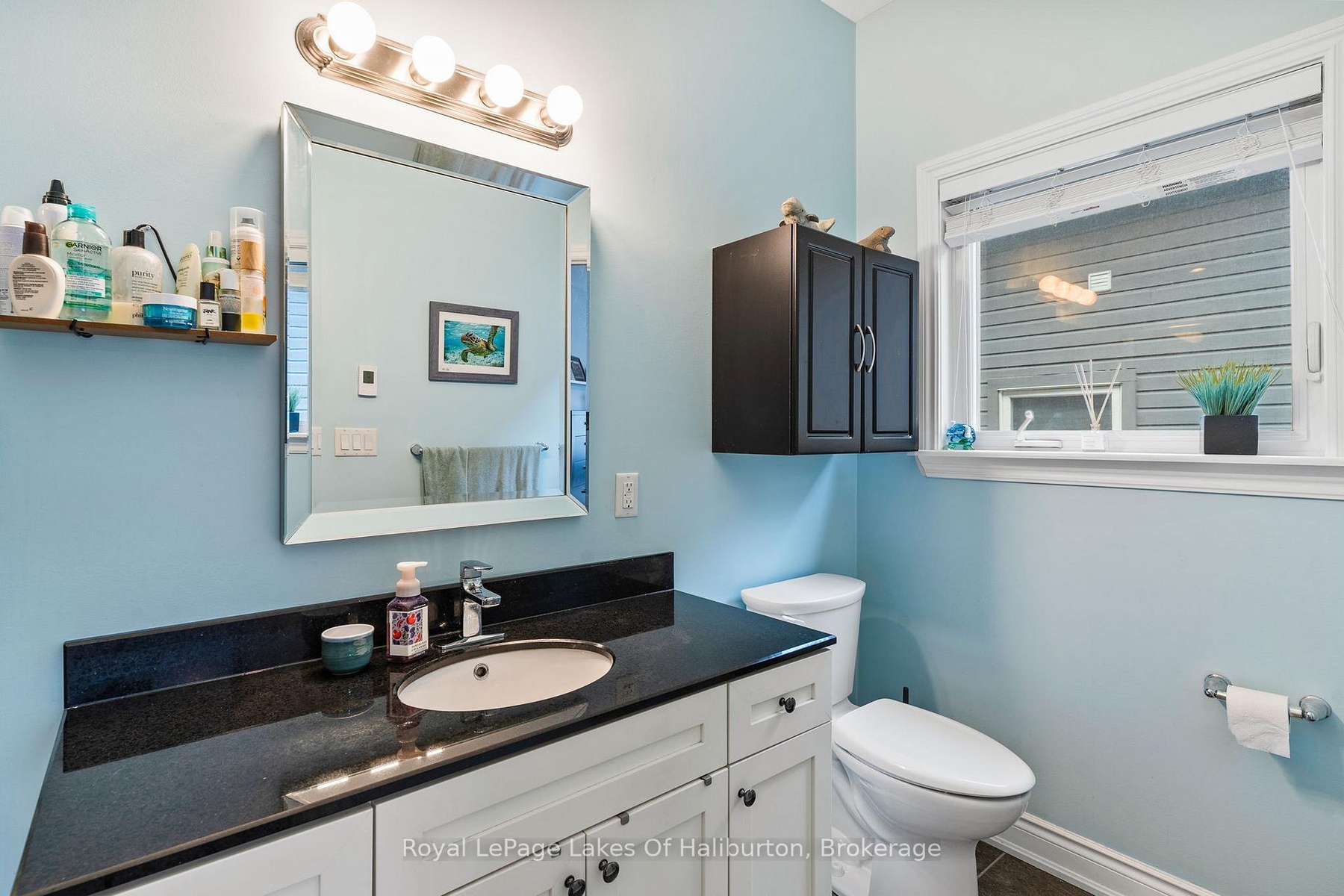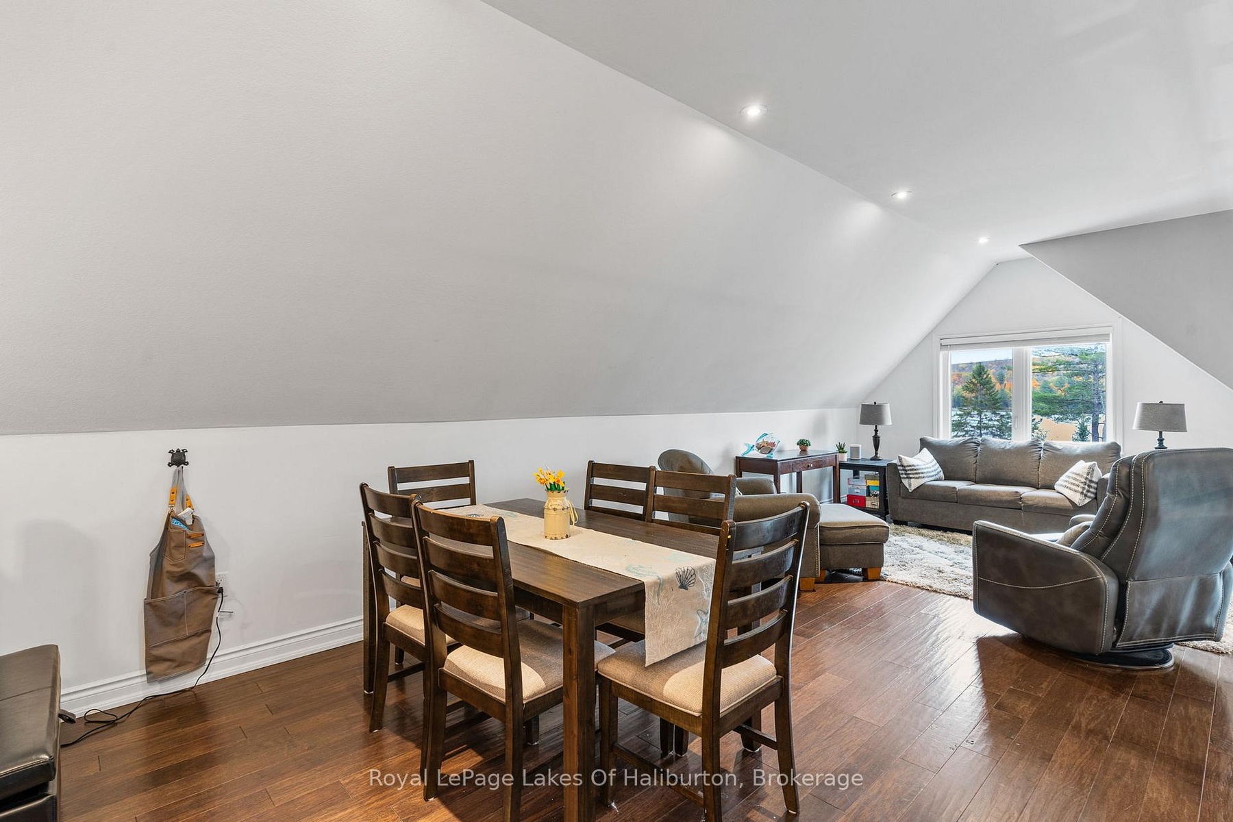 Welcome to this 4-bedroom, 4-bathroom executive home in the prestigious Silver Beach waterfront community on Kashagawigamog Lake, part of the sought-after 5-lake chain. With 2,955 sq. ft. of refined living space, this home combines quality craftsmanship, luxury finishes, and spectacular lake views.The foyer offers keyless entry, retractable screen, and tile floors leading to a gourmet kitchen with upgraded cabinetry, granite counters, under-cabinet lighting, sit-up area, stainless steel appliances, and elegant fixtures. The great room impresses with cathedral ceilings, a stunning floor-to-ceiling stone propane fireplace, hardwood floors, soaring windows, and walkout to a lakeside composite deck featuring a cedar timber-frame pergola and BBQ area and endless lakeviews.The primary suite provides a peaceful retreat with walkout to the deck and awning, ceiling fan, ensuite with heated floors and glass shower. The upper level offers a bright family room with glass panels overlooking the great room, high ceilings, hardwood flooring, 2 bedrooms, carpeted, ceiling fans, and custom blinds, while a walk-in closet area adds generous storage and 4pc bath with soaker tub.The lower level features a spacious rec room with propane fireplace, pot lights, and walkout to an interlocking lakeside patio. A guest suite offers a walkout to waterside patio, walk-in closet, and 4-pc ensuite. Additional highlights include, all bathrooms with heated floors, a multi-zone HVAC system, new hot water on demand (2025), 18W Generac generator, NFTC fibre optics, and a heated, insulated garage with storage and retractable screen. Exterior upgrades include programmable soffit lighting, glass railings, firepit area, and under-deck shielding.Enjoy exclusive access to the Silver Beach Clubhouse featuring a grand hall, kitchen, fitness center, games room, guest suite, two beaches & trails, close to Haliburton for all your amenities. Dock slip available to purchase ($25K). See full list of features.