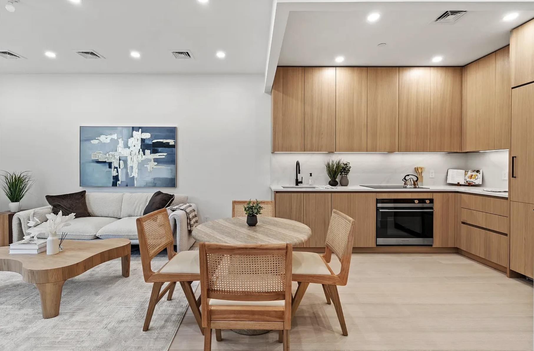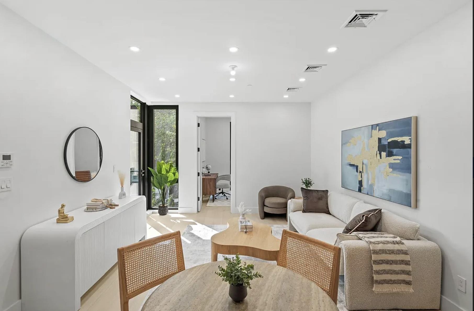Residents are greeted by a bright open-concept living, dining, and kitchen space with premium finishes like floor-to-ceiling double-pane Reynaers windows, recessed lighting, multi-zone Daikin heating and cooling mini splits, and solid 7-inch engineered white oak floors with a protective acoustic sublayer. The living area flows out to one of two terraces for an effortless indoor-outdoor experience.