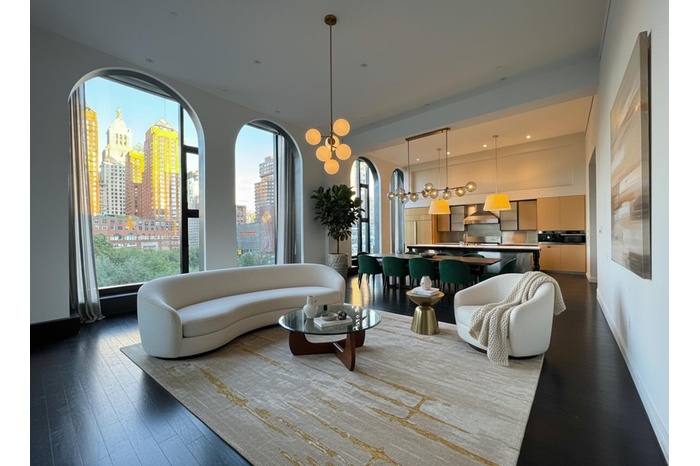 With 16-foot ceilings and soaring arched windows overlooking Union Square Park, this home offers scale, light, and drama that are simply unmatched. The expansive living and dining space flows into a custom chef’s kitchen with professional-grade appliances, marble island, and bespoke finishes—perfect for both entertaining and everyday living. Each bedroom features an en-suite bath with refined stone and wood finishes, while a powder room and full laundry room add convenience.