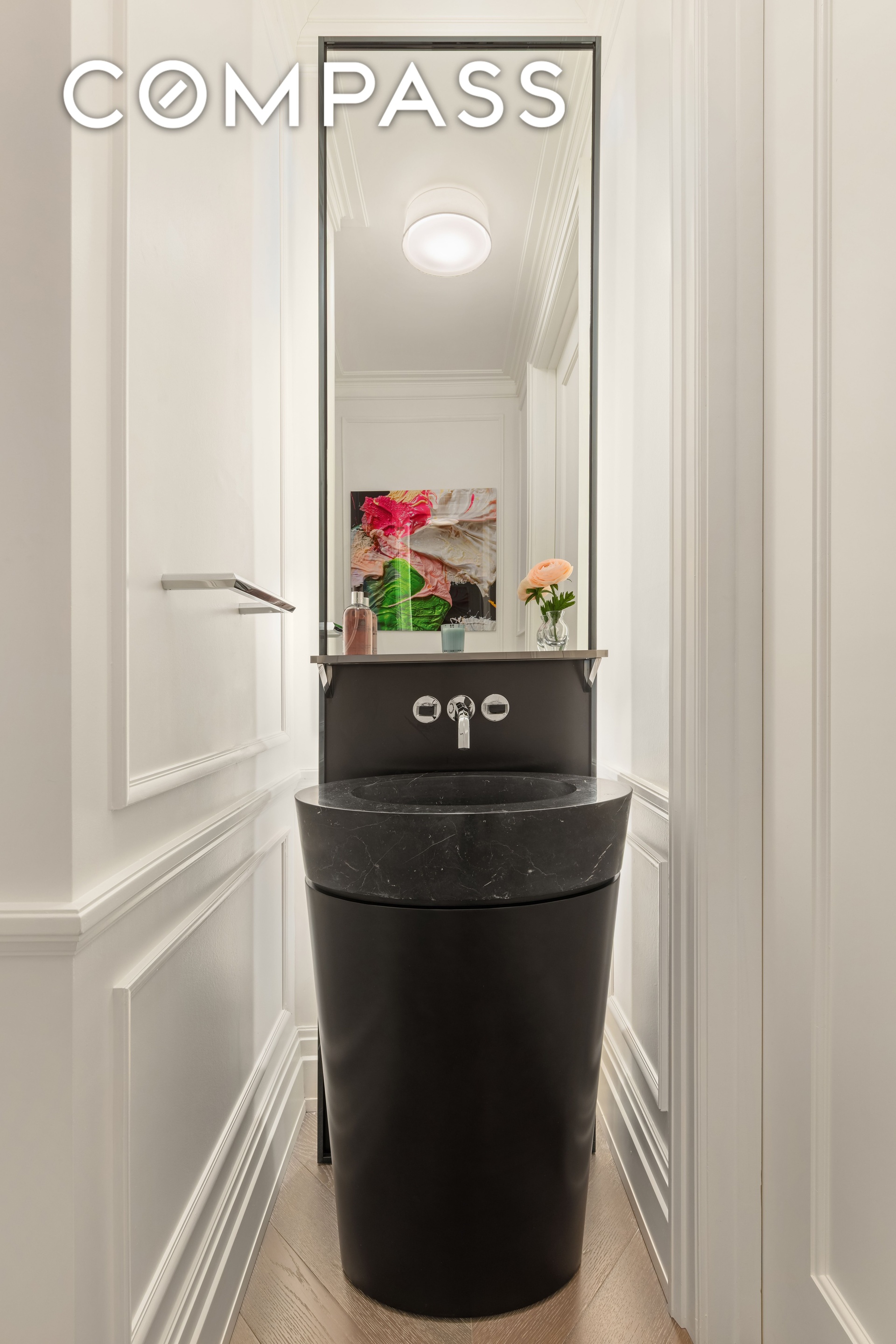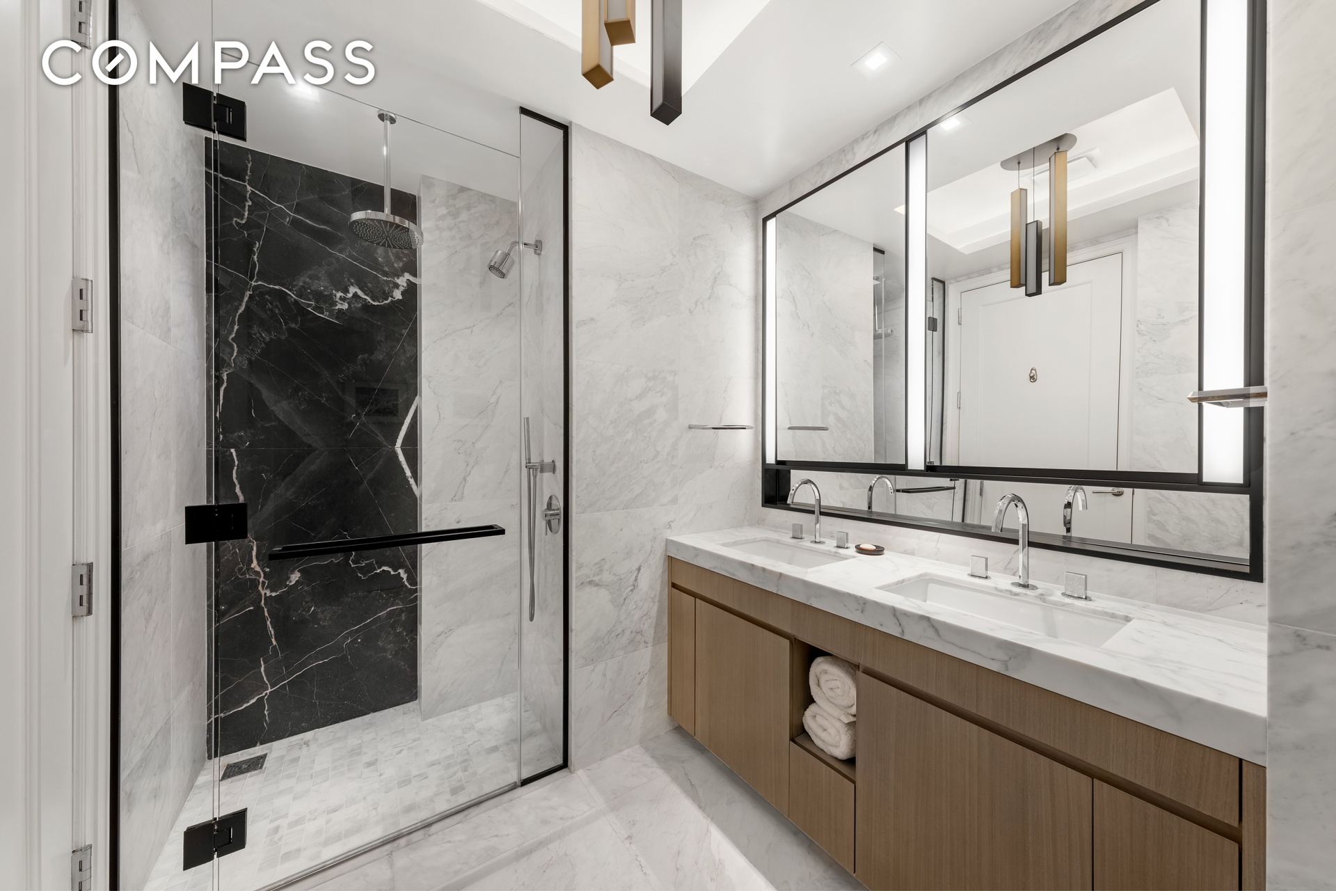 Privately located at the end of the hallway, the peaceful primary suite offers two well-appointed closets with additional built-in storage. A stunning en-suite marble bath clad in high-honed Calacatta Mandria stone with Fantini polished chrome fixtures that complement the double vanity and oversized walk-in shower. The spacious secondary bedroom features its own en-suite bath with soaking tub, while the sculptural Nero Marquina powder room adds a bold design statement. Central heating and cooling, and a utility closet with a washer and dryer complete the home.