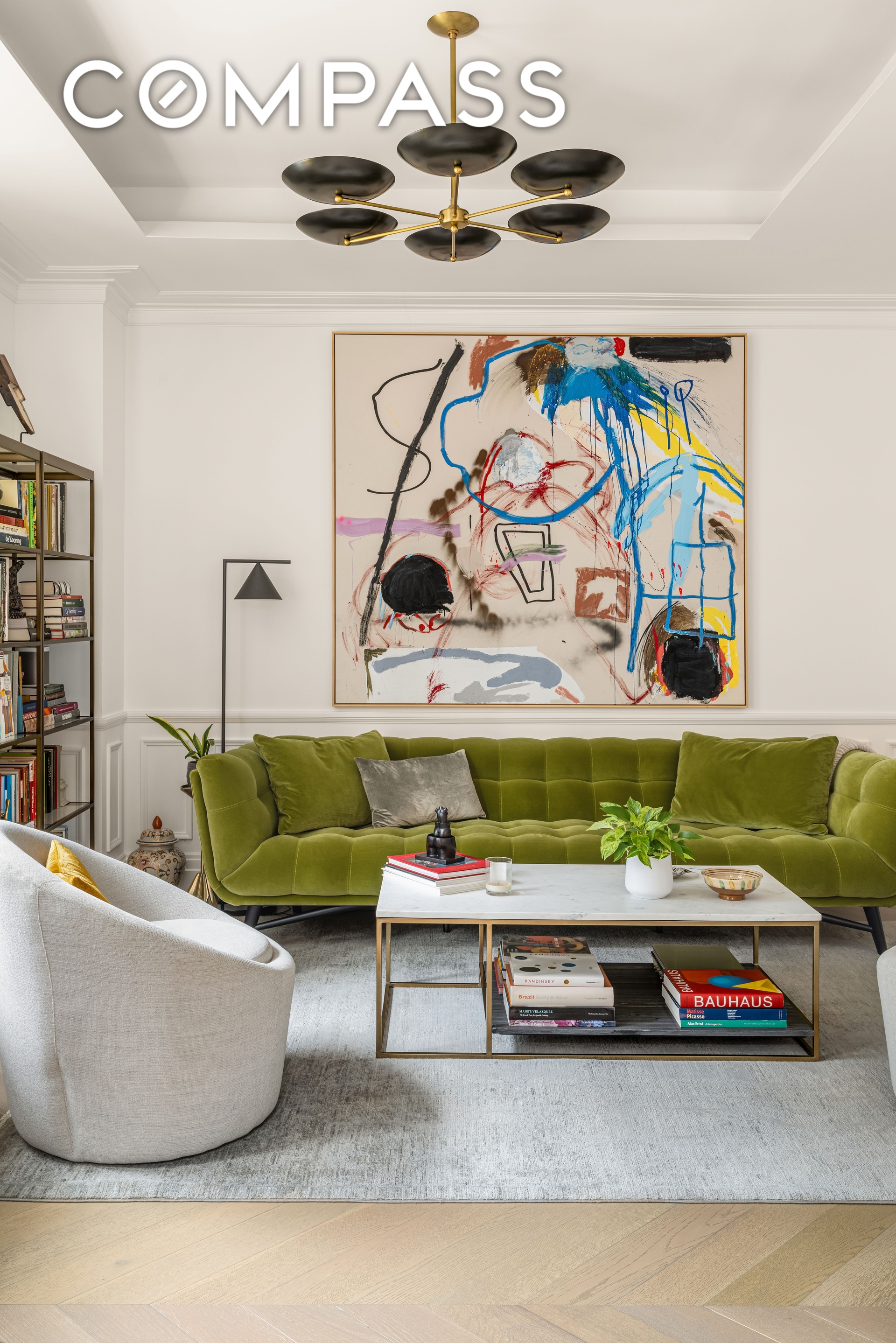 An inviting foyer welcomes you into the sun-filled corner living room overlooking Broadway, a gracious space designed for both entertaining and serene evenings at home. At the heart of the home, the elegant kitchen by Jeffrey Beers International balances function and artistry. Outfitted with Italian Scavolini cabinetry, the open-plan kitchen features an Arabescato Cervaiole marble countertop and backsplash with a beautiful waterfall island. Generously proportioned, the kitchen includes premium Miele appliances such as a five-burner gas cooktop with vented hood, combination steam/convection oven, speed oven, and wine refrigerator. A separate dining area sits adjacent to the kitchen and living room, offering the perfect setting for dinner parties or casual meals alike.