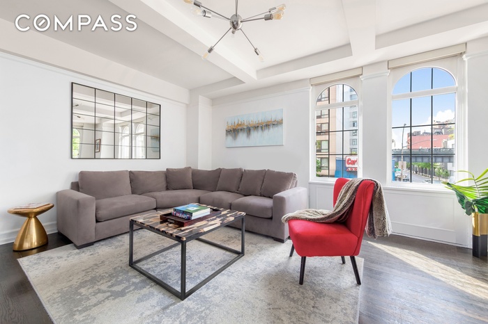 An entry foyer with a walk-in closet leads to an expansive gallery hall providing a sense of grandeur. Ahead you will discover the peaceful corner living and dining area with four arched casement windows capturing a picture perfect mix of treetop views, townhomes, blue sky and sunlight. Details abound including high ceilings, exposed beams, all enriched with beautifully stained oak hardwood floors.