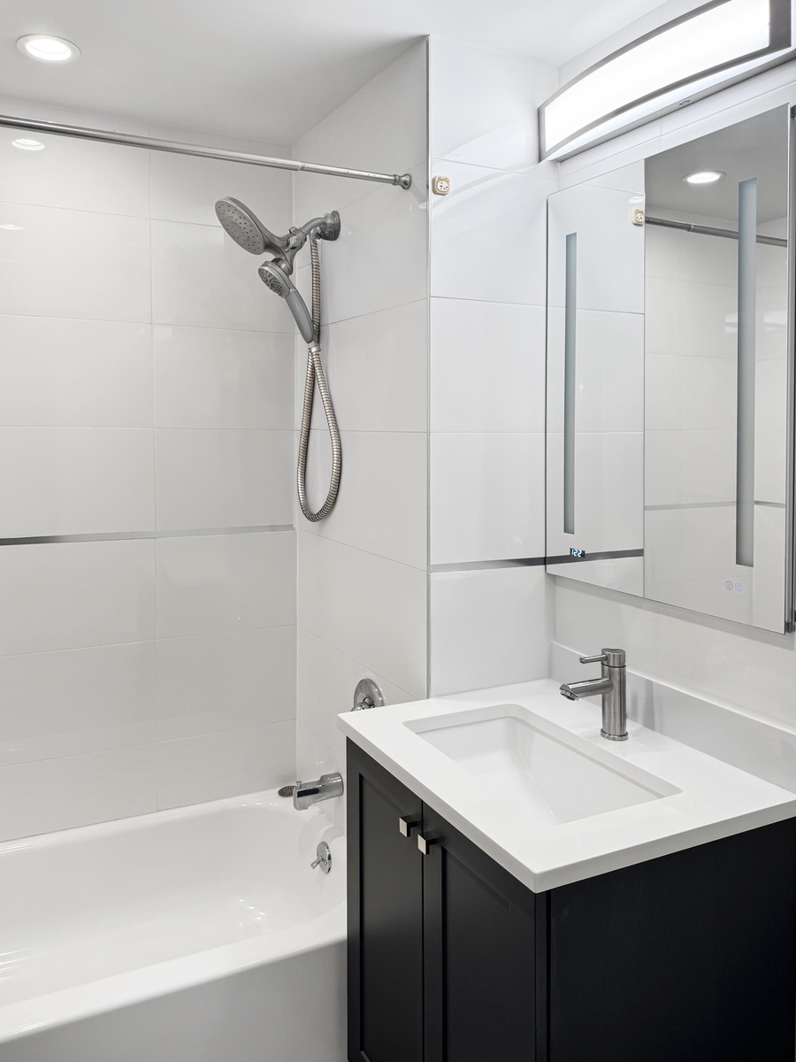 The chef-inspired kitchen features European quartz countertops, custom lacquered white cabinetry, and top-of-the-line stainless steel appliances, offering both elegance and efficiency. The spa-style bathroom provides a tranquil retreat with refined wall tile, grey stone flooring, and a deep soaking tub.