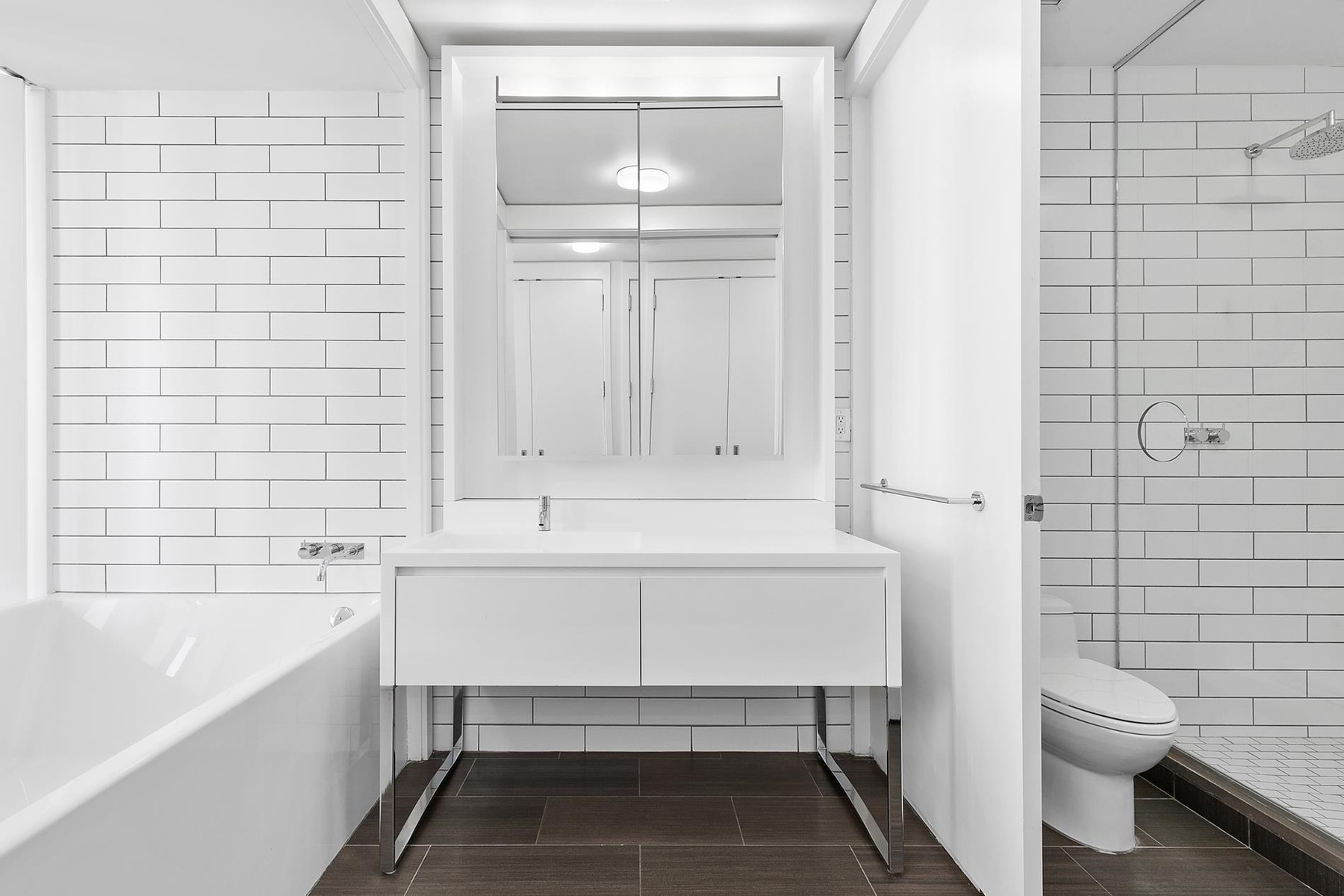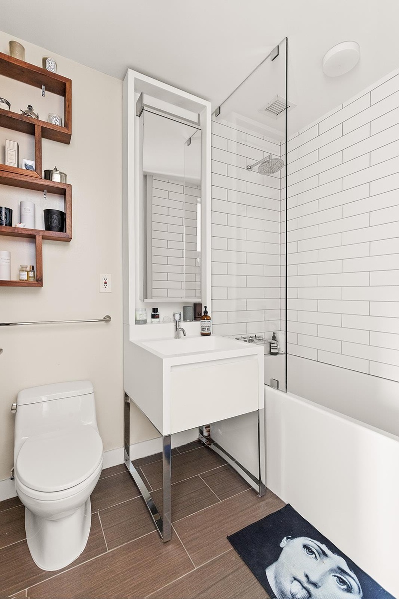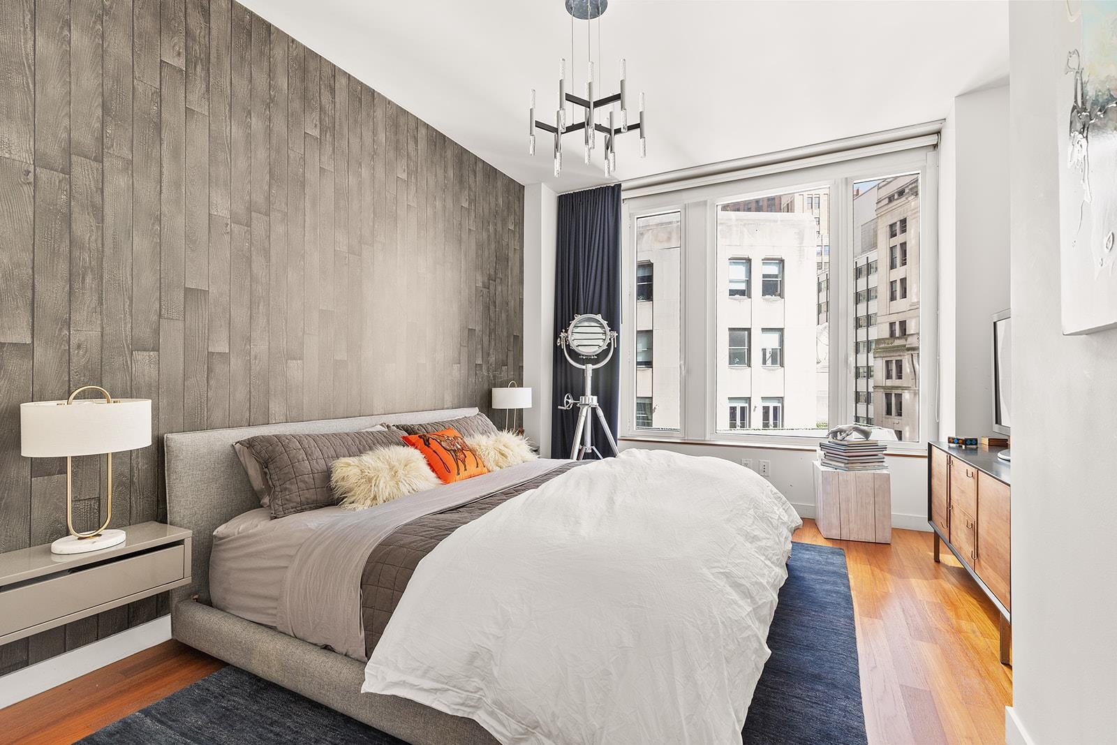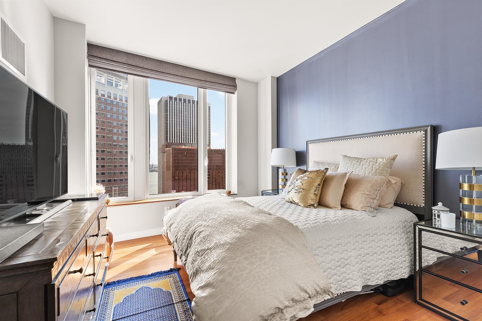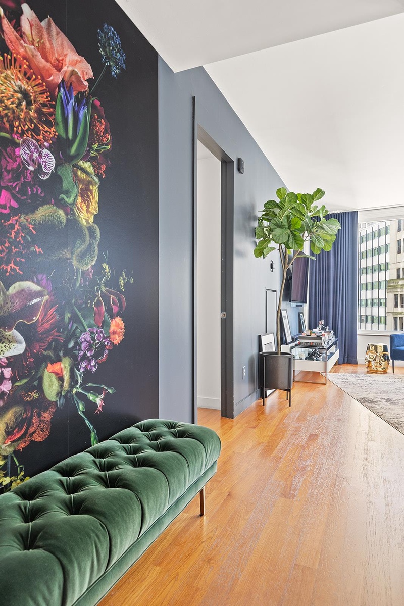 This corner residence boasts floor-to-ceiling windows and soaring ceilings, flooding the home with natural light and offering sweeping city views. The open-plan living and dining area is ideal for entertaining, with a chef’s kitchen featuring custom cabinetry, Caesarstone countertops, and top-of-the-line appliances by Miele, Gaggenau, and Sub-Zero.