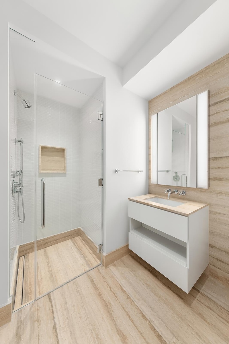 Warm stone primary bathrooms feature large soaking tubs and heated floors. The building’s one-of-a-kind residences maintain the integrity and character of the 1930s scale, a modern take to art deco detailing, and boast ceiling heights over ten feet throughout with wide-plank French Oak hardwood floors underfoot.