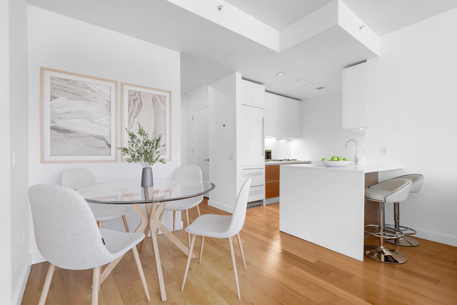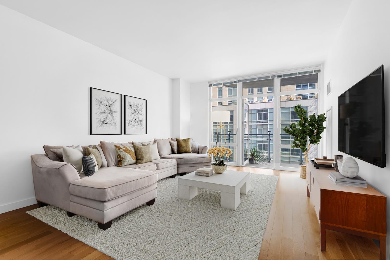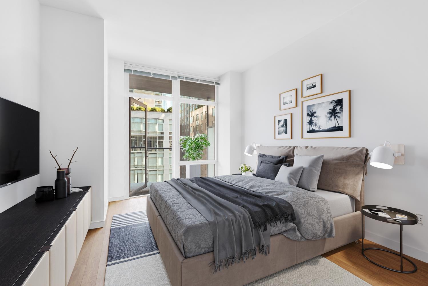 Bathed in natural light from floor-to-ceiling windows, the home showcases northern city views and a rare 130-square-foot private terrace accessible from both the living room and bedroom. Soaring ceilings and wide-plank oak flooring enhance the airy, refined ambiance.