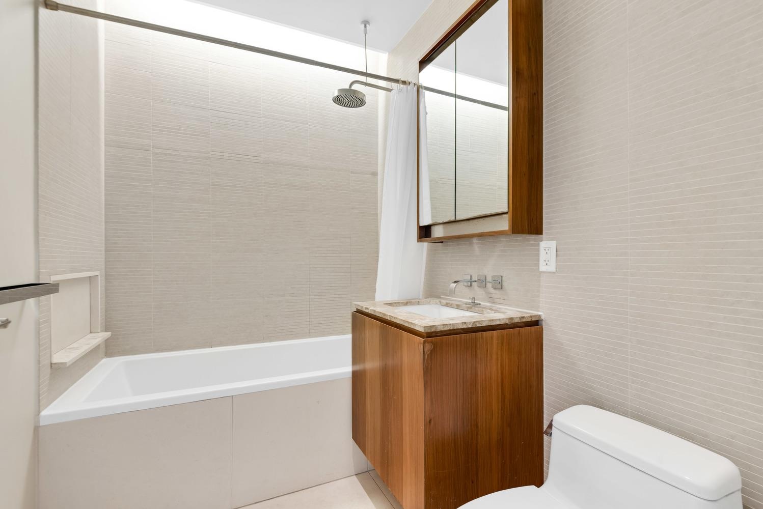 The open chef’s kitchen is appointed with imported high-gloss lacquer and Wenge cabinetry, Sub-Zero and Bosch appliances, ample storage and a large island with seating. The king-sized bedroom offers excellent storage and terrace access, while the spa-like bathroom features premium finishes, a soaking tub, and waterfall shower. An in-unit washer/dryer completes the home.