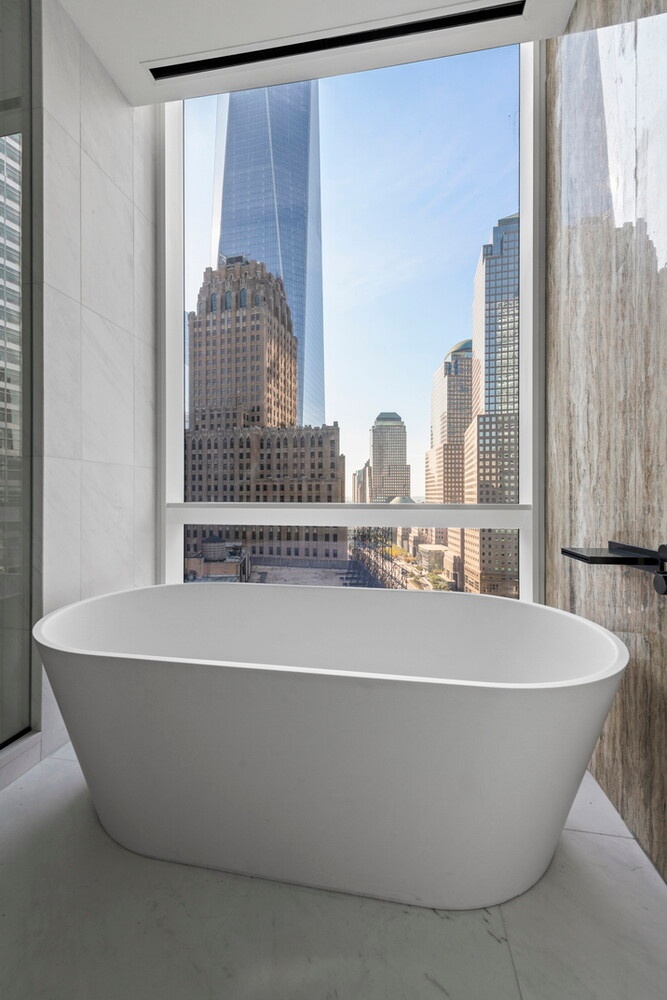 The primary suite is an elegant retreat, complete with a walk-in closet and spa-inspired bathroom featuring radiant-heated floors, a double vanity of Calacatta Borghini marble, and a deep oval soaking tub overlooking the dramatic downtown skyline.