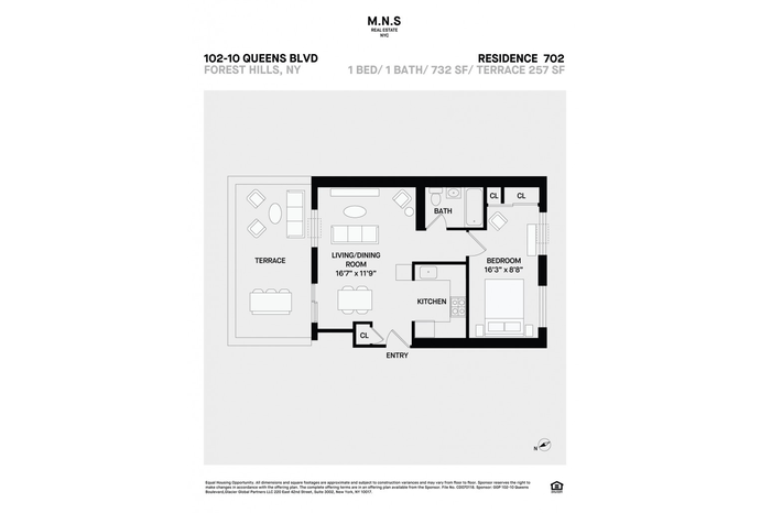 Spacious One-Bedroom with Private Terrace — A Rare and Unique Layout!Harmonious Living RedefinedWhere modern living meets the charm of Forest Hills, one of Queens’ most desirable neighborhoods. With stunningly renovated common areas and residences, 102-10 will deliver a unique blend of luxury and convenience tailored for modern living.Each residence is thoughtfully designed with contemporary flair, featuring open layouts that maximize light and space. Premium finishes—including rich oak wood floors and bespoke cabinetry—create a refined and inviting atmosphere.Homes have been meticulously reimagined, offering black shaker cabinetry, quartz countertops, stainless steel appliances, bright tiled bathrooms, and the convenience of in-unit washers and dryers.Enjoy all this condominium has to offer including:Indoor Parking* additional purchaseCommon TerraceButterfly MX IntercomElevatorVerizon Fios EnabledExperience the pinnacle of city living at 102-10 Queens Boulevard, where every convenience is just outside your door in the heart of Forest Hills! This neighborhood seamlessly combines timeless charm with modern amenities, making it one of the most sought-after locations in QueensThis location is a commuter’s dream with easy and quick access to: E, F, M, R and LIRR trains, the LIE and GCP. Forest Hills is truly a shopper’s paradise, with the bustling Austin Street just a short stroll away and is Forest Hills is brimming with charming spots that locals cherish. Nature lovers and fitness enthusiasts will feel right at home with Forest Hills’ abundant green spaces. The iconic Forest Hills Gardens offers a picturesque backdrop for weekend strolls, while Flushing Meadows-Corona Park provides endless opportunities for recreation and relaxation.Photos may not be reflective of the subject unit and or may be virtually staged.Equal Housing Opportunity.Sponsor reserves the right to make changes in accordance with the offering plan. The complete offering terms are in an offering plan available from the Sponsor. File No. CD070118. Sponsor: GGP 102-10 QueensBoulevard, Glacier Global Partners LLC 220 East 42nd Street, Suite 3002, New York, NY 10017.