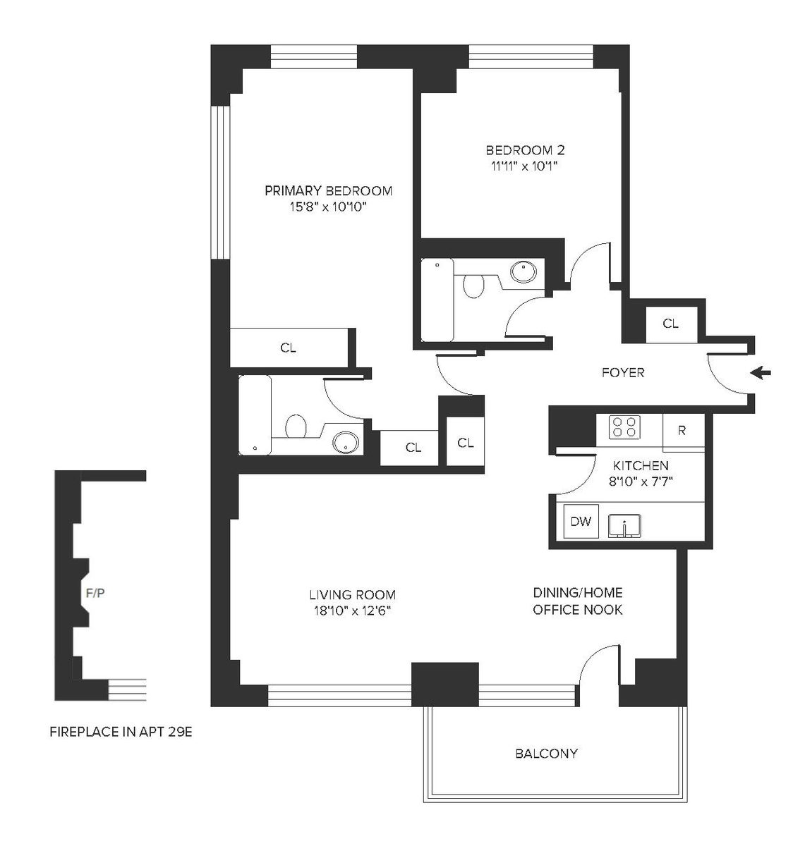 Bright and spacious two bedroom with private balcony and flexible floor plan with space for a dedicated dining or home office nook. Apartment also features a gourmet kitchen with stainless steel appliances and stone countertops, a primary bedroom with double exposures, two closets, and an en-suite bath, and wood floors throughout. Laundry is conveniently located on every floor. Note: The use of flex walls or any space alterations are not permitted.