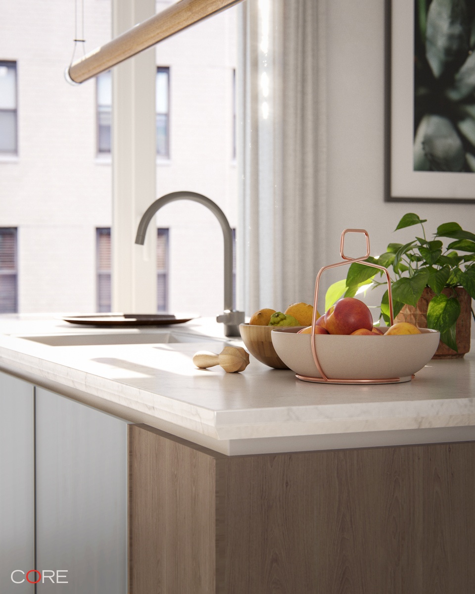 The primary bath is a haven of comfort and tranquility, featuring custom-built oak vanities, Bianco Sivec marble walls, and radiant-heated flooring. Additional apartment features include eight-inch plank oak flooring, abundant closet space, and optional extra storage.