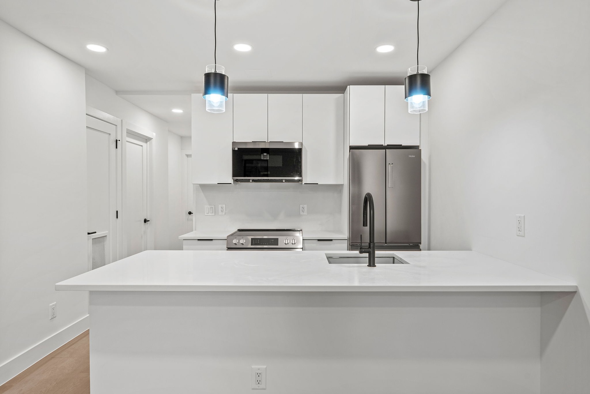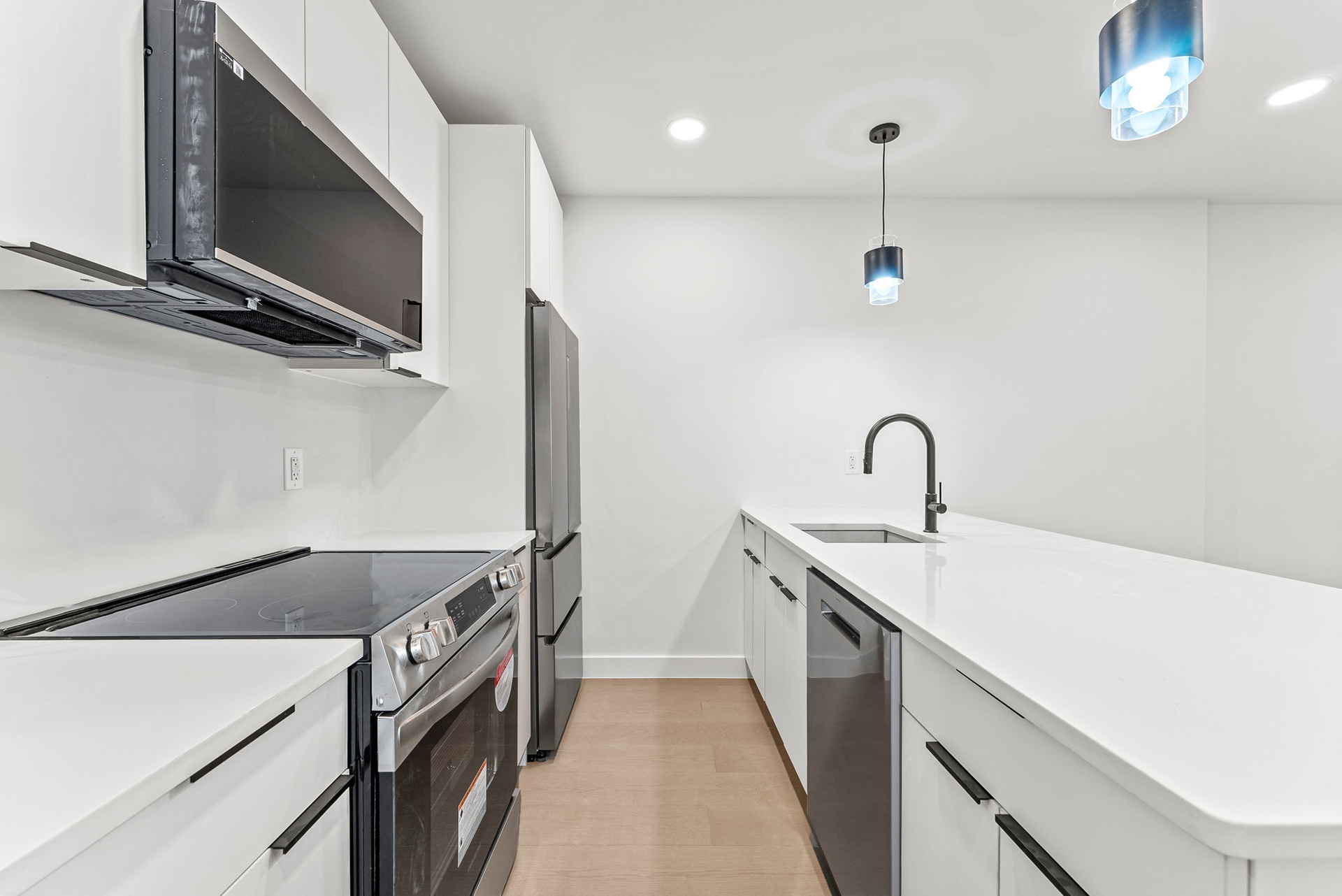 The open kitchen is a chef’s dream, featuring custom cabinetry, quartz countertops, and premium stainless-steel appliances. Spacious bedrooms offer ample closet space, while the two stylish bathrooms boast high-end fixtures and contemporary tilework.