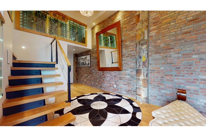 Dramatic open-plan living space framed by original exposed brick and flooded with natural light