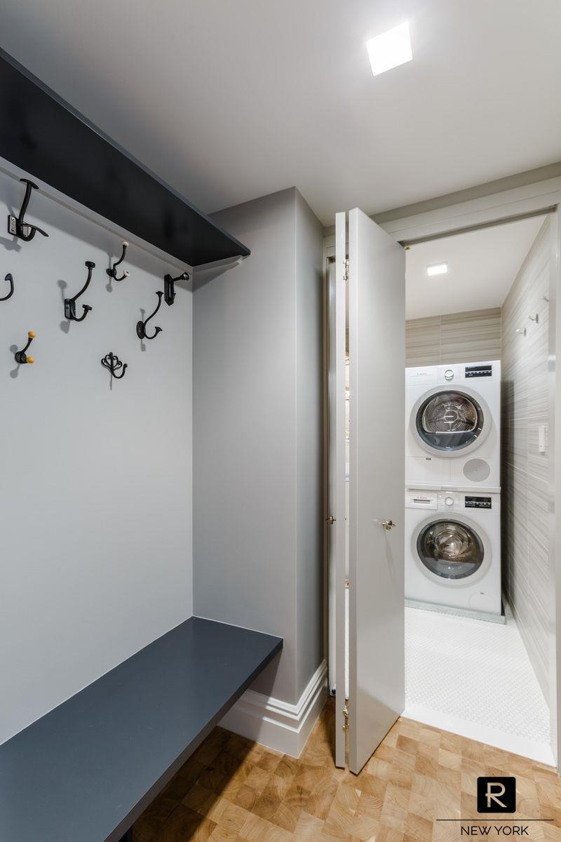 The entry vestibule has a bench, shelve and multiple coat/hat hooks to facilitate your departure and arrival. Directly adjacent is a tile clad mudroom with mechanicals and a stacked washer/dryer.