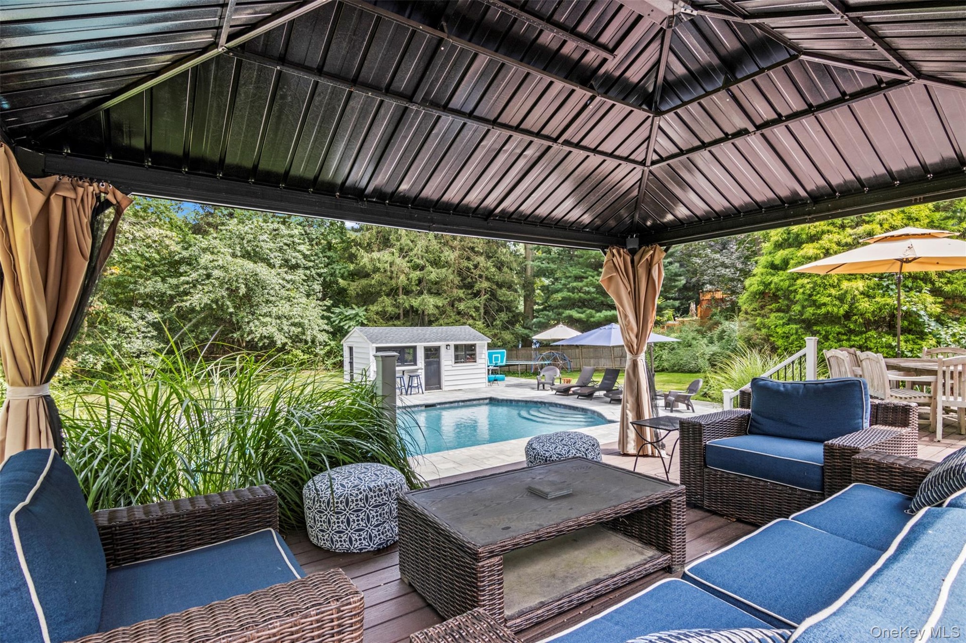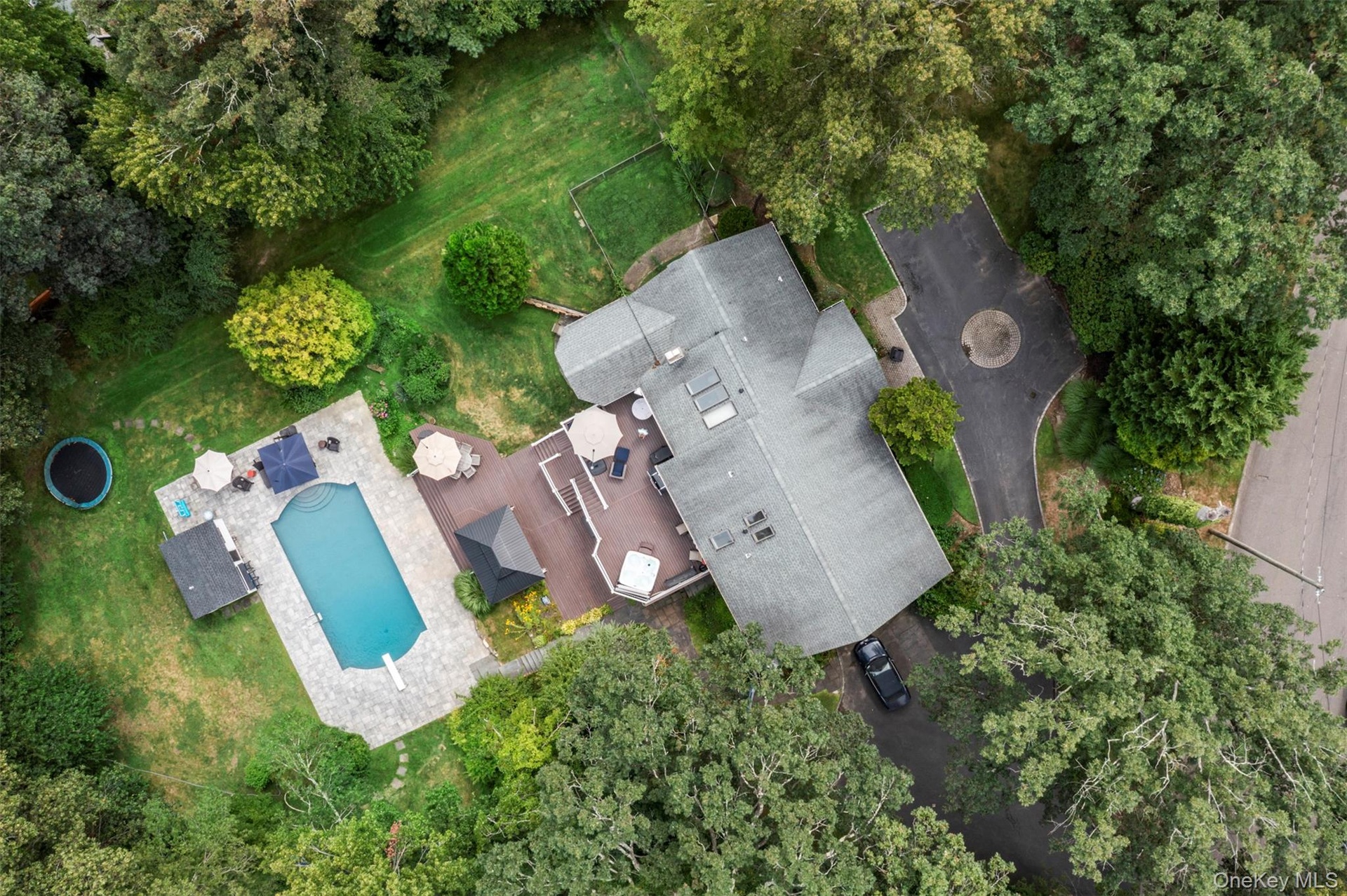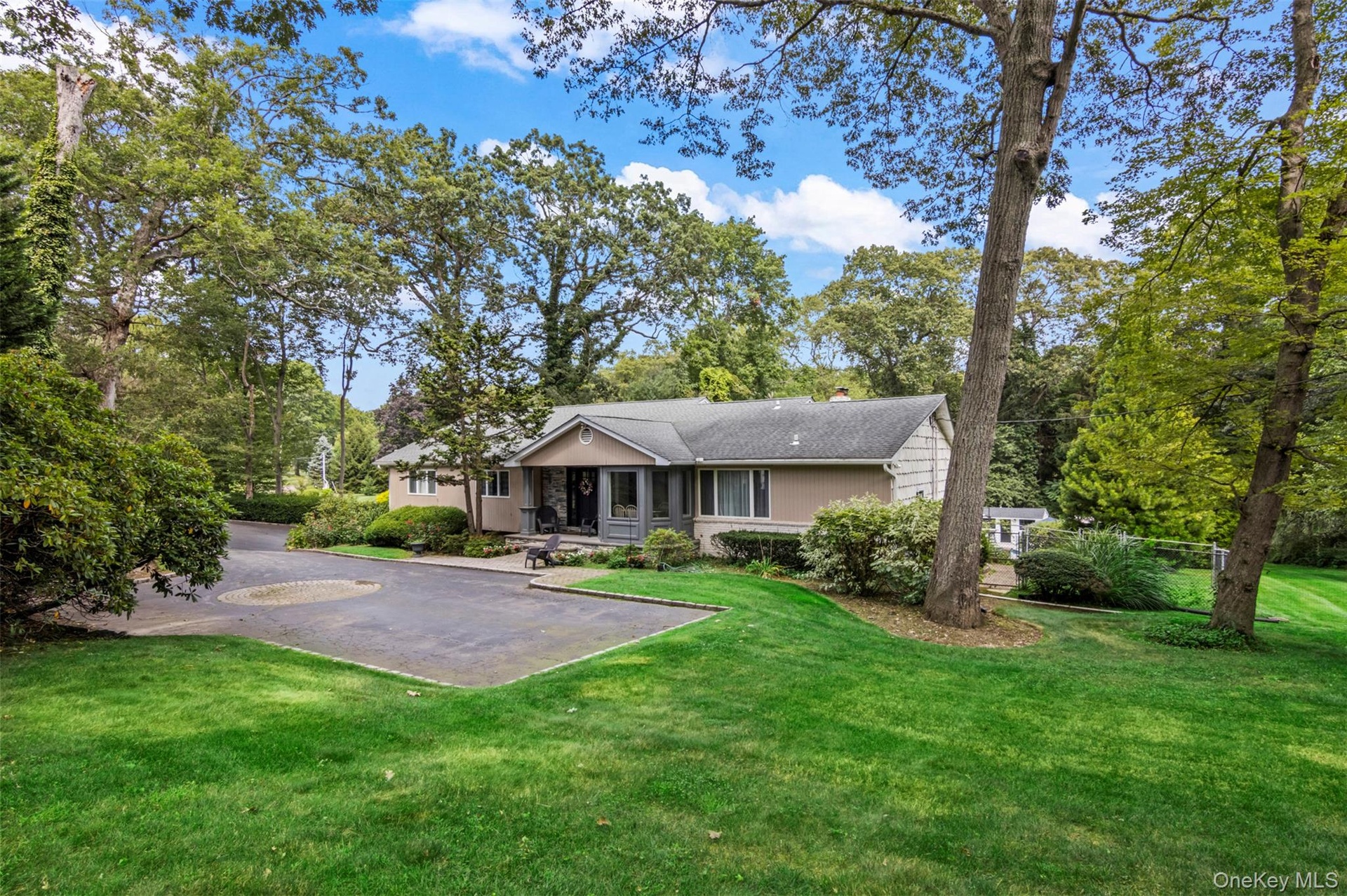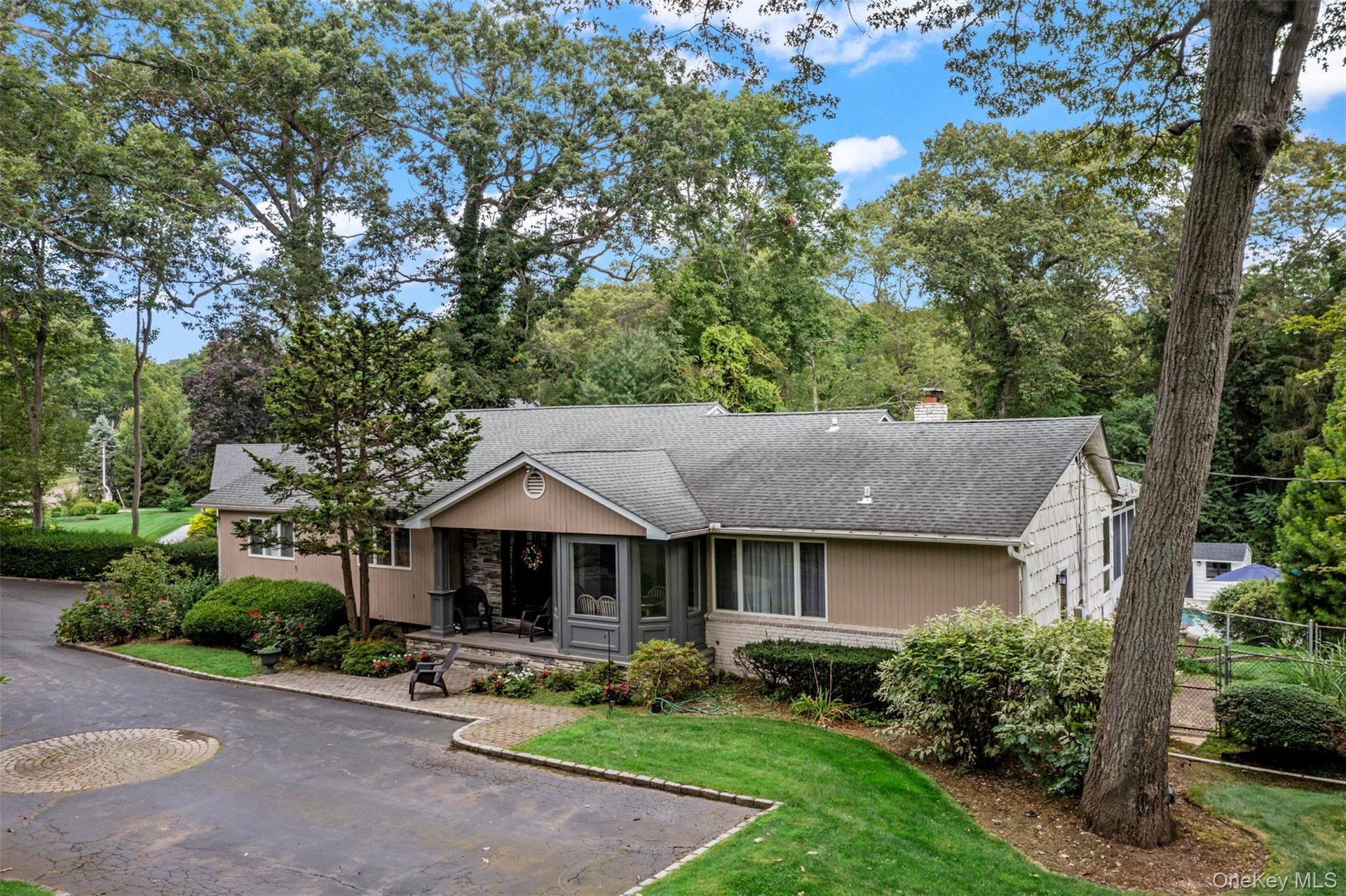 Location, amenities and SPACE in this sprawling, single-story retreat nestled in the absolutely beautiful Caledonia section of Dix Hills. This remodeled, versatile, 3/4 bedroom home was designed with a spacious open floor plan, flexible living options and tons of natural light. Featuring vaulted ceilings and a double-sided fireplace, the large family room and sun room invite effortless indoor-outdoor living: sliding glass doors connect the interior to a multi-level deck and stunning, country club backyard — a landscaped full acre with heated pool, cabana, paver patio, dining and lounge areas! Ideal for entertaining in any season, the home's eat-in kitchen features an oversized island, granite countertops, stainless steel appliances, and ample storage. The primary suite offers a full bathroom with private access to the tiered deck, plus a massive walk-in closet. Additional bedrooms provide flexible accommodations for dwellers or guests. Highlights include new central A/C, young roof, recently converted gas heat, 2-car garage beneath the home, first floor laundry, radiant heated floors and a fabulous walk-out basement with garage access and outside entrance. Ideally located in one of Dix Hills' most serene, bucolic neighborhoods just minutes from Signal Hill Elementary, Hills East High School and St. Anthony's High School. Caledonia Park, Northern State Pkwy and Jericho Tpk are about a mile away. Experience the perfect combination of versatility, location, and lifestyle in one of the best buys in Dix Hills. Sold As Is. Hurry!