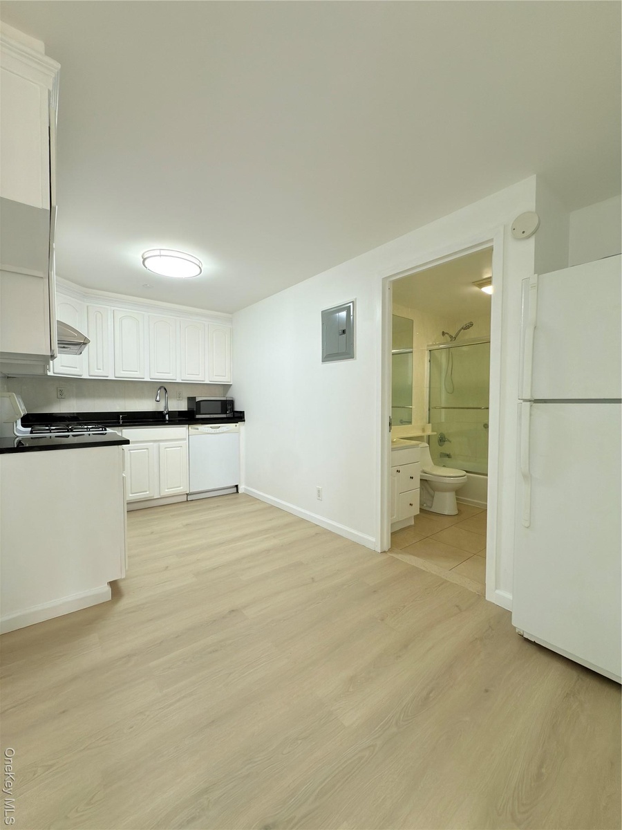 - Kitchen featuring fridge, dark countertops, white cabinets, light wood-style floors, and stove