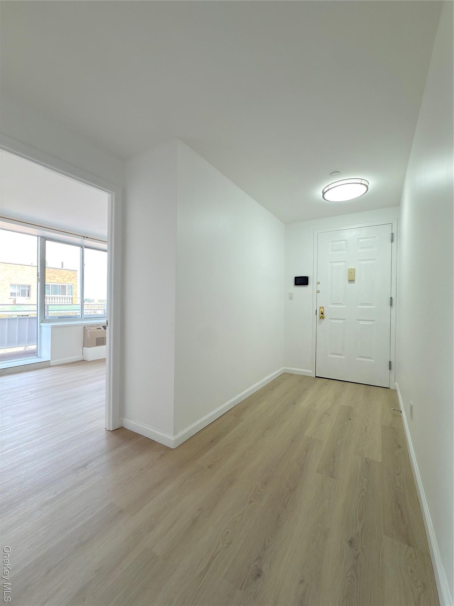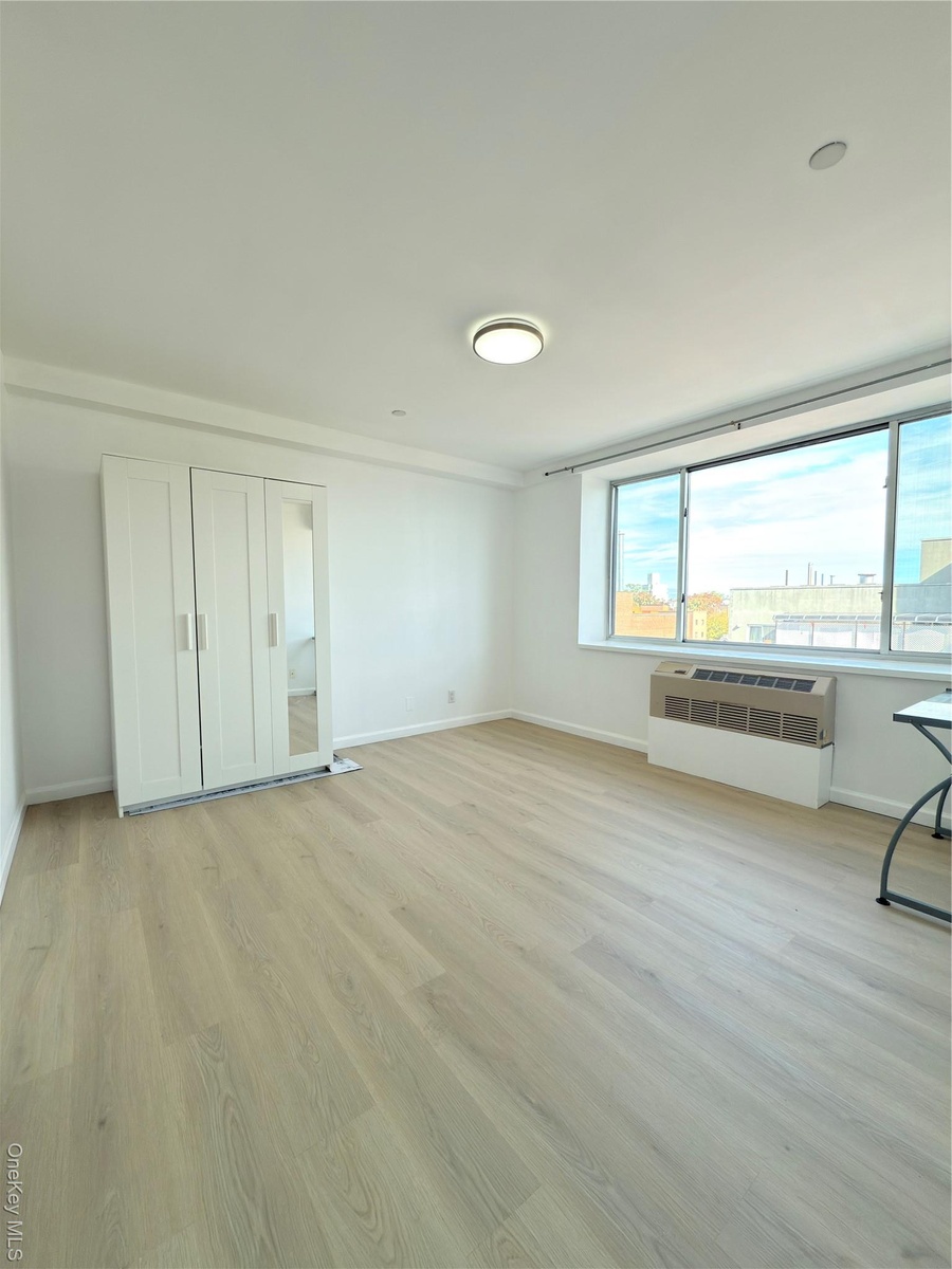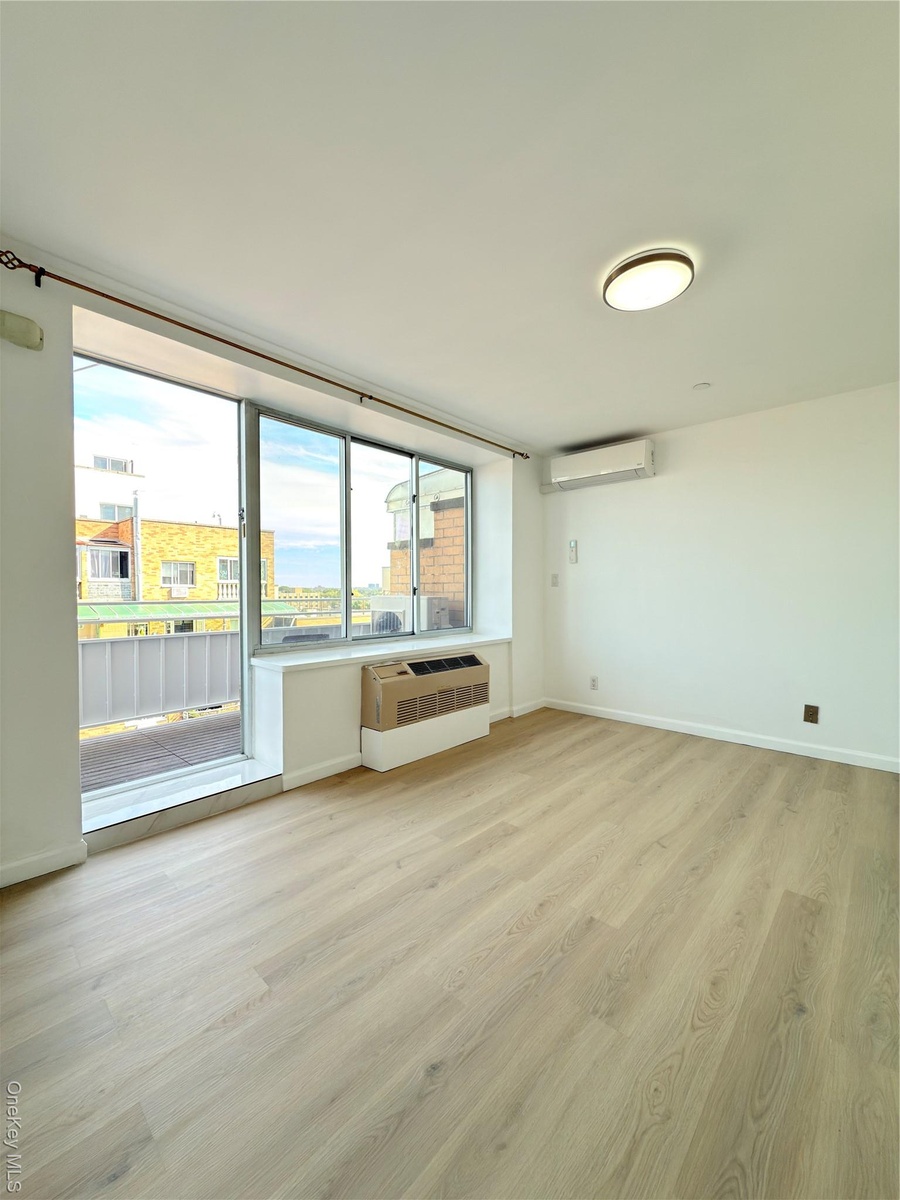 - Unfurnished living room with light wood finished floors and a wall mounted air conditioner