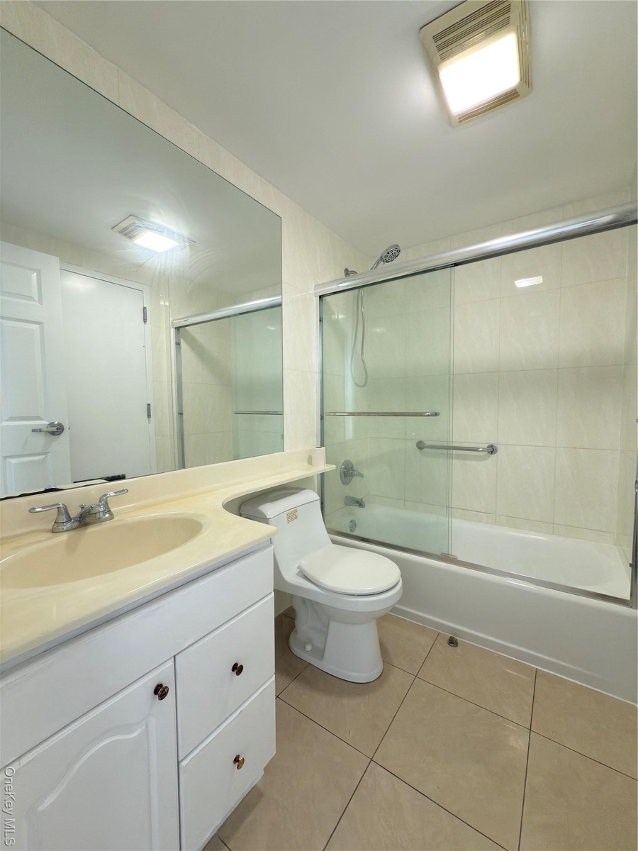 - Full bathroom with light tile patterned flooring, vanity, and enclosed tub / shower combo