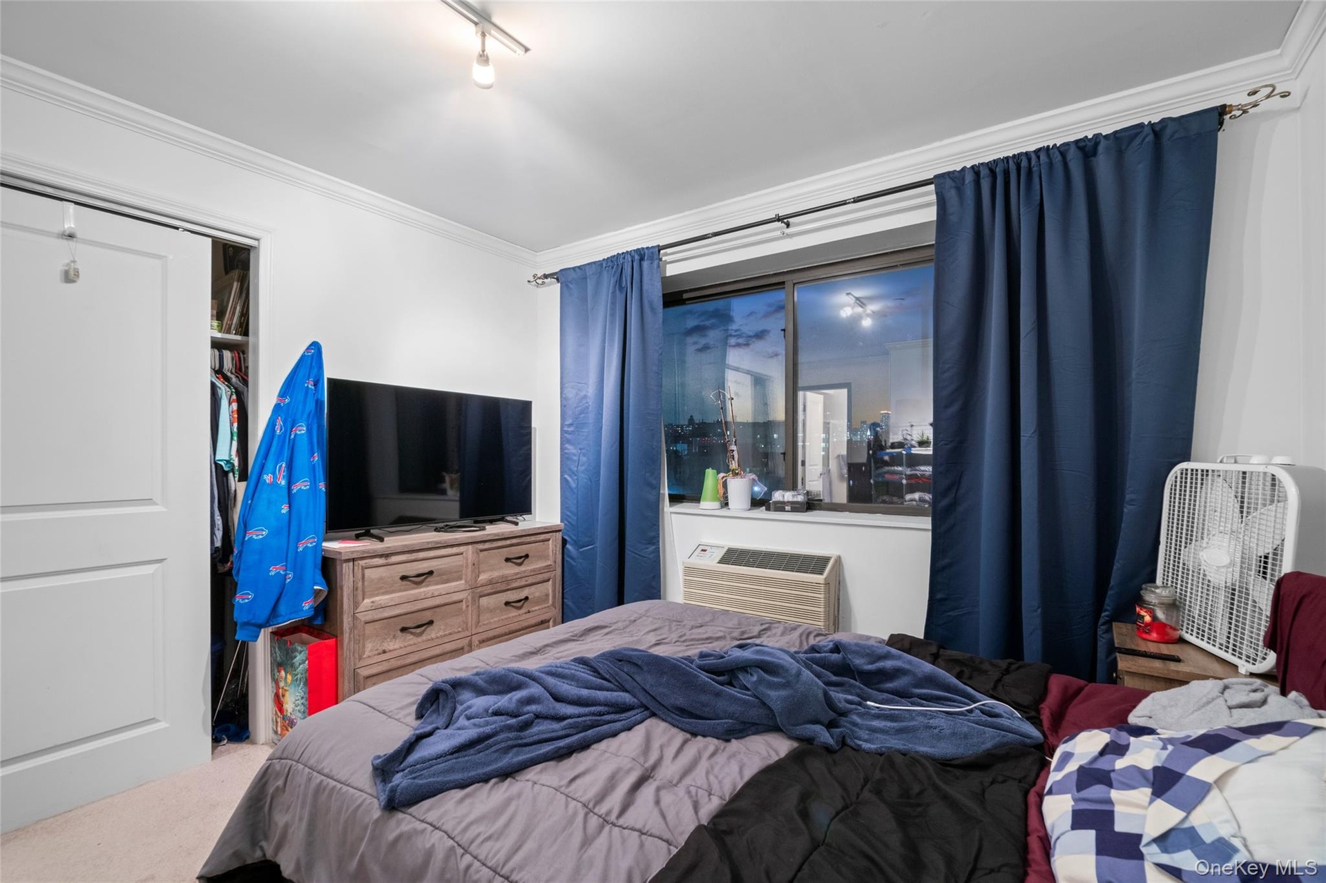 - Carpeted bedroom with crown molding, a closet, and a wall mounted AC