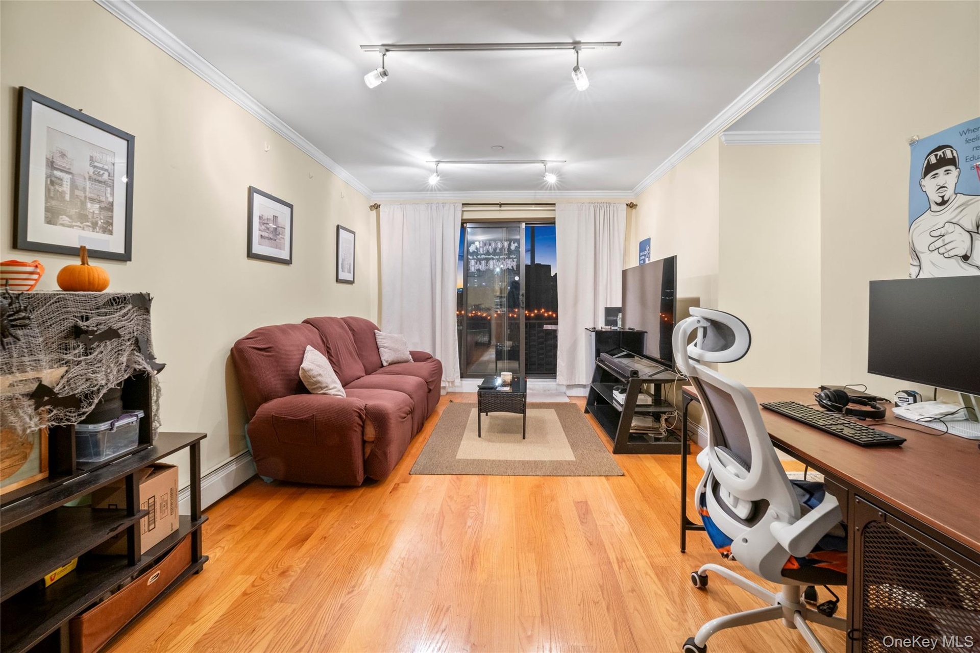 - Living area with an office area, ornamental molding, rail lighting, light wood finished floors, and attic access