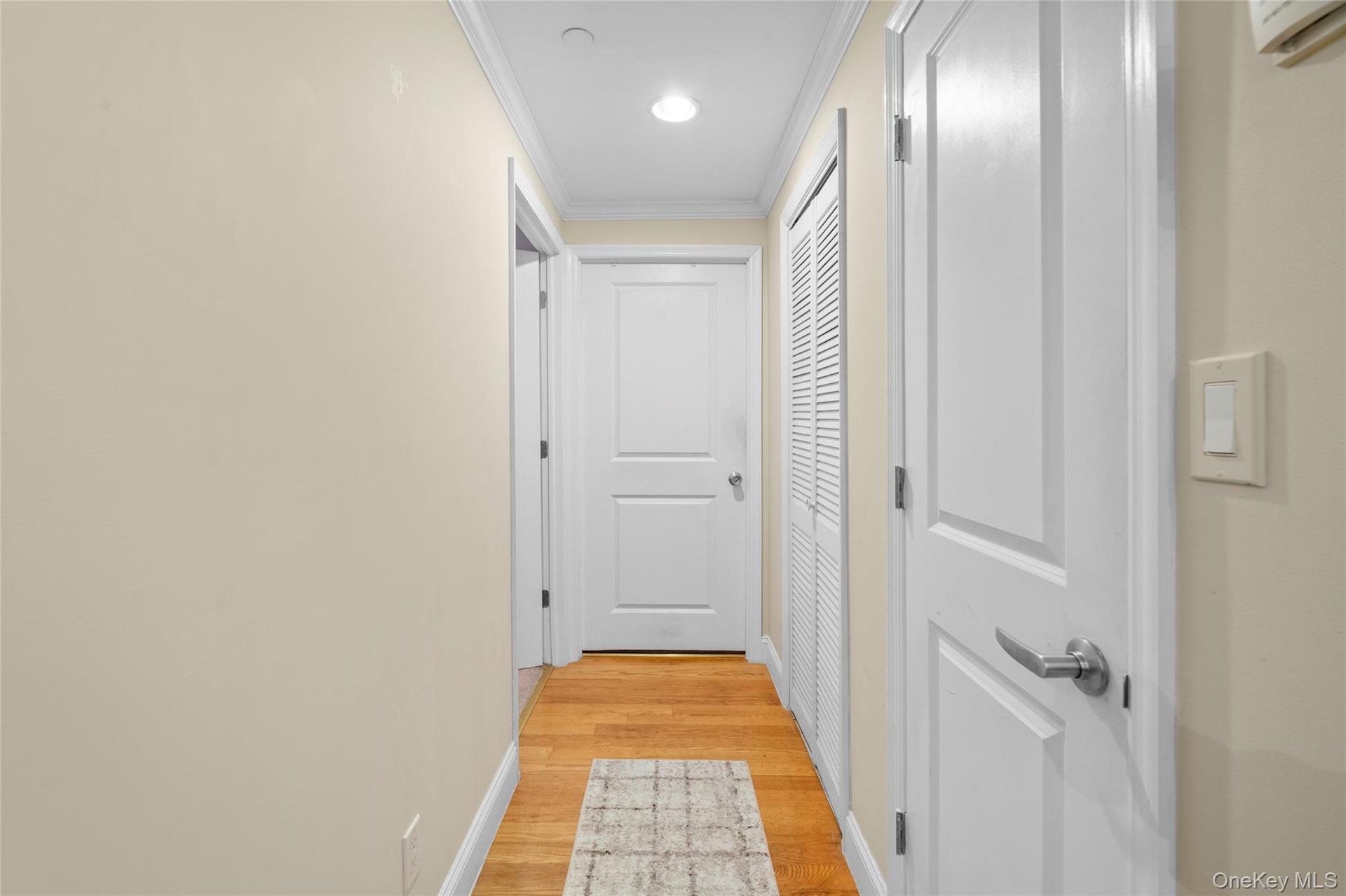 - Hallway with light wood-style flooring, crown molding, and recessed lighting