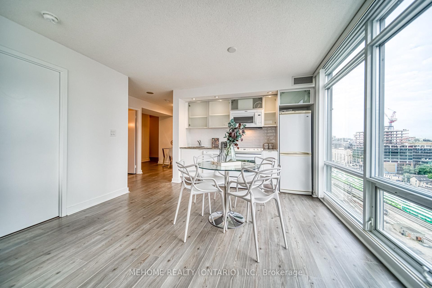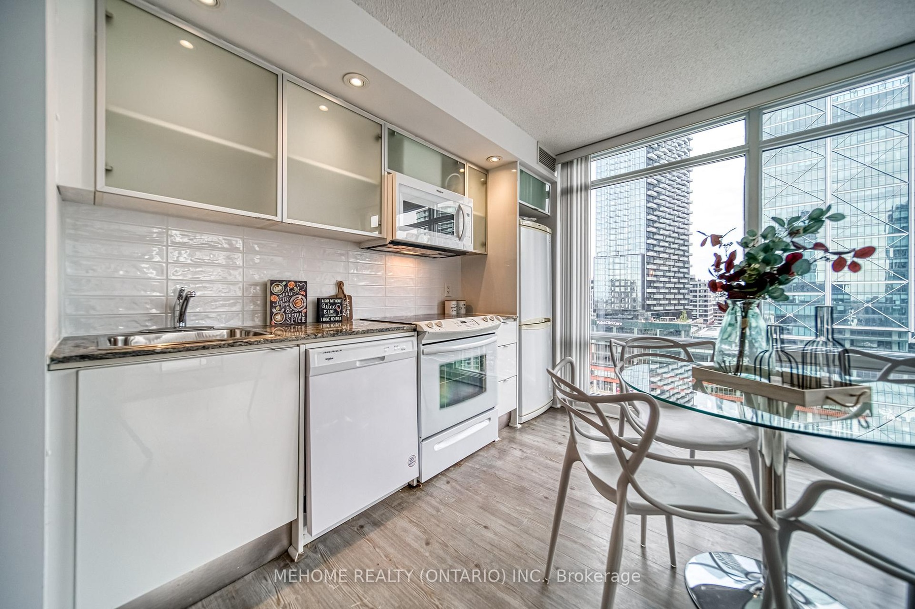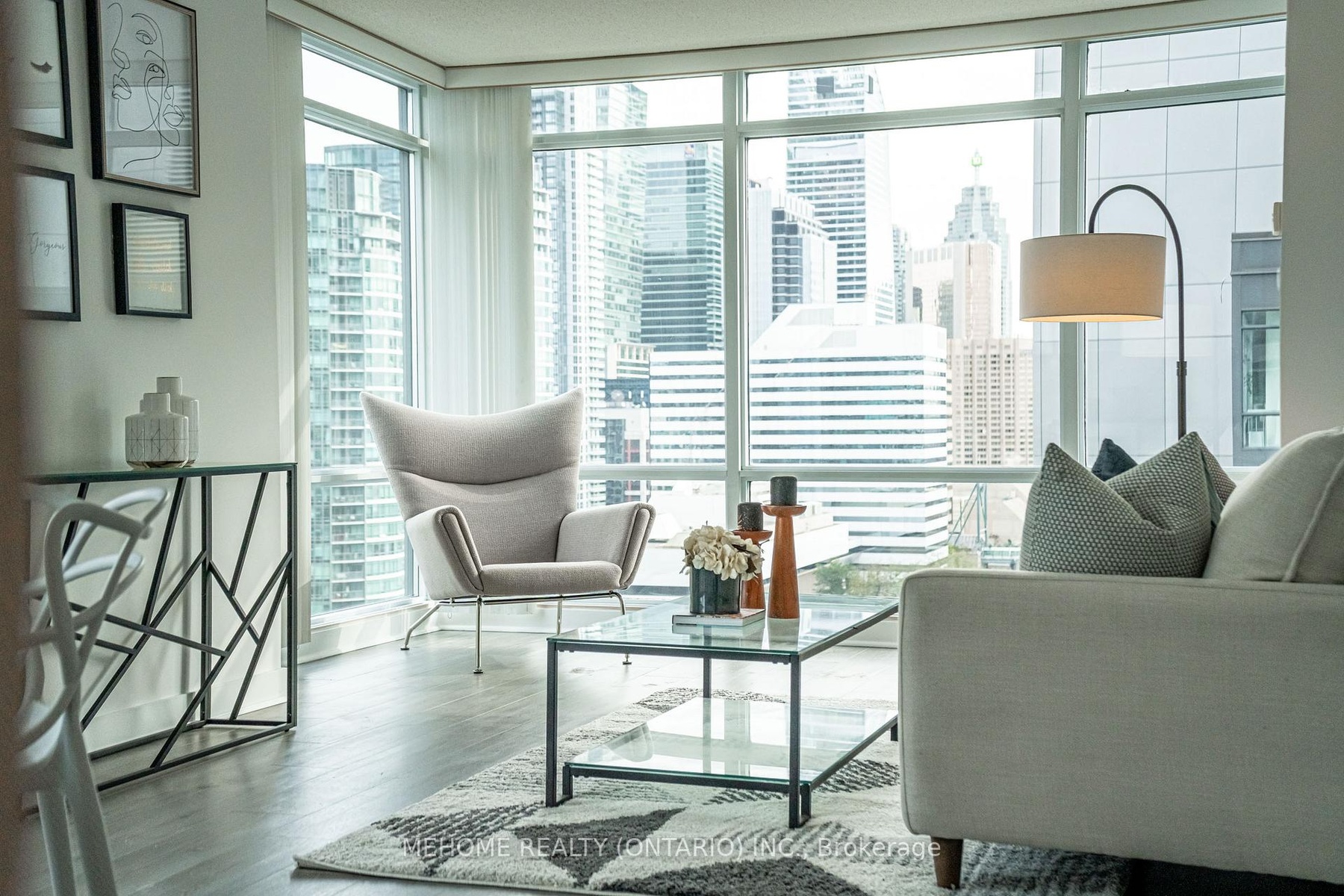 Montage at CityPlace! Enjoy a spectacular 270 view of the city from this bright and spacious 933 sq. ft. corner suite with a full-size balcony! Floor-to-ceiling windows fill the unit with natural light, while the functional split-bedroom layout and open-concept living area create the perfect space for both relaxation and entertaining.Featuring 2 bedrooms, 2 bathrooms, and a versatile open-concept den/study, this thoughtfully designed layout is ideal for comfortable living and working from home. The primary bedroom offers a double closet and 4-piece ensuite, while the second bedroom boasts floor-to-ceiling windows and a double closet overlooking the balcony. Enjoy the convenience of ensuite laundry with a full-size stacked washer and dryer, A stylish new kitchen backsplash, and updated appliances including a microwave with range hood (2023), dishwasher (2023), and fridge (2025). Luxury building with resort-style amenities including an indoor pool, hot tub, gym, theater, outdoor lounge, BBQ area, guest suites, and more. Direct underground access to Sobeys Market for everyday convenience.Steps to Harbourfront, CN Tower, Rogers Centre, The Well, transit, restaurants, and shops. Includes 1 parking space and 1 locker.