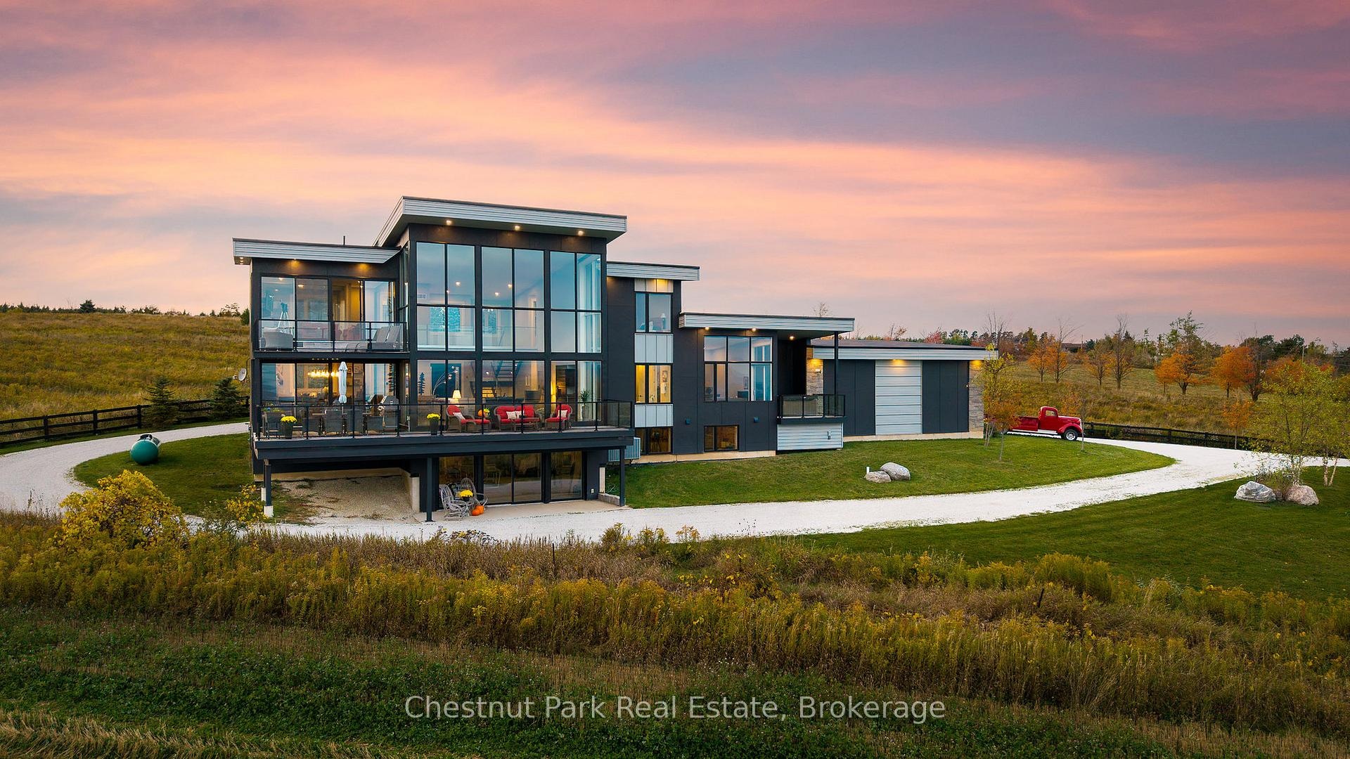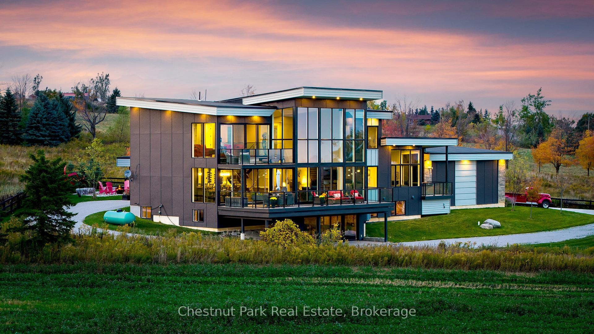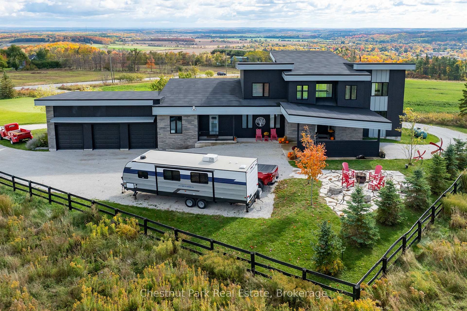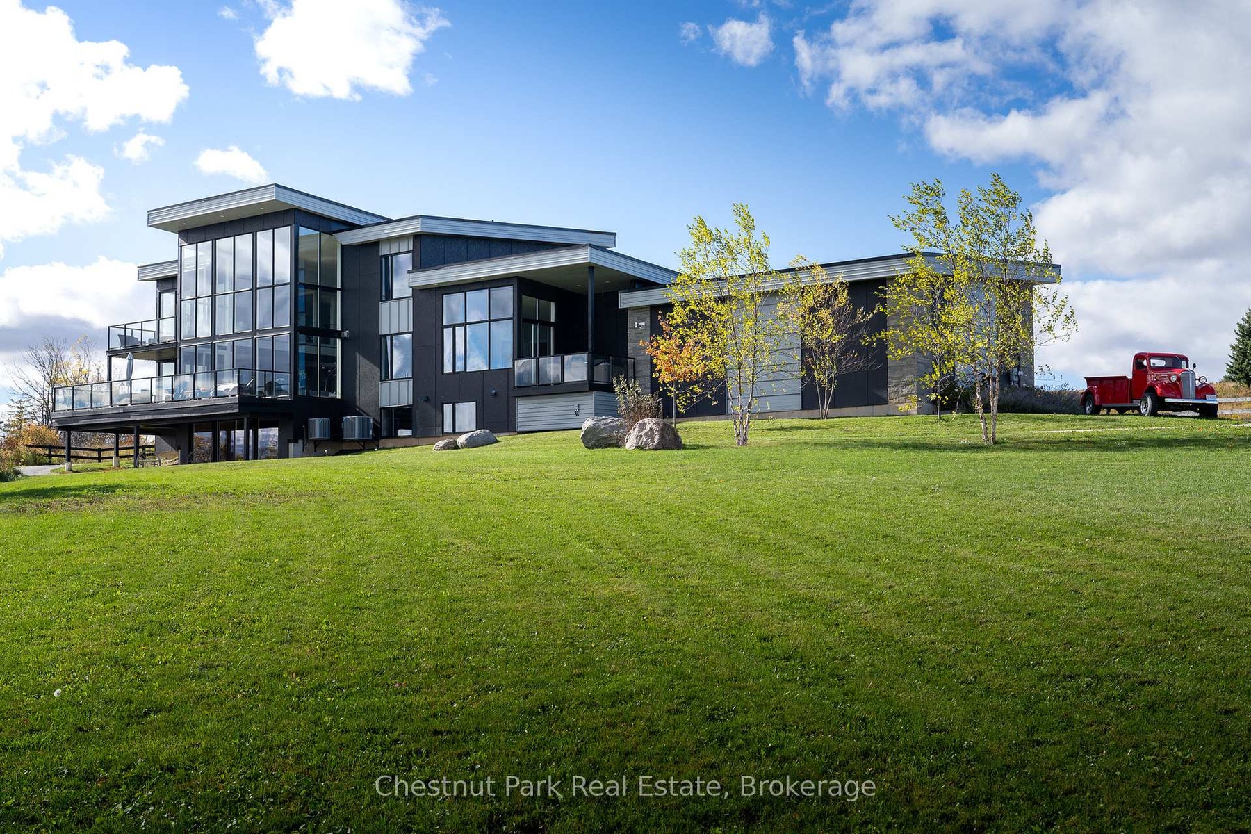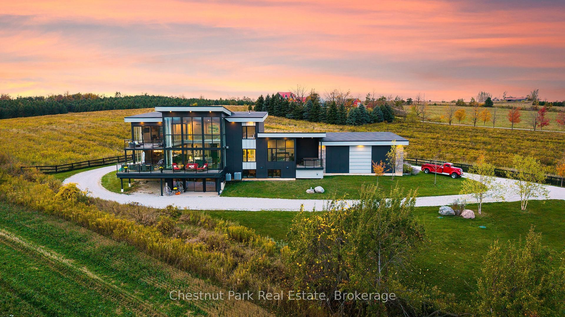Architectural glass, steel, and panoramic views define this modern masterpiece overlooking the village of Creemore. Built in 2019 and set on 1.4 acres, this 4-bedroom, 3-bath home offers approximately 4,000 sq. ft. of finished living space with 180-degree vistas over the Creemore Hills, reaching to Alliston and Barrie. The striking design features steel beams, opposing rooflines, and floor-to-ceiling Dashwood windows that flood the interiors with light and frame the valley's ever-changing skies-from golden sunsets to the incredible canopy of stars above. Elevated above the village and free from city glow, this is a stargazer's dream home, where the night sky feels within reach through expansive glass walls. The chef's kitchen includes Cabneato custom cabinetry, quartz countertops, a 6'x10' wormy maple island, KitchenAid double ovens, 5-burner cooktop, and a 54" Frigidaire Professional fridge/freezer. A butler's pantry adds additional prep and storage space. Dark maple hardwood floors, designer lighting, and heated tile baths bring warmth to the modern aesthetic. The insulated, metal-lined four-car garage with gas heat, insulated doors, and hot/cold water is ideal for collectors. Durable Hardie board exterior and a solid drilled well ensure low-maintenance, worry-free living. Importantly, both this property and the adjacent 1.82-acre lot (available separately) are not subject to NEC or NVCA regulation, allowing for future additions like a pool, tennis court, or guest house with far fewer approvals required. Just minutes from Creemore's shops and restaurants, and 15 minutes to Collingwood, Devil's Glen, and Mad River Golf Club. A rare combination of architecture, freedom, and breathtaking views.