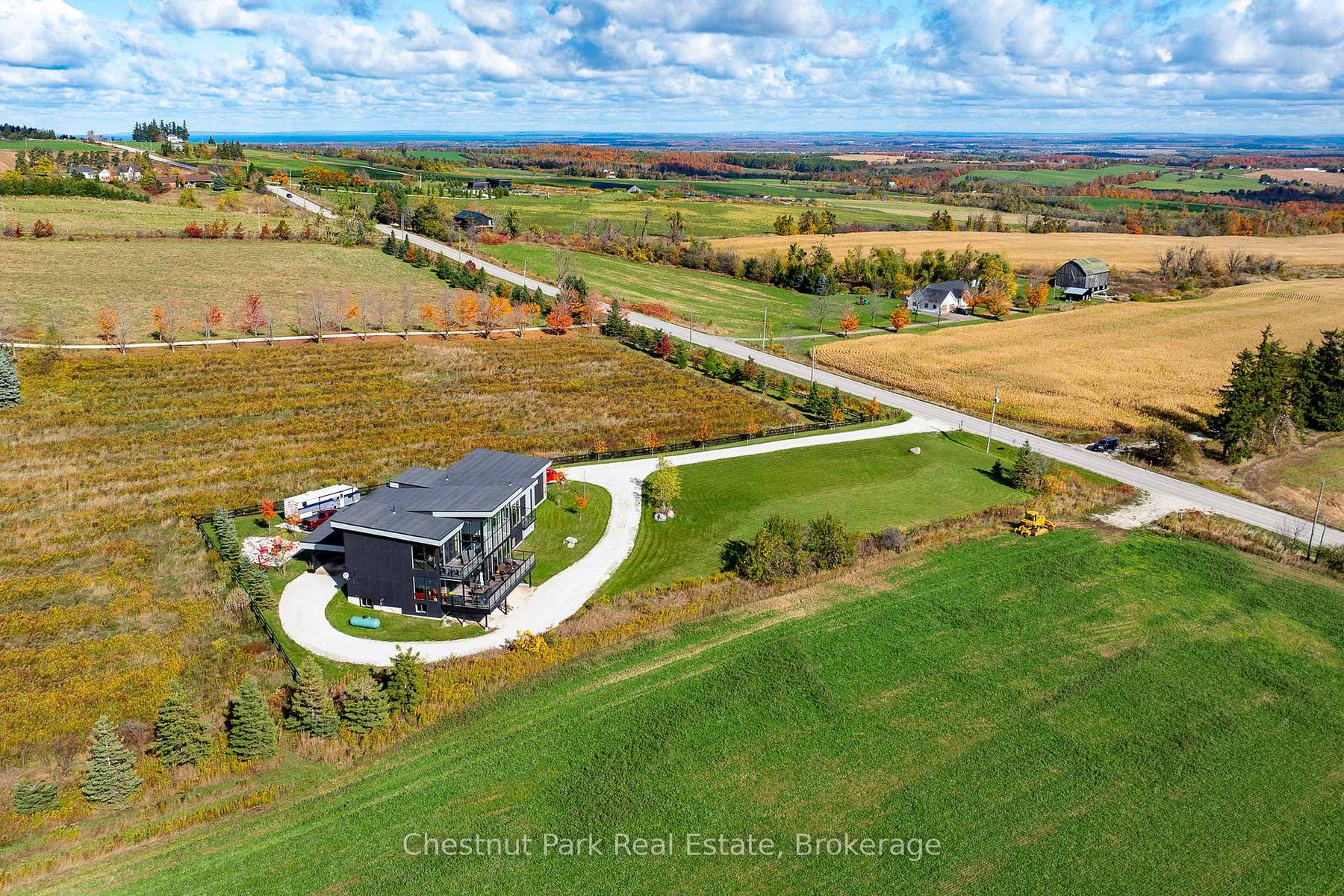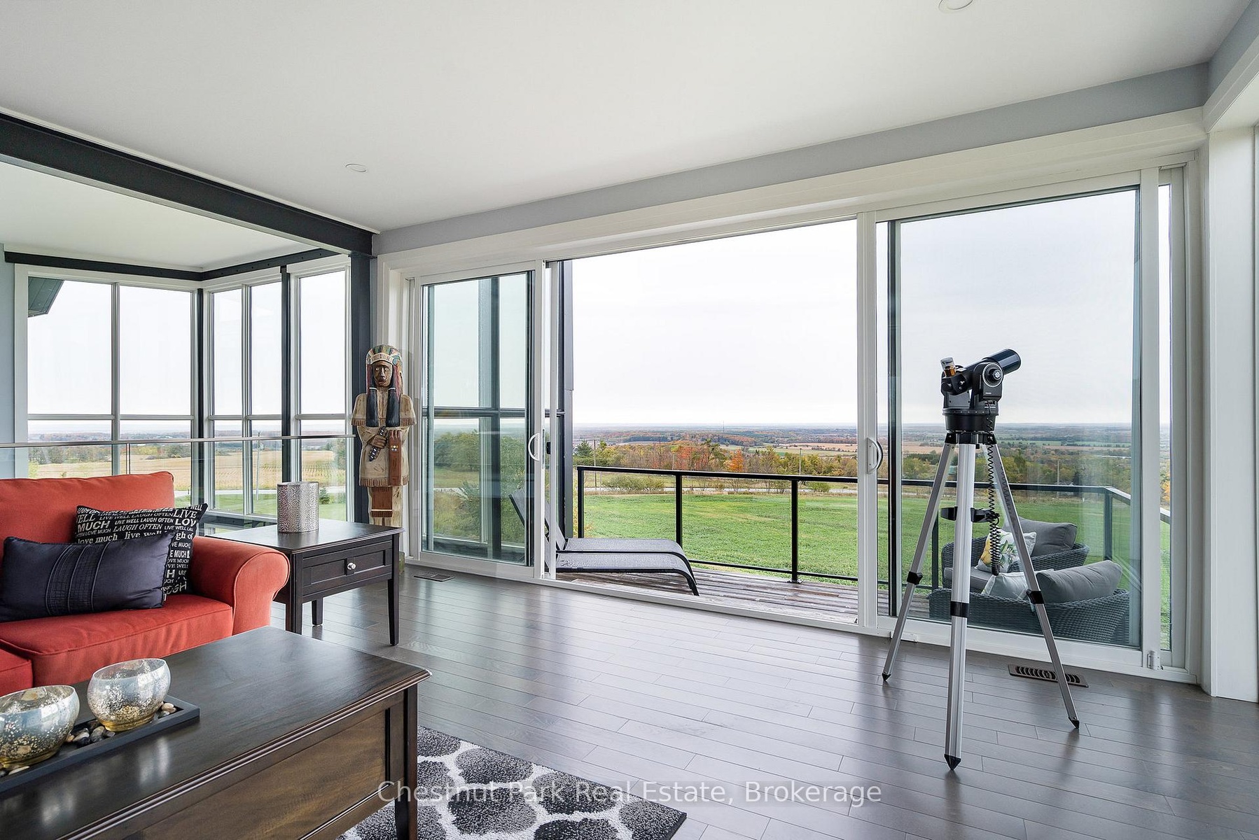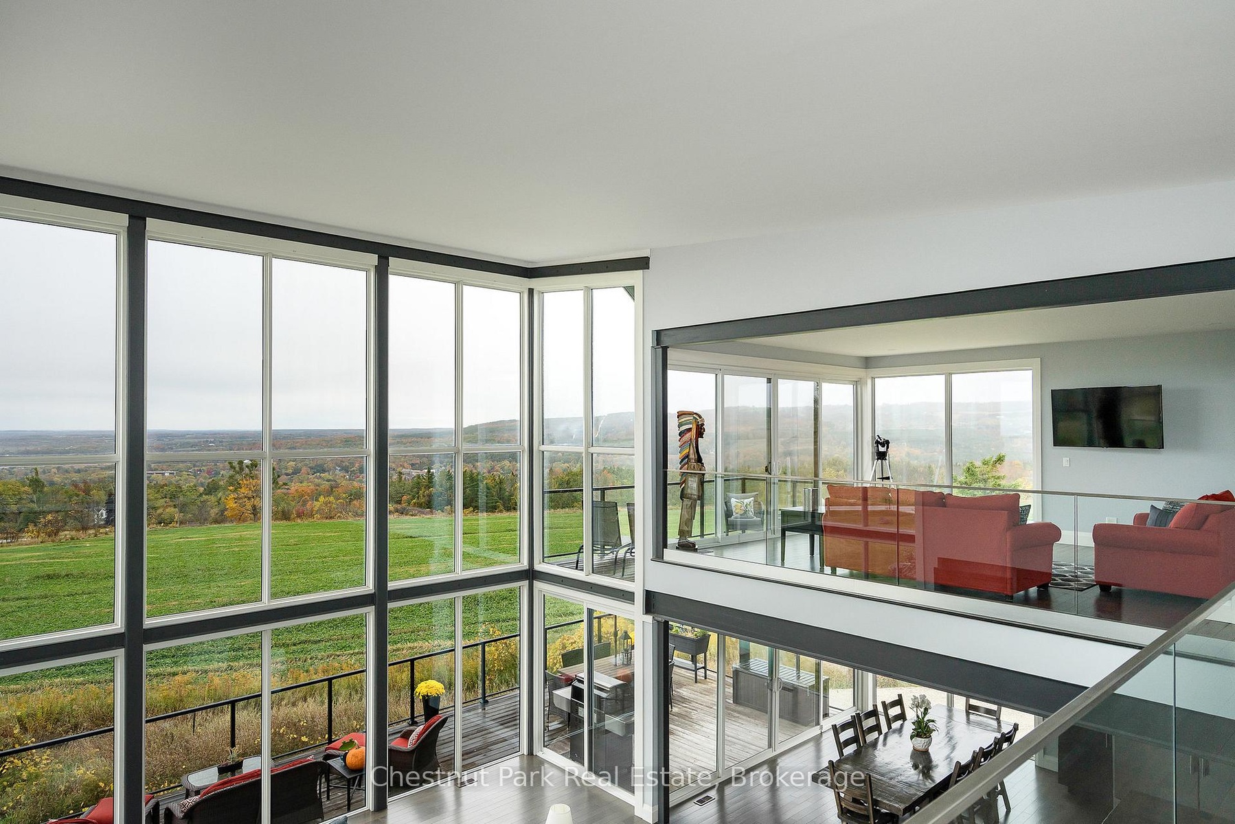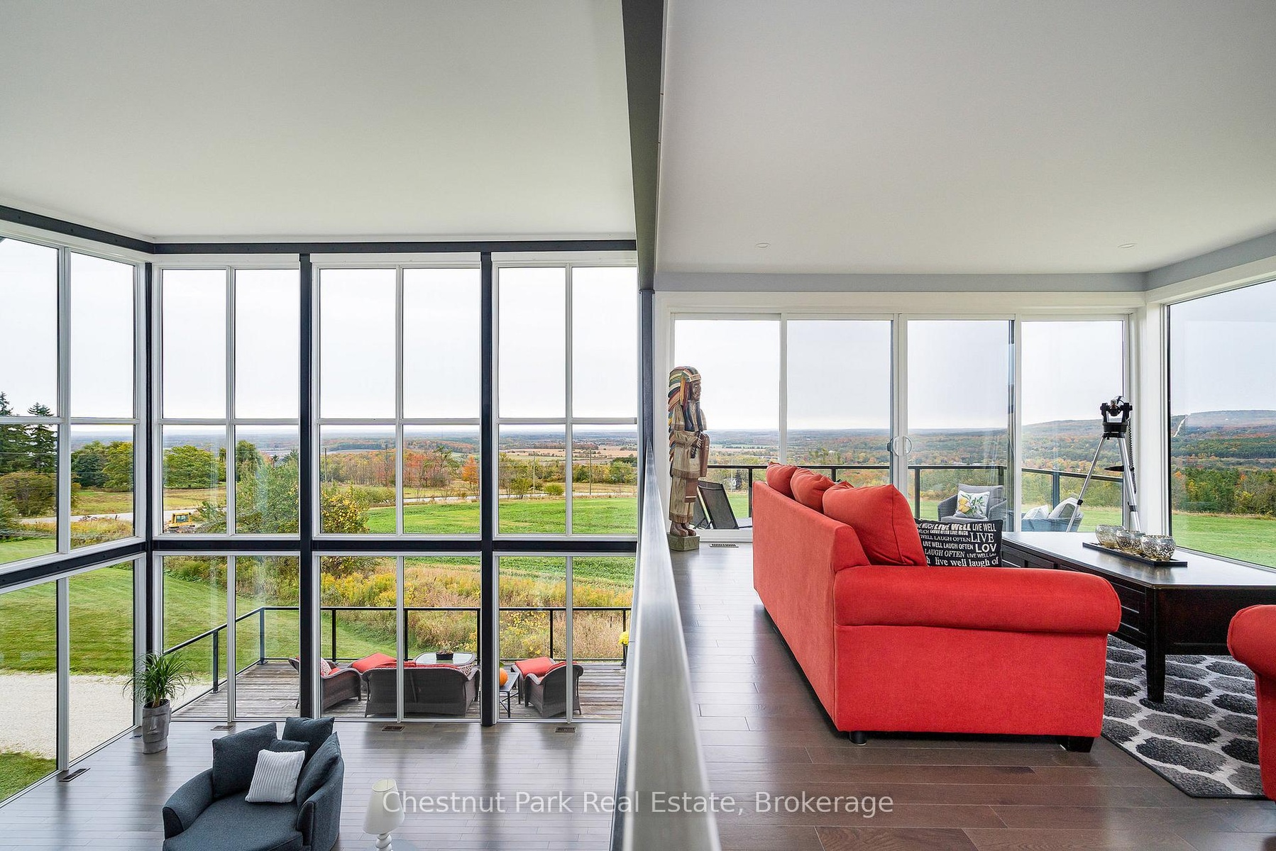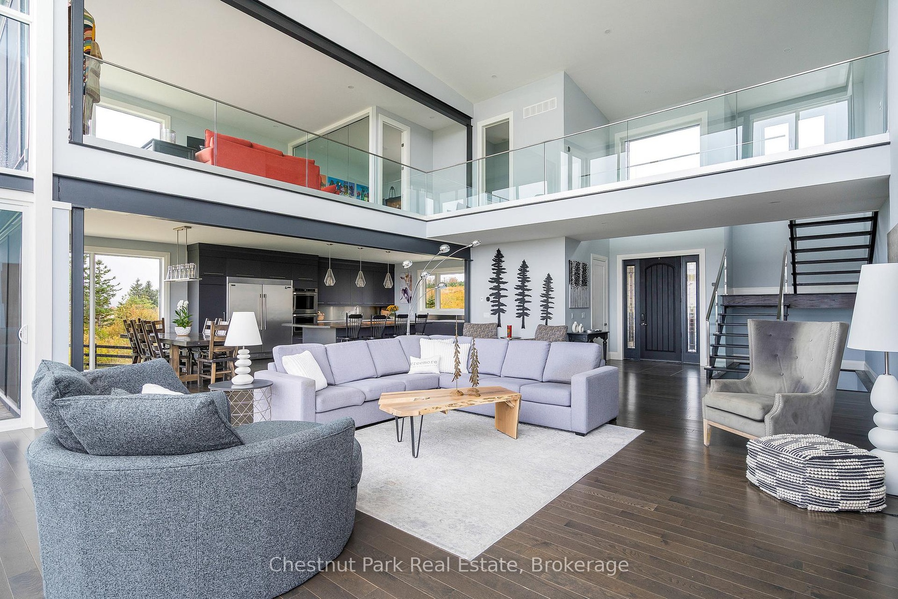 Architectural glass, steel, and panoramic views define this modern masterpiece overlooking the village of Creemore. Built in 2019 and set on 1.4 acres, this 4-bedroom, 3-bath home offers approximately 4,000 sq. ft. of finished living space with 180-degree vistas over the Creemore Hills, reaching to Alliston and Barrie. The striking design features steel beams, opposing rooflines, and floor-to-ceiling Dashwood windows that flood the interiors with light and frame the valley's ever-changing skies-from golden sunsets to the incredible canopy of stars above. Elevated above the village and free from city glow, this is a stargazer's dream home, where the night sky feels within reach through expansive glass walls. The chef's kitchen includes Cabneato custom cabinetry, quartz countertops, a 6'x10' wormy maple island, KitchenAid double ovens, 5-burner cooktop, and a 54" Frigidaire Professional fridge/freezer. A butler's pantry adds additional prep and storage space. Dark maple hardwood floors, designer lighting, and heated tile baths bring warmth to the modern aesthetic. The insulated, metal-lined four-car garage with gas heat, insulated doors, and hot/cold water is ideal for collectors. Durable Hardie board exterior and a solid drilled well ensure low-maintenance, worry-free living. Importantly, both this property and the adjacent 1.82-acre lot (available separately) are not subject to NEC or NVCA regulation, allowing for future additions like a pool, tennis court, or guest house with far fewer approvals required. Just minutes from Creemore's shops and restaurants, and 15 minutes to Collingwood, Devil's Glen, and Mad River Golf Club. A rare combination of architecture, freedom, and breathtaking views.