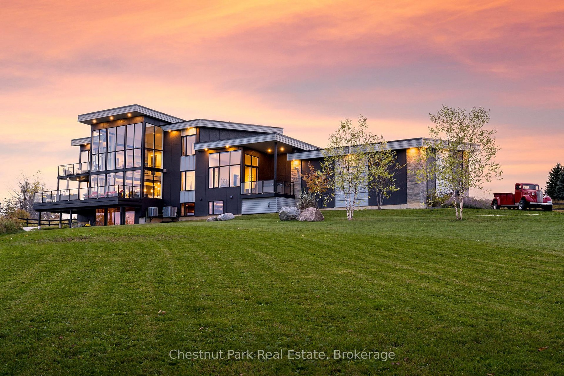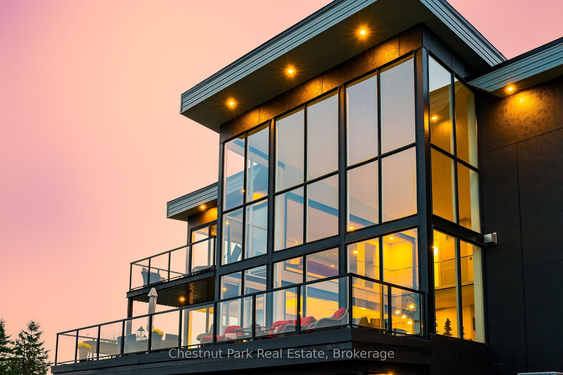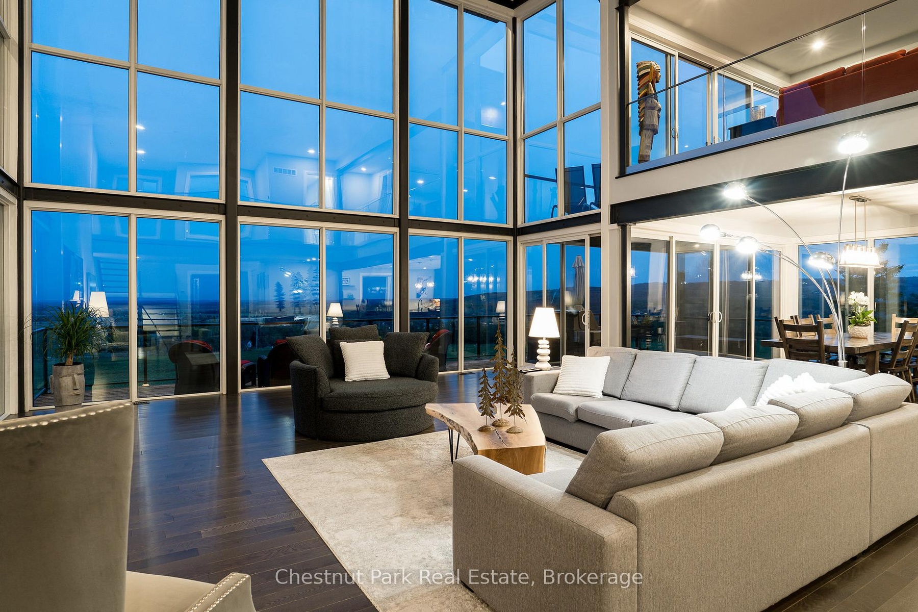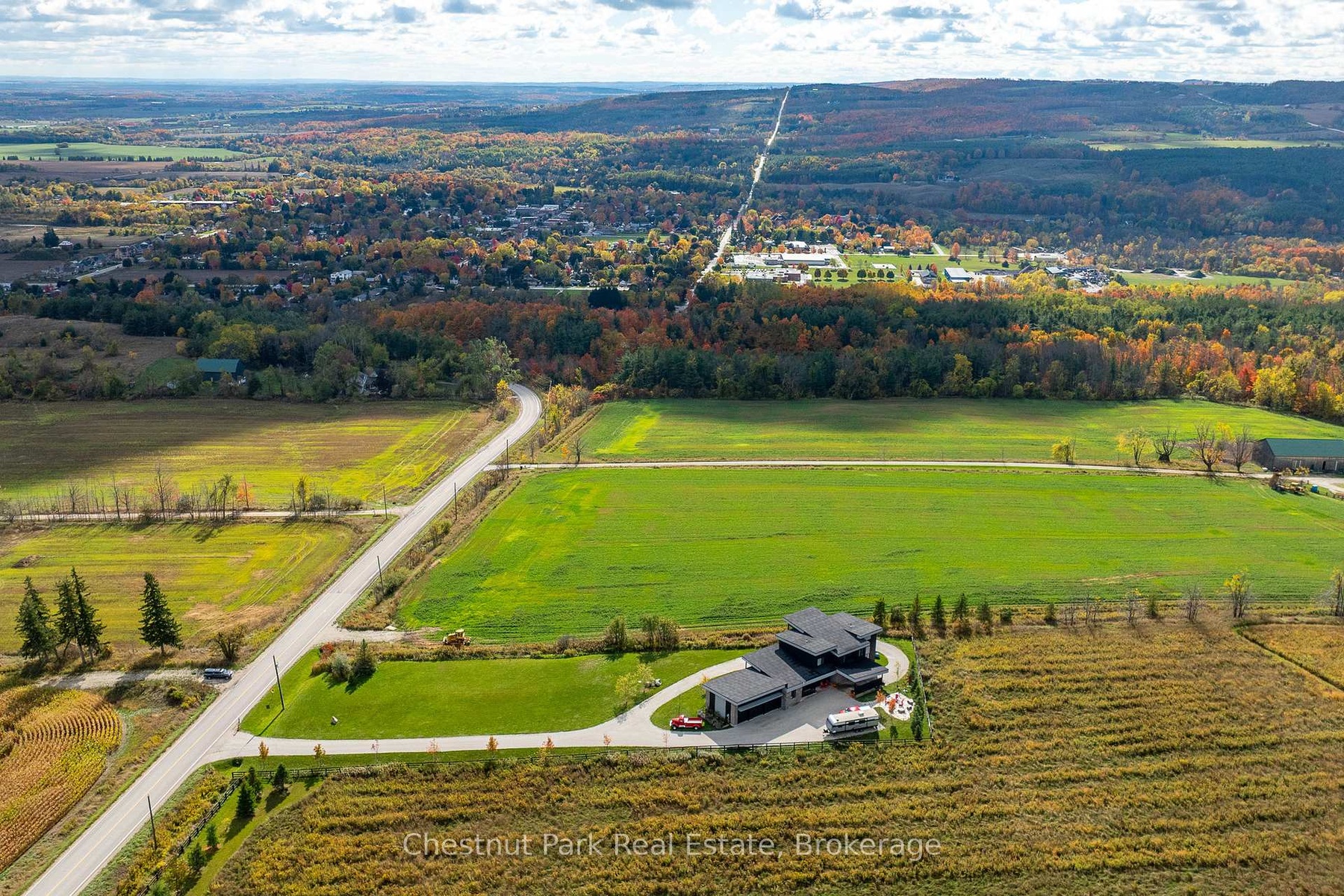 Architectural glass, steel, and panoramic views define this modern masterpiece overlooking the village of Creemore. Built in 2019 and set on 1.4 acres, this 4-bedroom, 3-bath home offers approximately 4,000 sq. ft. of finished living space with 180-degree vistas over the Creemore Hills, reaching to Alliston and Barrie. The striking design features steel beams, opposing rooflines, and floor-to-ceiling Dashwood windows that flood the interiors with light and frame the valley's ever-changing skies-from golden sunsets to the incredible canopy of stars above. Elevated above the village and free from city glow, this is a stargazer's dream home, where the night sky feels within reach through expansive glass walls. The chef's kitchen includes Cabneato custom cabinetry, quartz countertops, a 6'x10' wormy maple island, KitchenAid double ovens, 5-burner cooktop, and a 54" Frigidaire Professional fridge/freezer. A butler's pantry adds additional prep and storage space. Dark maple hardwood floors, designer lighting, and heated tile baths bring warmth to the modern aesthetic. The insulated, metal-lined four-car garage with gas heat, insulated doors, and hot/cold water is ideal for collectors. Durable Hardie board exterior and a solid drilled well ensure low-maintenance, worry-free living. Importantly, both this property and the adjacent 1.82-acre lot (available separately) are not subject to NEC or NVCA regulation, allowing for future additions like a pool, tennis court, or guest house with far fewer approvals required. Just minutes from Creemore's shops and restaurants, and 15 minutes to Collingwood, Devil's Glen, and Mad River Golf Club. A rare combination of architecture, freedom, and breathtaking views.