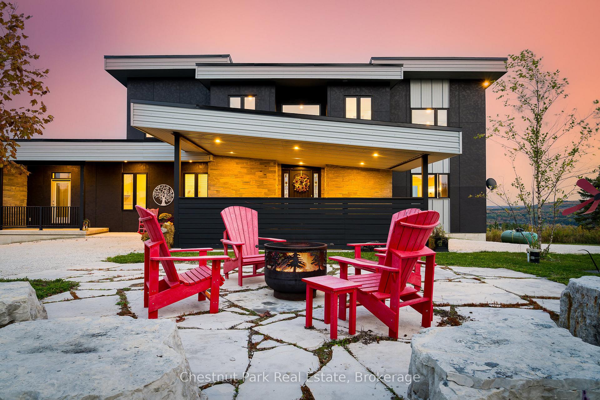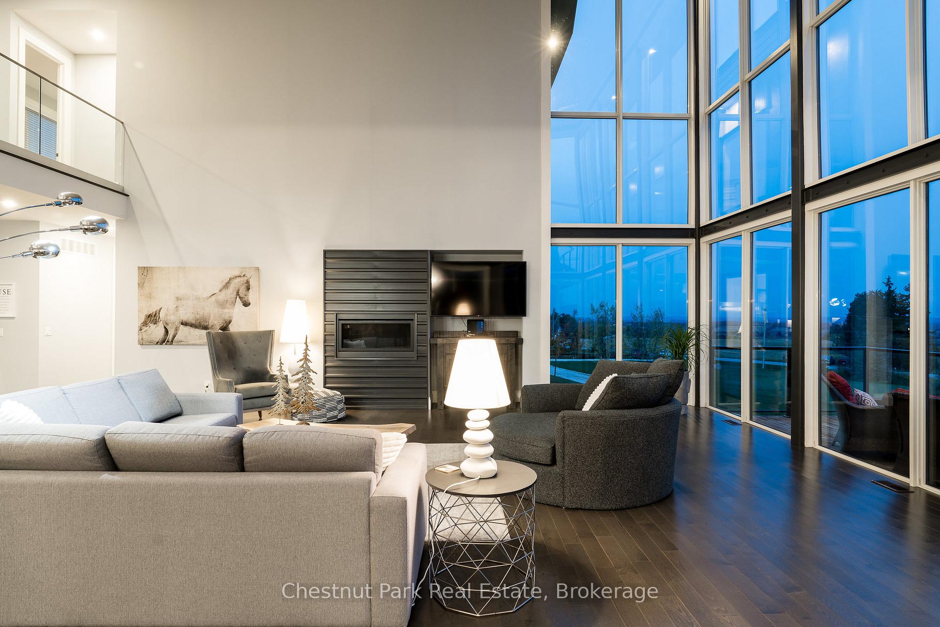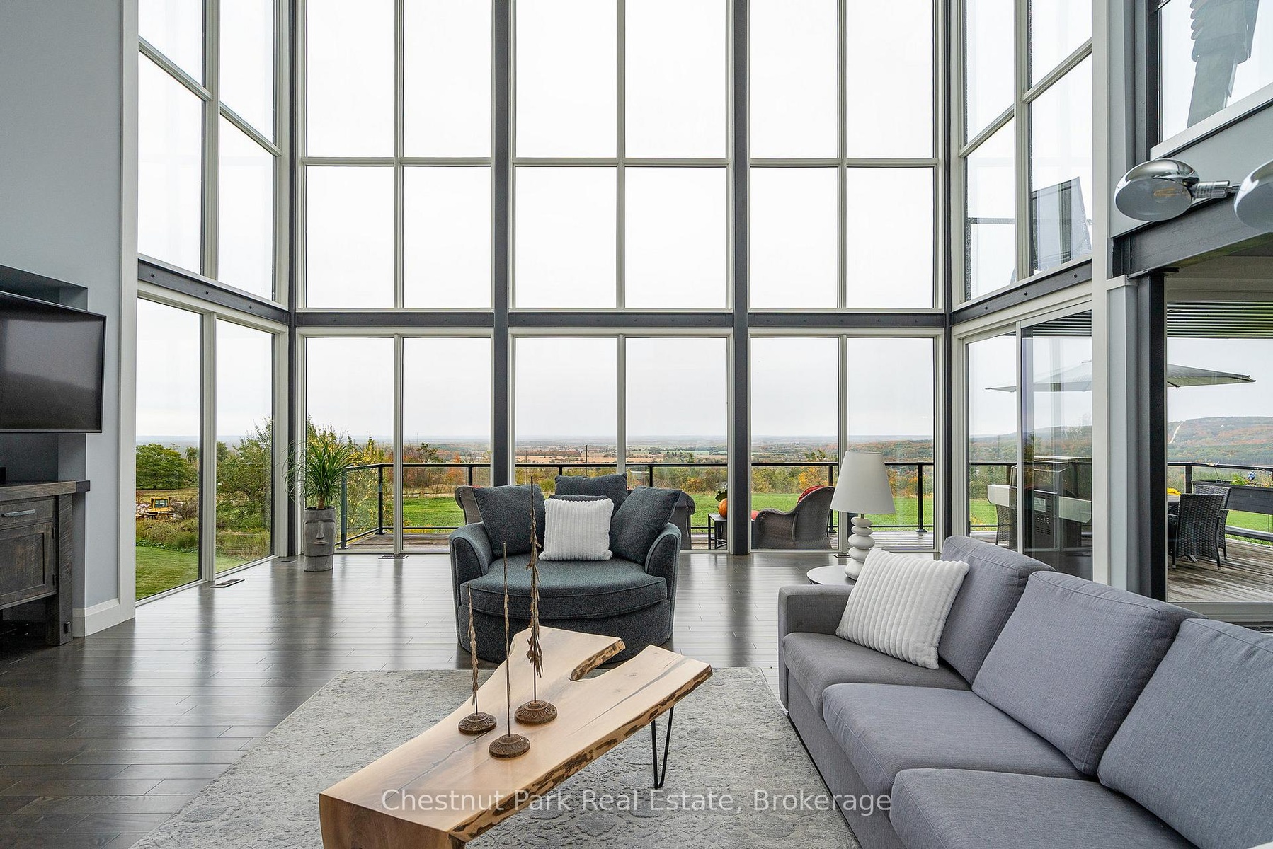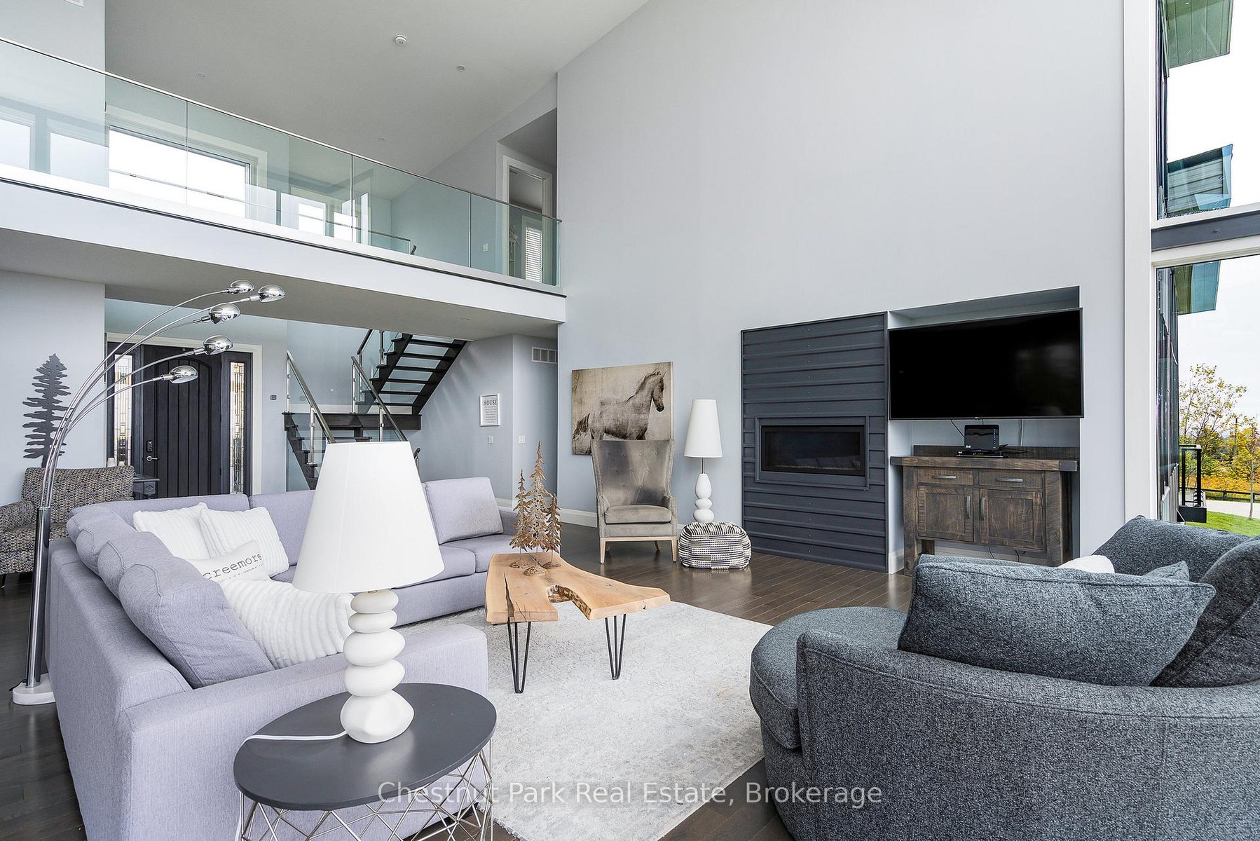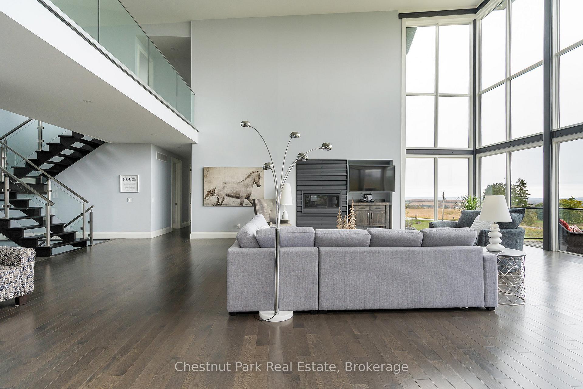 Architectural glass, steel, and panoramic views define this modern masterpiece overlooking the village of Creemore. Built in 2019 and set on 1.4 acres, this 4-bedroom, 3-bath home offers approximately 4,000 sq. ft. of finished living space with 180-degree vistas over the Creemore Hills, reaching to Alliston and Barrie. The striking design features steel beams, opposing rooflines, and floor-to-ceiling Dashwood windows that flood the interiors with light and frame the valley's ever-changing skies-from golden sunsets to the incredible canopy of stars above. Elevated above the village and free from city glow, this is a stargazer's dream home, where the night sky feels within reach through expansive glass walls. The chef's kitchen includes Cabneato custom cabinetry, quartz countertops, a 6'x10' wormy maple island, KitchenAid double ovens, 5-burner cooktop, and a 54" Frigidaire Professional fridge/freezer. A butler's pantry adds additional prep and storage space. Dark maple hardwood floors, designer lighting, and heated tile baths bring warmth to the modern aesthetic. The insulated, metal-lined four-car garage with gas heat, insulated doors, and hot/cold water is ideal for collectors. Durable Hardie board exterior and a solid drilled well ensure low-maintenance, worry-free living. Importantly, both this property and the adjacent 1.82-acre lot (available separately) are not subject to NEC or NVCA regulation, allowing for future additions like a pool, tennis court, or guest house with far fewer approvals required. Just minutes from Creemore's shops and restaurants, and 15 minutes to Collingwood, Devil's Glen, and Mad River Golf Club. A rare combination of architecture, freedom, and breathtaking views.
