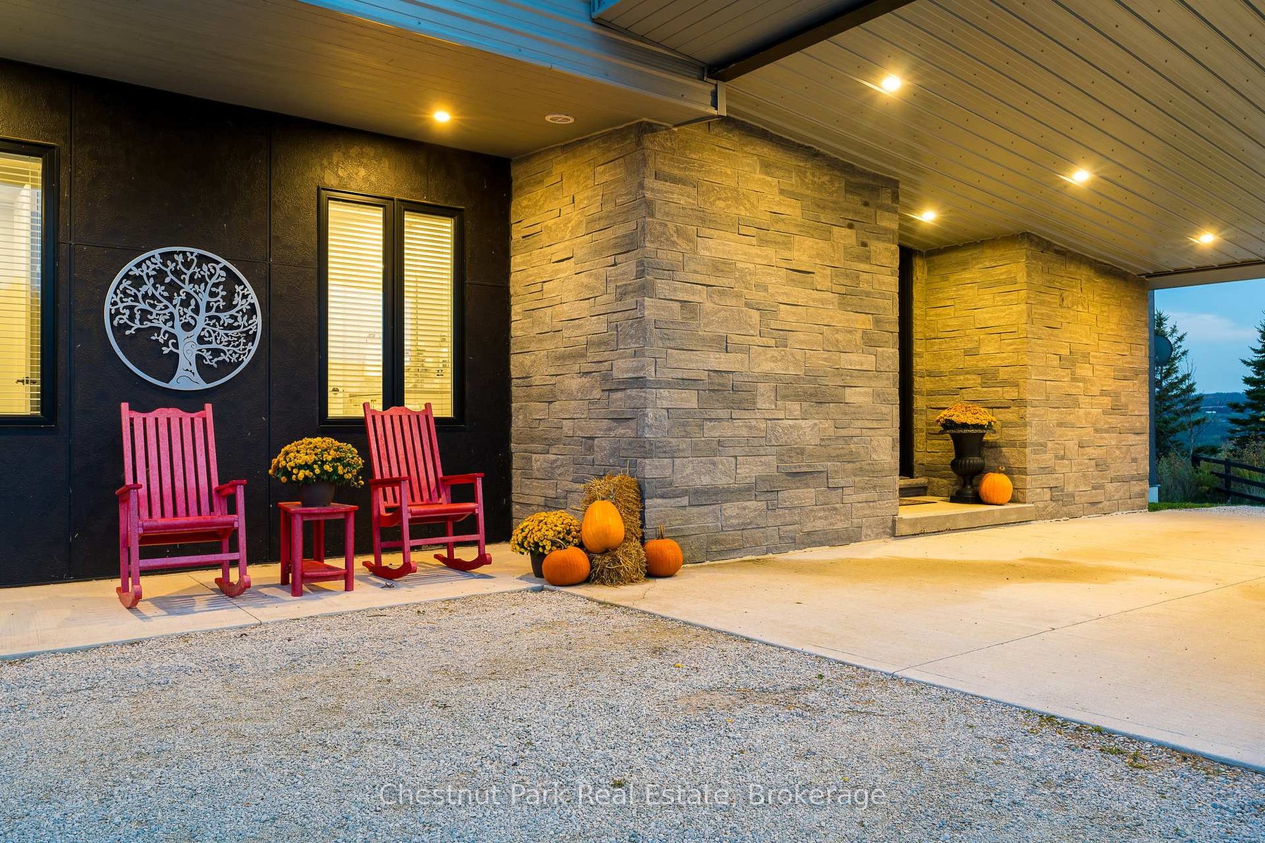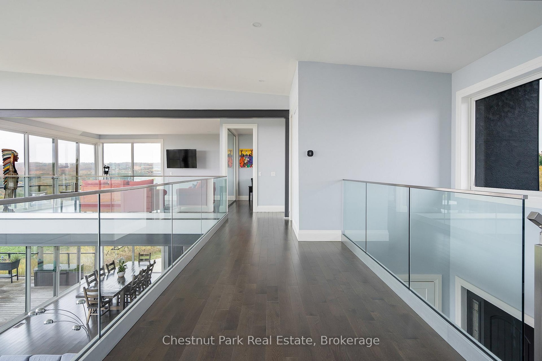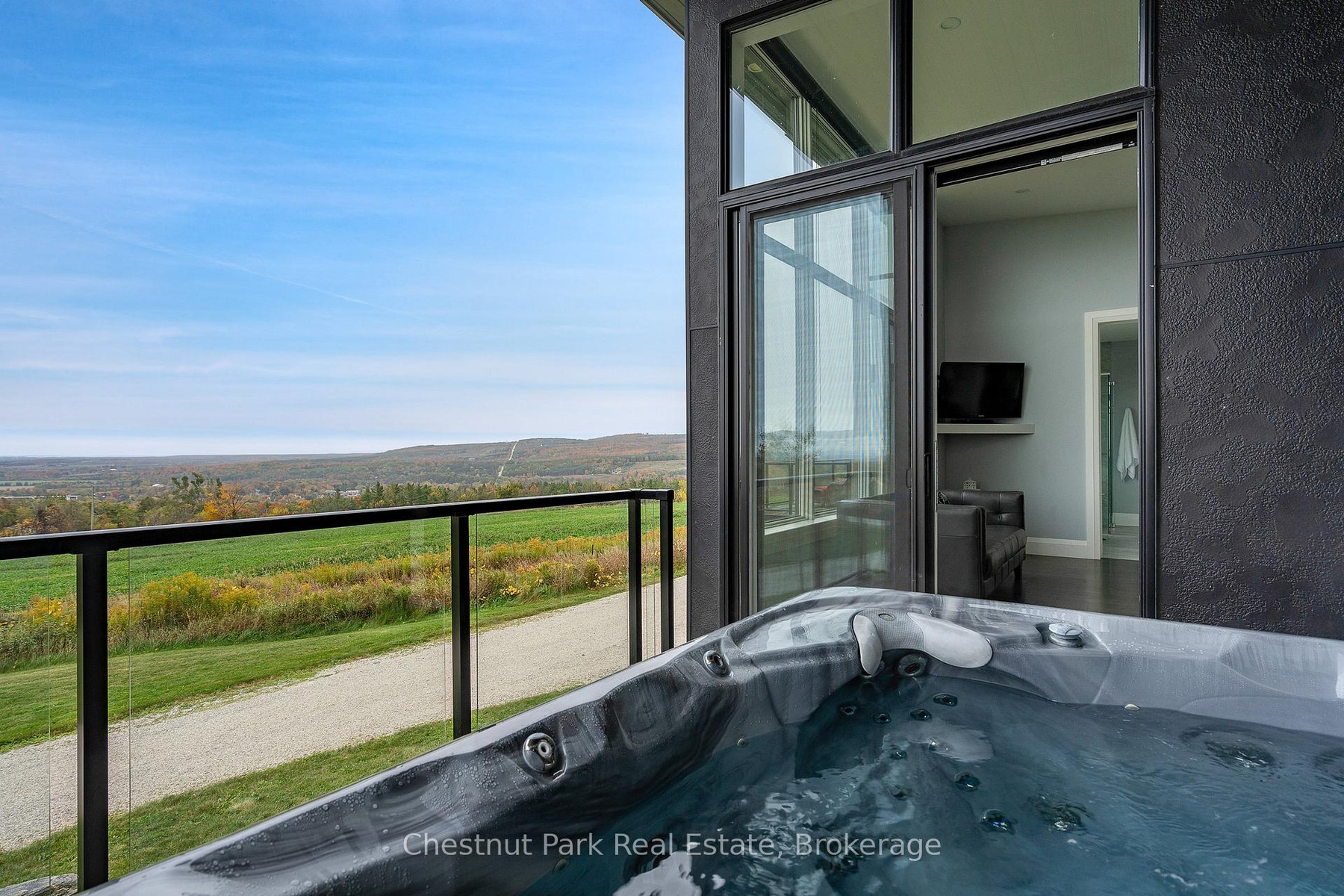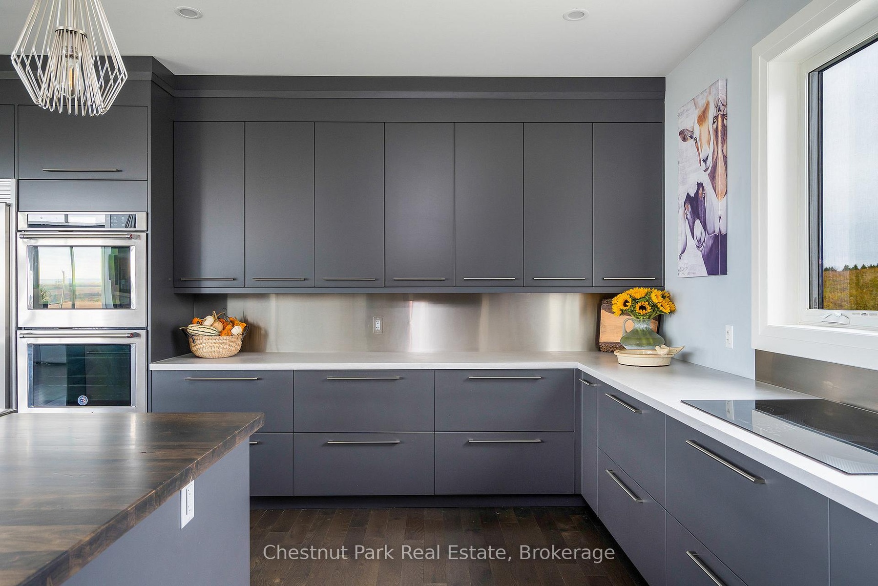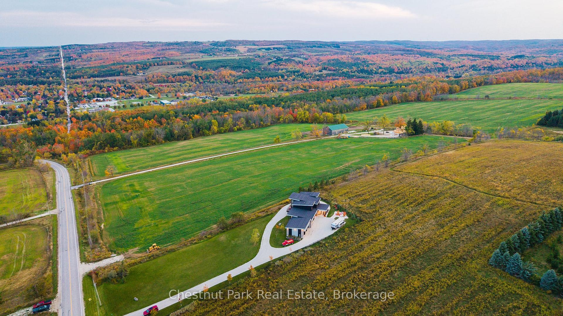 Architectural glass, steel, and panoramic views define this modern masterpiece overlooking the village of Creemore. Built in 2019 and set on 1.4 acres, this 4-bedroom, 3-bath home offers approximately 4,000 sq. ft. of finished living space with 180-degree vistas over the Creemore Hills, reaching to Alliston and Barrie. The striking design features steel beams, opposing rooflines, and floor-to-ceiling Dashwood windows that flood the interiors with light and frame the valley's ever-changing skies-from golden sunsets to the incredible canopy of stars above. Elevated above the village and free from city glow, this is a stargazer's dream home, where the night sky feels within reach through expansive glass walls. The chef's kitchen includes Cabneato custom cabinetry, quartz countertops, a 6'x10' wormy maple island, KitchenAid double ovens, 5-burner cooktop, and a 54" Frigidaire Professional fridge/freezer. A butler's pantry adds additional prep and storage space. Dark maple hardwood floors, designer lighting, and heated tile baths bring warmth to the modern aesthetic. The insulated, metal-lined four-car garage with gas heat, insulated doors, and hot/cold water is ideal for collectors. Durable Hardie board exterior and a solid drilled well ensure low-maintenance, worry-free living. Importantly, both this property and the adjacent 1.82-acre lot (available separately) are not subject to NEC or NVCA regulation, allowing for future additions like a pool, tennis court, or guest house with far fewer approvals required. Just minutes from Creemore's shops and restaurants, and 15 minutes to Collingwood, Devil's Glen, and Mad River Golf Club. A rare combination of architecture, freedom, and breathtaking views.