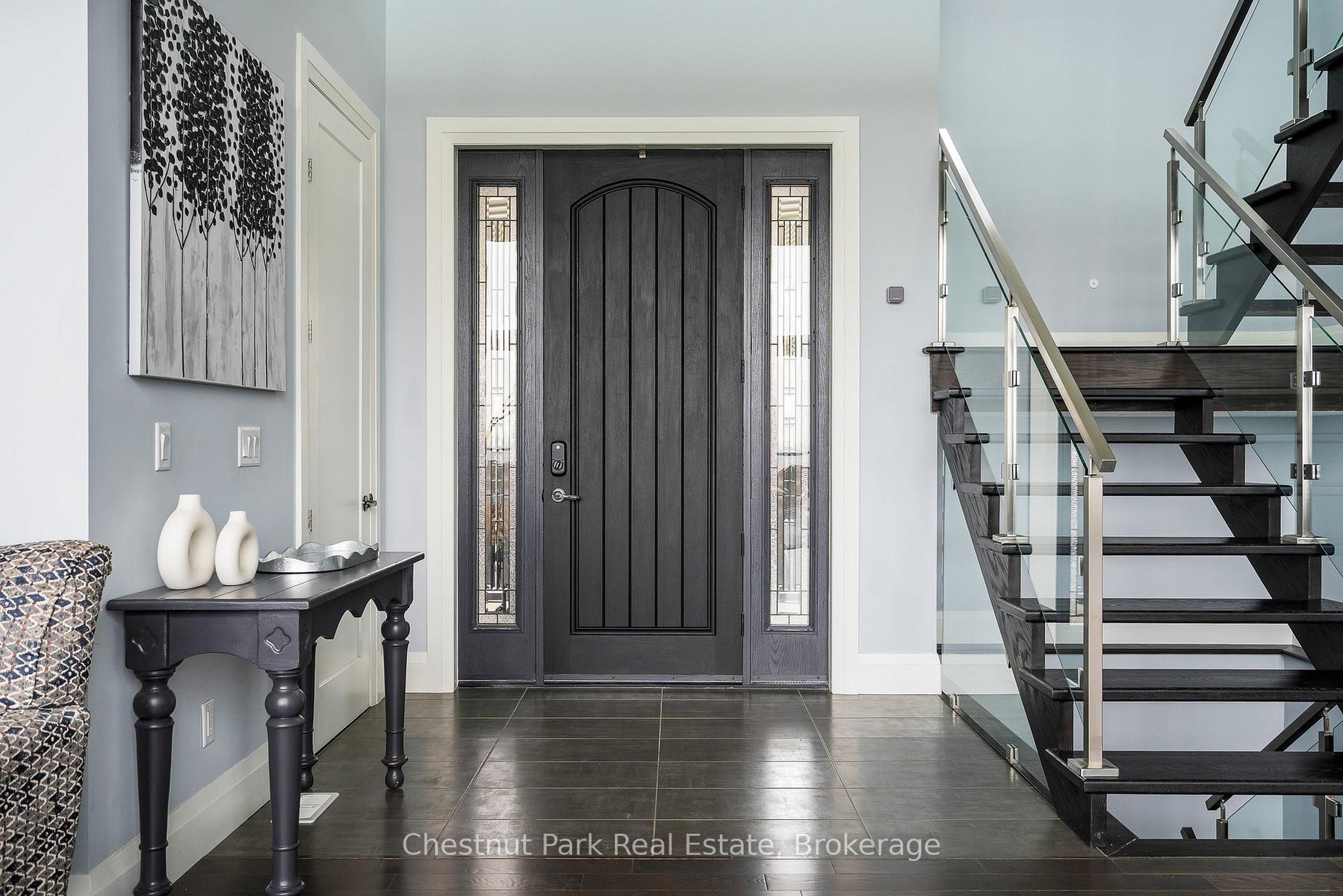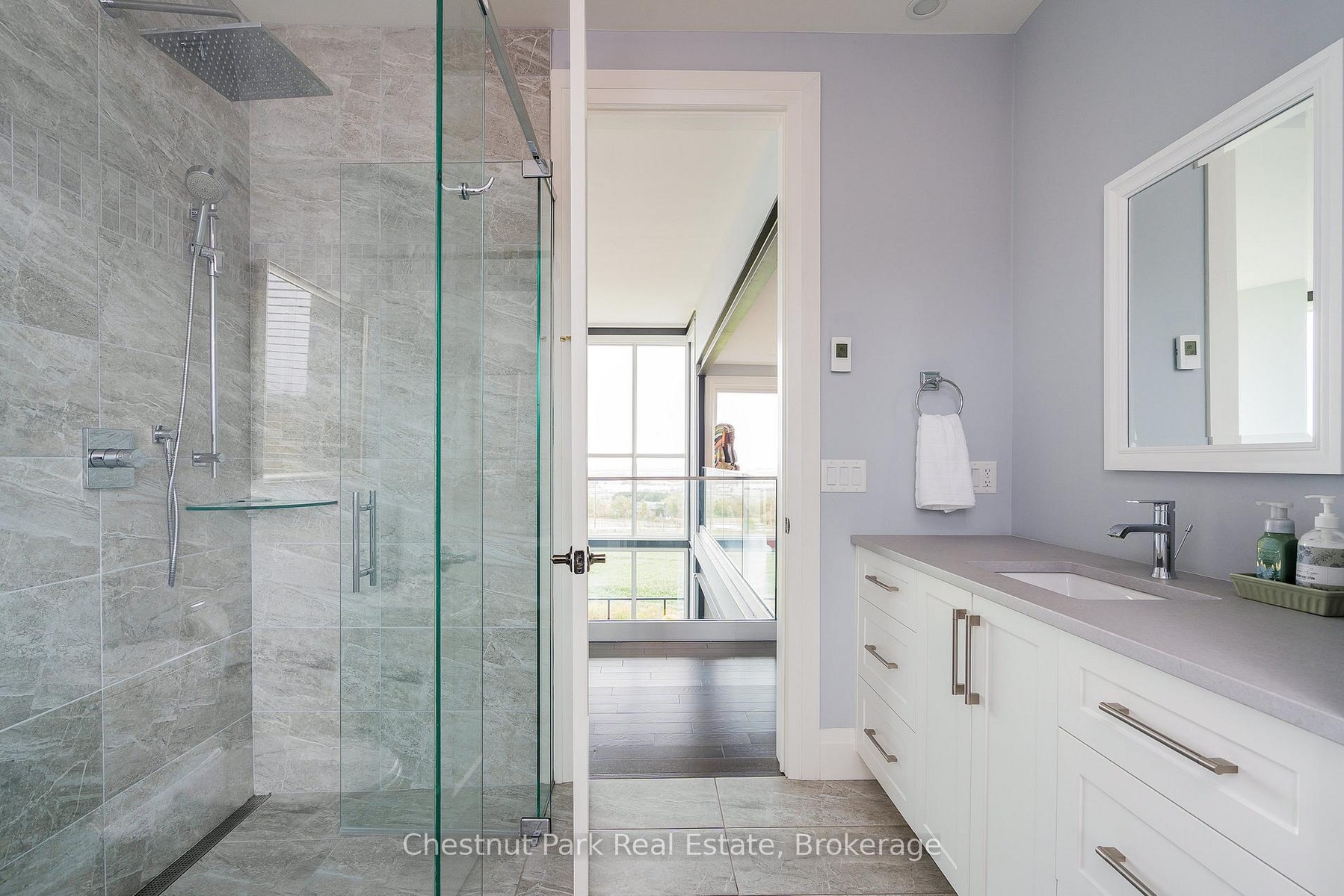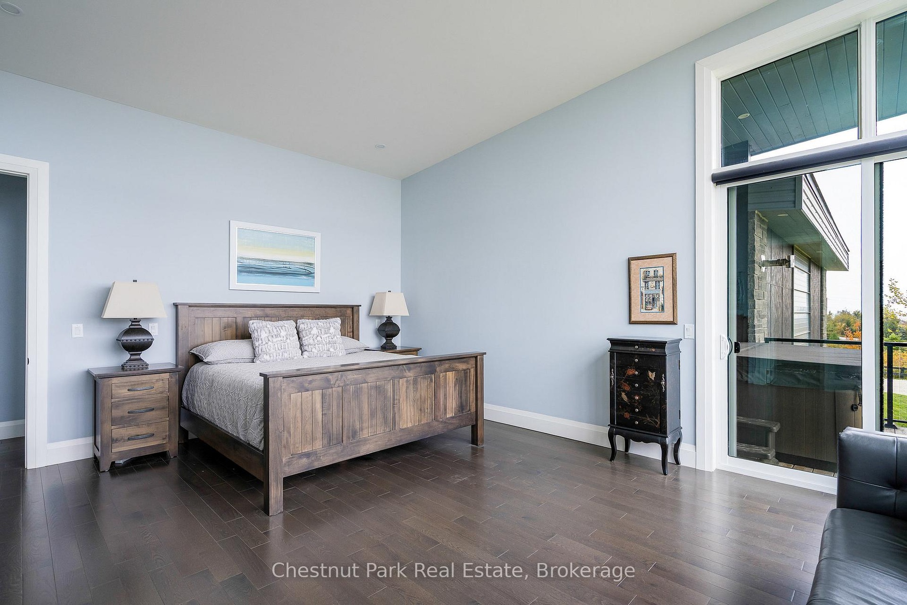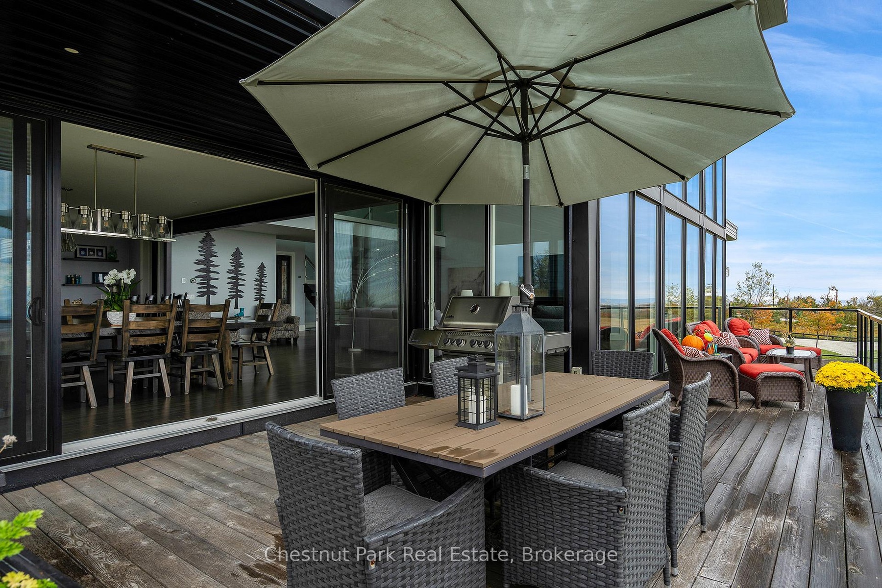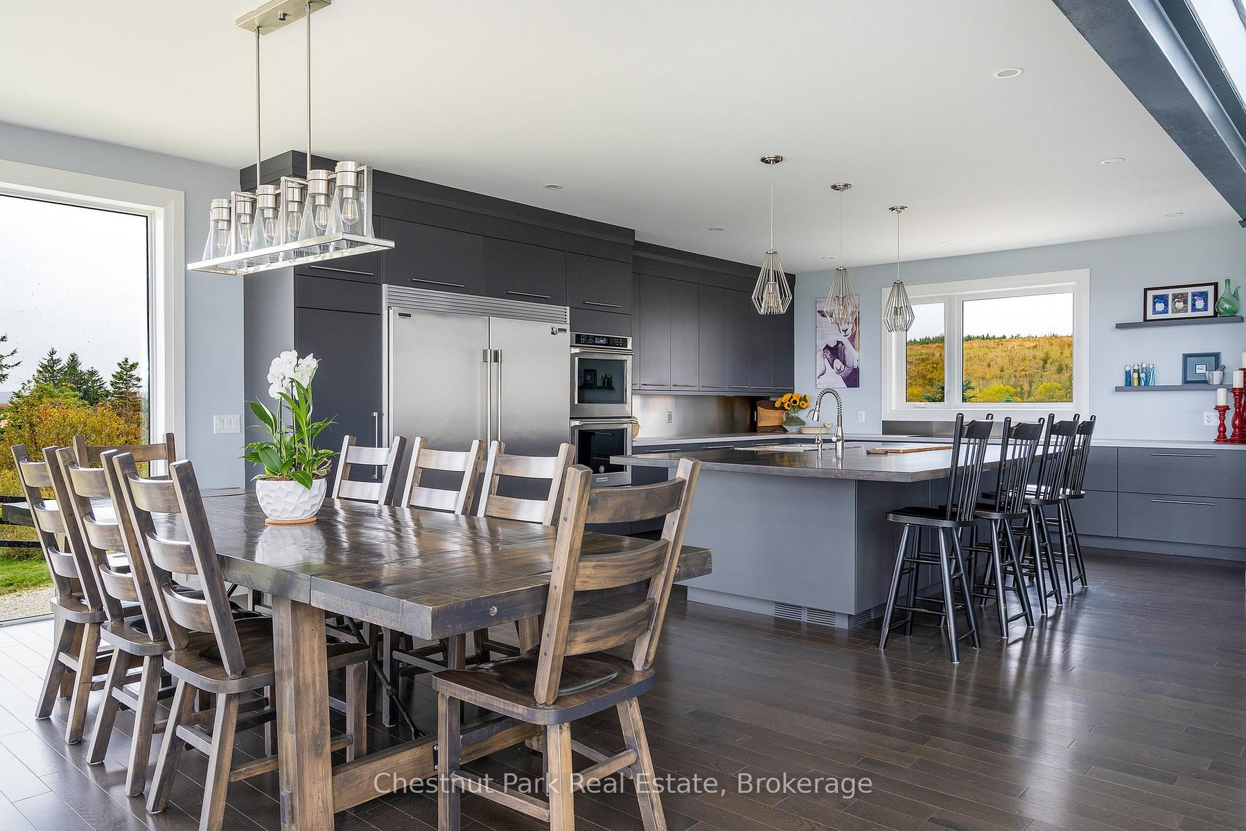 Architectural glass, steel, and panoramic views define this modern masterpiece overlooking the village of Creemore. Built in 2019 and set on 1.4 acres, this 4-bedroom, 3-bath home offers approximately 4,000 sq. ft. of finished living space with 180-degree vistas over the Creemore Hills, reaching to Alliston and Barrie. The striking design features steel beams, opposing rooflines, and floor-to-ceiling Dashwood windows that flood the interiors with light and frame the valley's ever-changing skies-from golden sunsets to the incredible canopy of stars above. Elevated above the village and free from city glow, this is a stargazer's dream home, where the night sky feels within reach through expansive glass walls. The chef's kitchen includes Cabneato custom cabinetry, quartz countertops, a 6'x10' wormy maple island, KitchenAid double ovens, 5-burner cooktop, and a 54" Frigidaire Professional fridge/freezer. A butler's pantry adds additional prep and storage space. Dark maple hardwood floors, designer lighting, and heated tile baths bring warmth to the modern aesthetic. The insulated, metal-lined four-car garage with gas heat, insulated doors, and hot/cold water is ideal for collectors. Durable Hardie board exterior and a solid drilled well ensure low-maintenance, worry-free living. Importantly, both this property and the adjacent 1.82-acre lot (available separately) are not subject to NEC or NVCA regulation, allowing for future additions like a pool, tennis court, or guest house with far fewer approvals required. Just minutes from Creemore's shops and restaurants, and 15 minutes to Collingwood, Devil's Glen, and Mad River Golf Club. A rare combination of architecture, freedom, and breathtaking views.