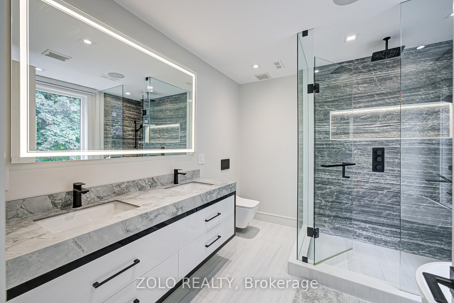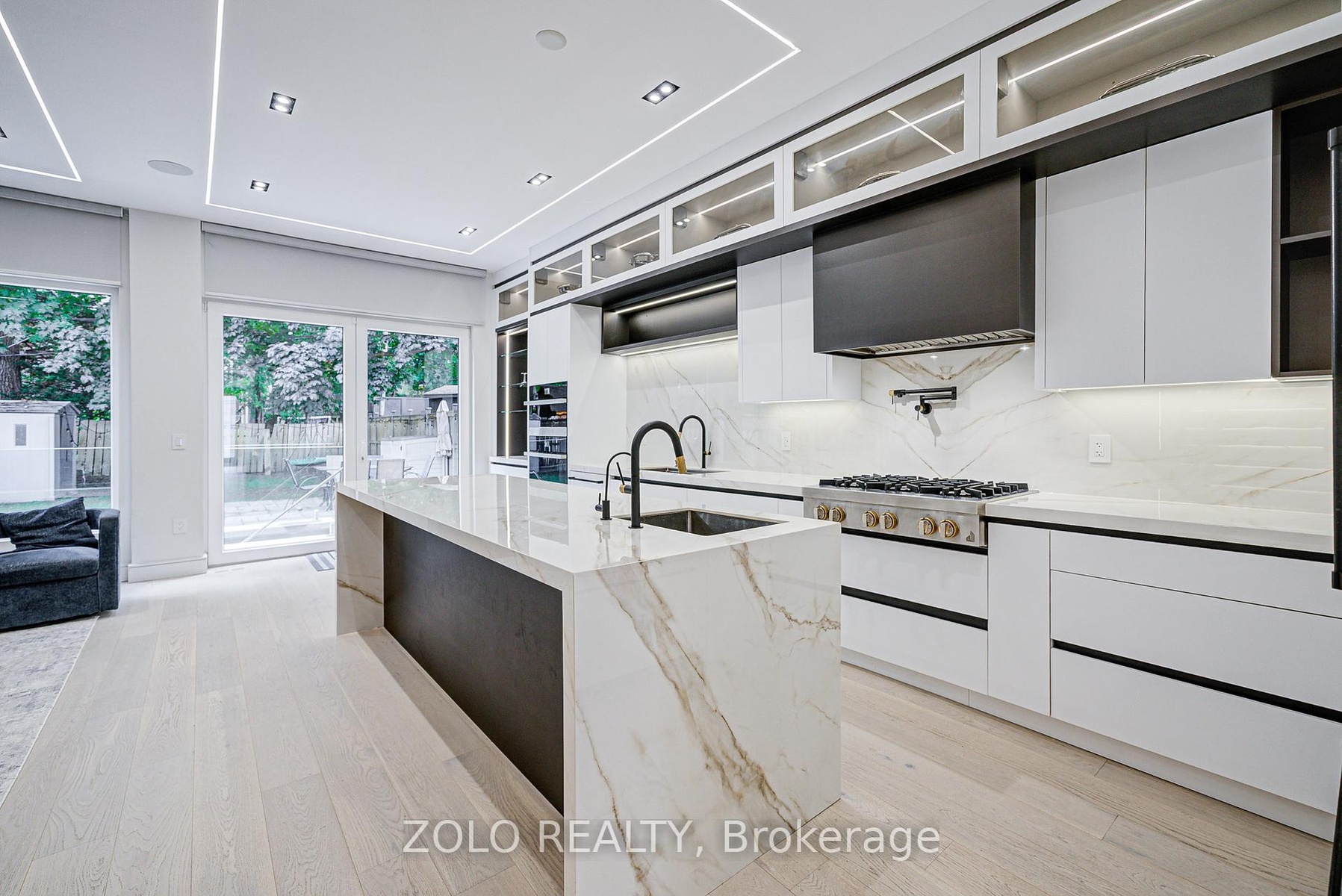 Spectacular Cedarvale Residence. A rare offering of modern sophistication and timeless elegance in one of Torontos most coveted neighbourhoods. This expansive 3-storey family home with a private elevator serving all four levels offers over 4,600 sq.ft. of luxurious living space (3,250 sq.ft. above grade + finished lower level), designed with meticulous attention to detail.The main floor features soaring 10-ft ceilings, an airy open-concept living/dining space, and a gourmet chefs kitchen with a large centre island, retractable breakfast table, and walk-out to the backyard. The family room is anchored by a stately gas fireplace and custom built-ins, framed by oversized windows overlooking greenery.Upstairs, the second floor includes three spacious bedrooms, a sleek home office with glass doors, a practical laundry room, and furnace room for comfort and efficiency. The third floor retreat is magazine-worthy: an entire level dedicated to the primary suite (or a private space for teens/in-laws) featuring a stunning ensuite, oversized walk-in closet, sitting/make up area with mini-bar, and a balcony with green and skyline views.The lower level extends the living space with a full kitchen, guest/nanny suite, 3-pc washroom, additional laundry, radiant in-floor heating (roughed-in), and a walk-out to the backyard ideal for gatherings or multi-generational living. Front and backyard landscaping finishes are left for future buyers to customize!