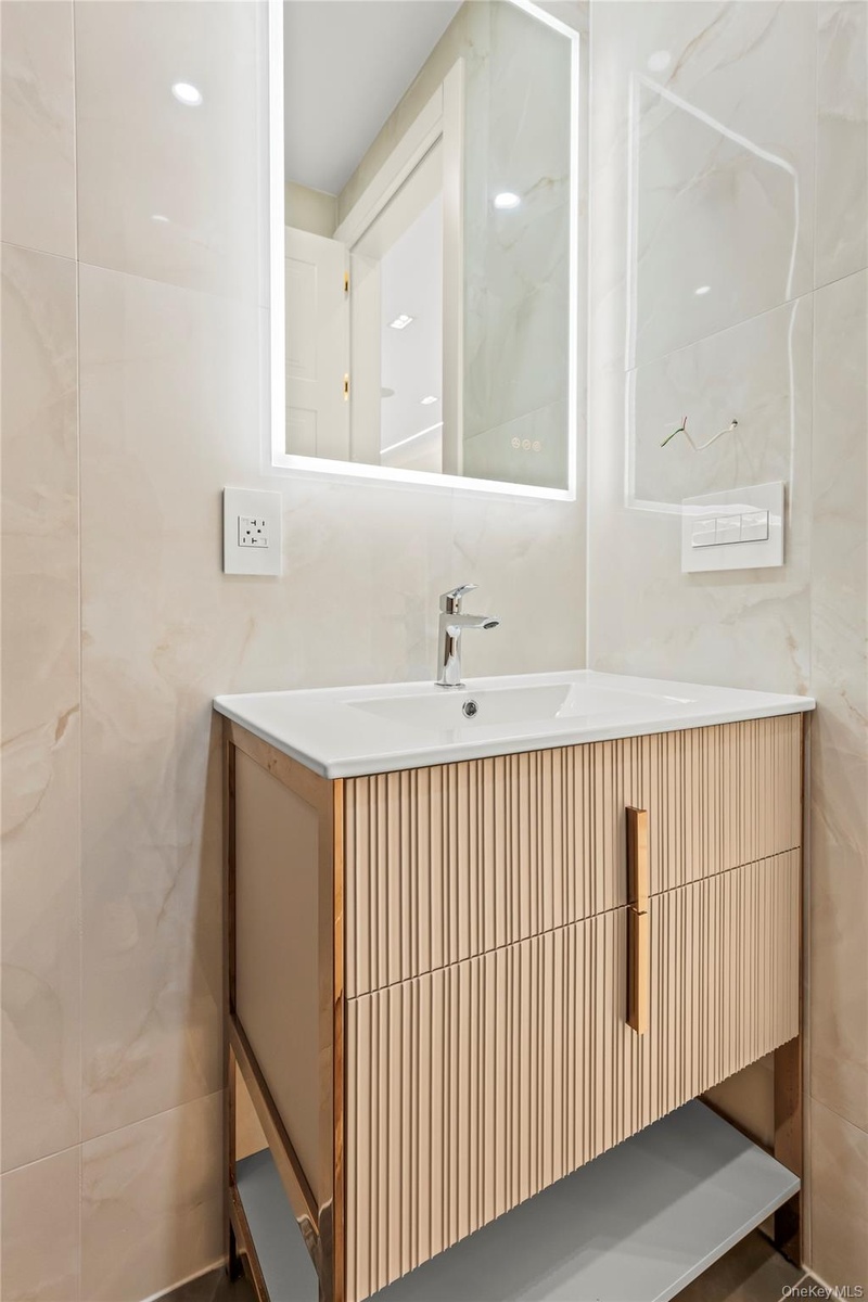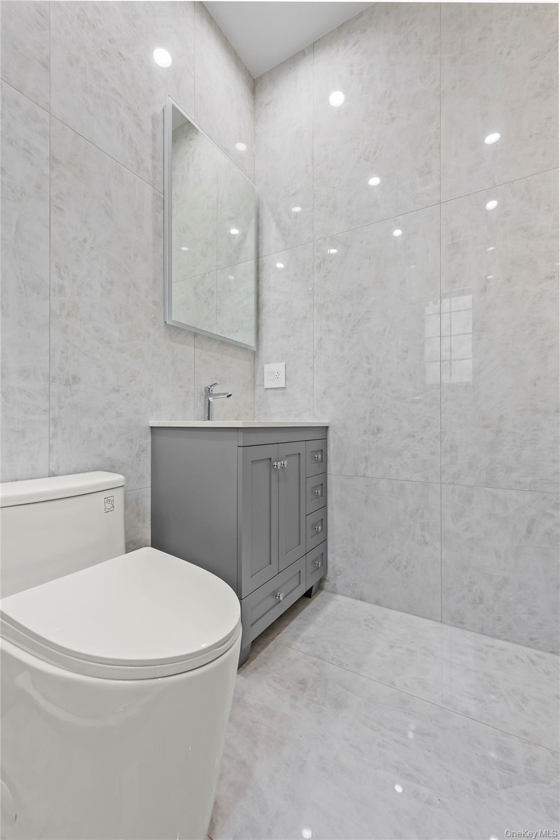 - Full bathroom featuring light marble finish flooring, tile walls, vanity, a marble finish shower, and recessed lighting