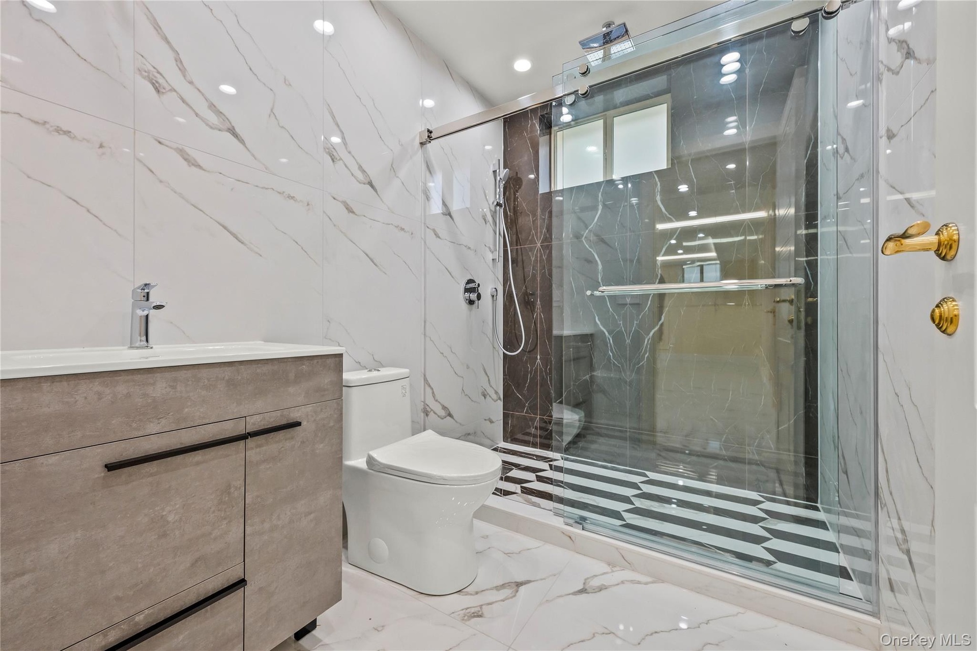 - Bathroom featuring vanity, marble tiled flooring, a marble finish shower, stone wall, and recessed lighting